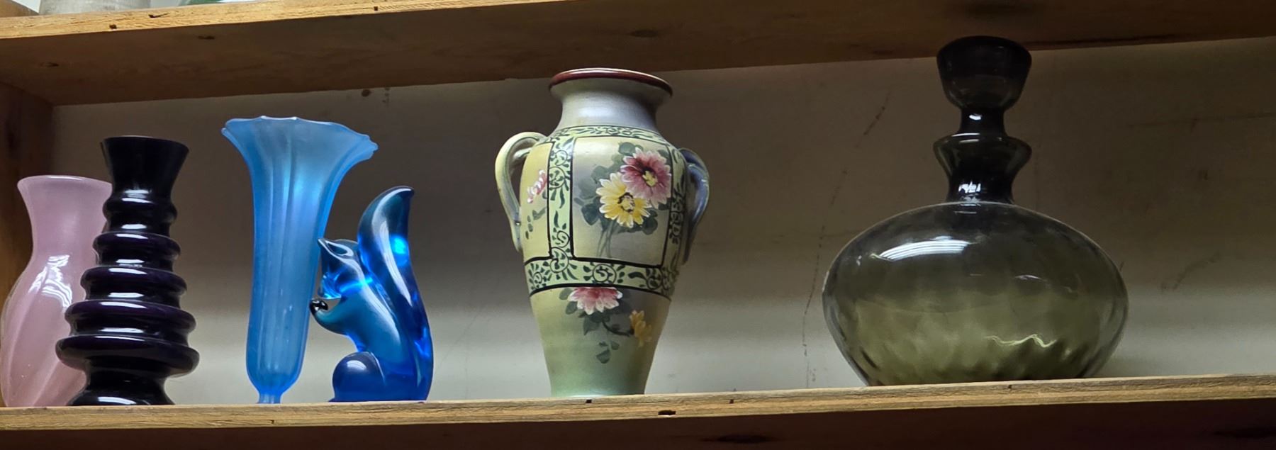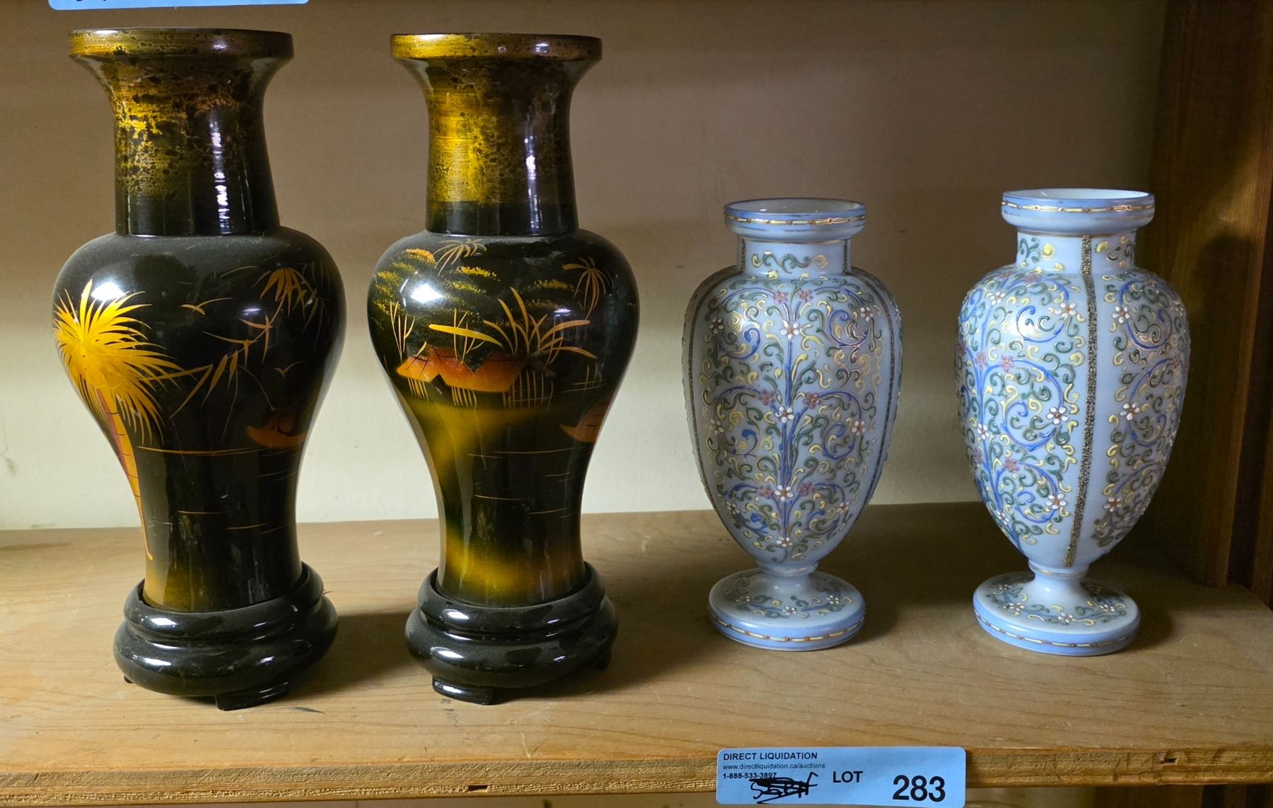 Two sets of antique vases, one set hand painted, one set Vietnam wood painted