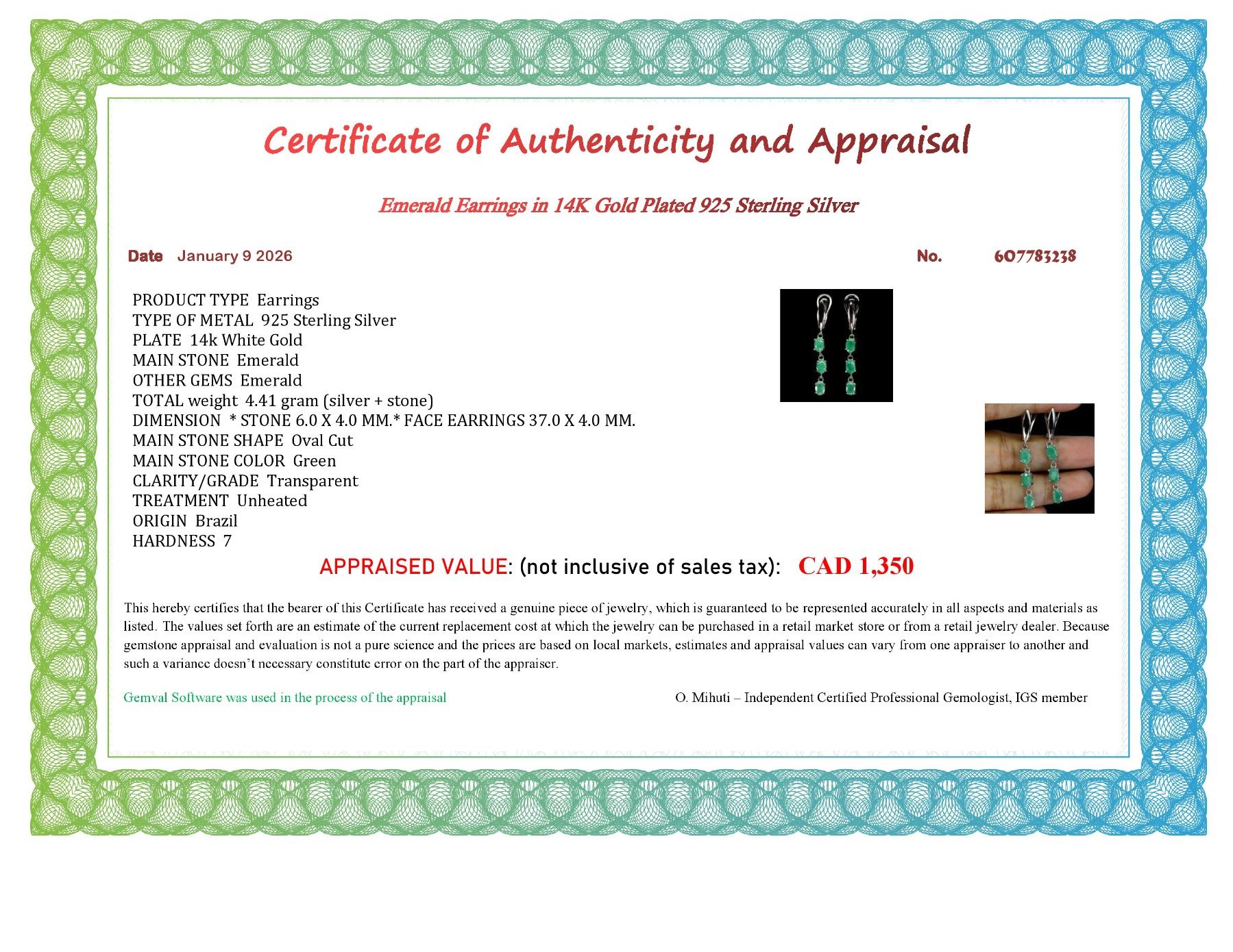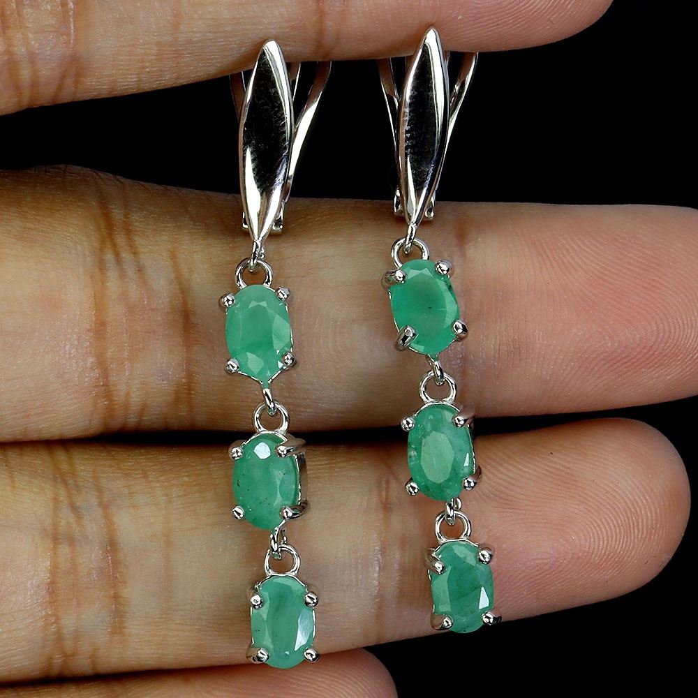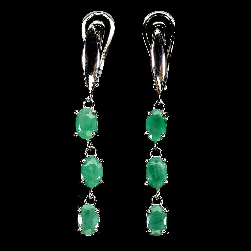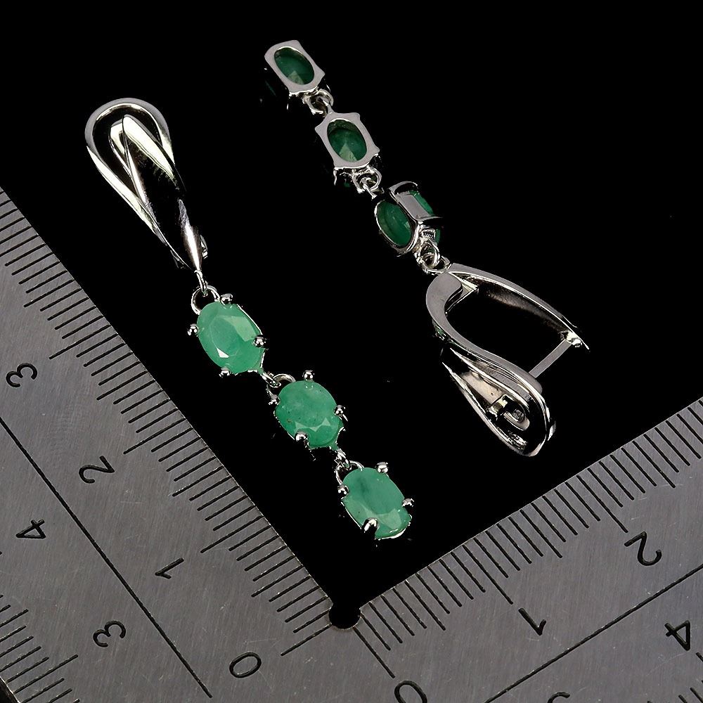 UNIQUE HIGH VALUE EMERALD EARRINGS IN 14K WHITE PLATED GOLD OVER 925 STERLING SILVER - 6.7 INCHES - APPRAISED REPLACEMENT VALUE CAD 1,350