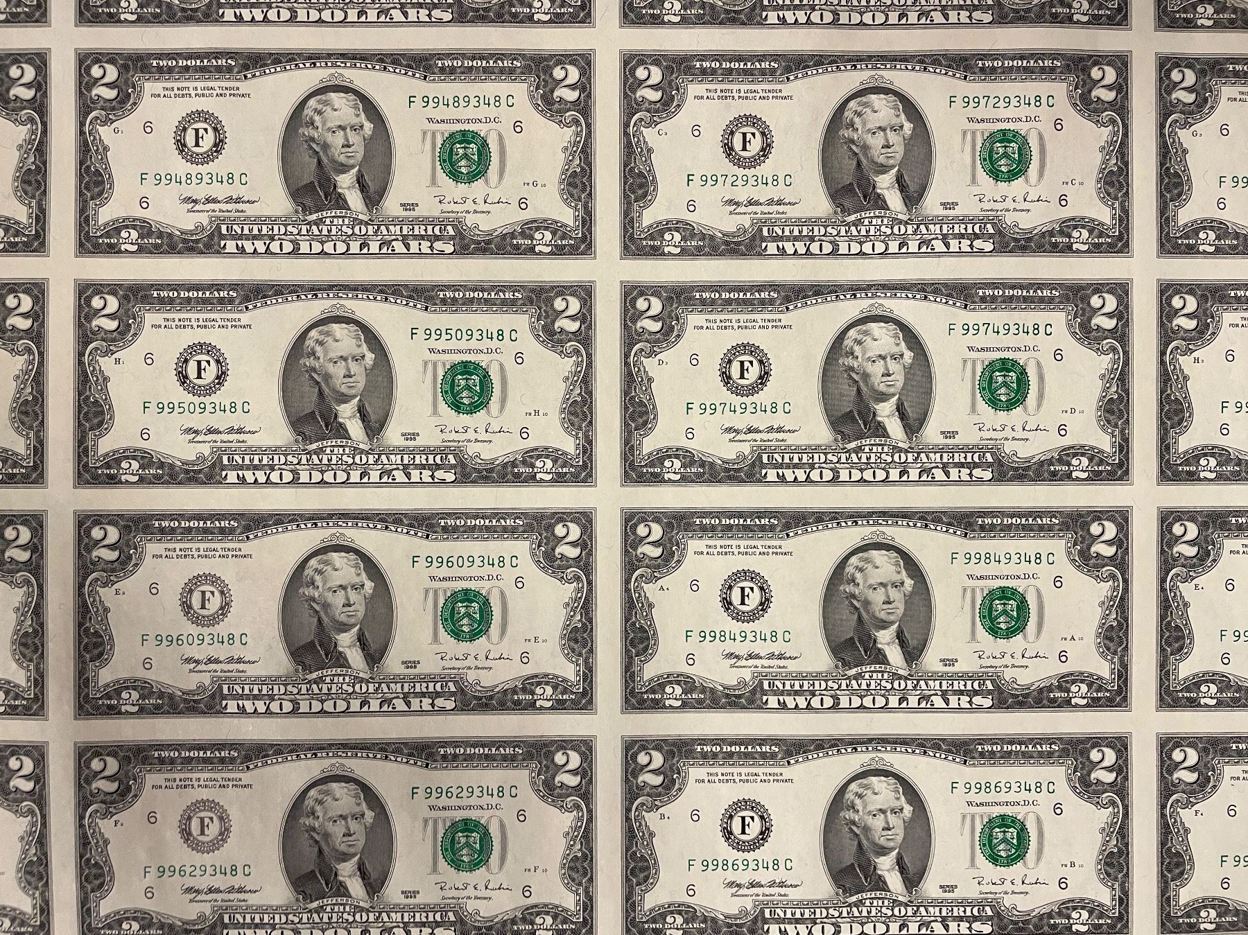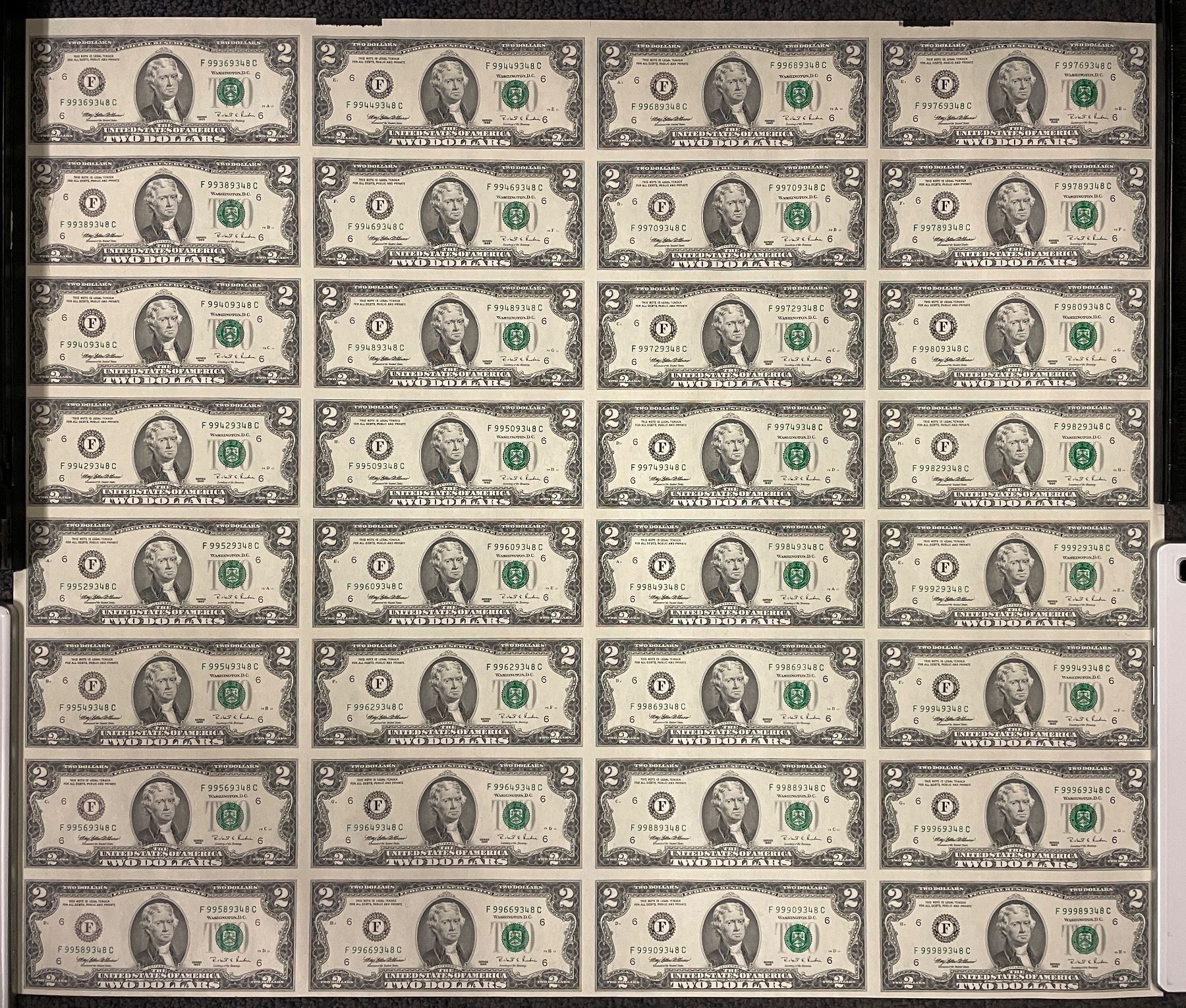 Uncut Sheet of 32 USA 1995 Two Dollar Bills - F Prefix Serial Numbers - In protective tube