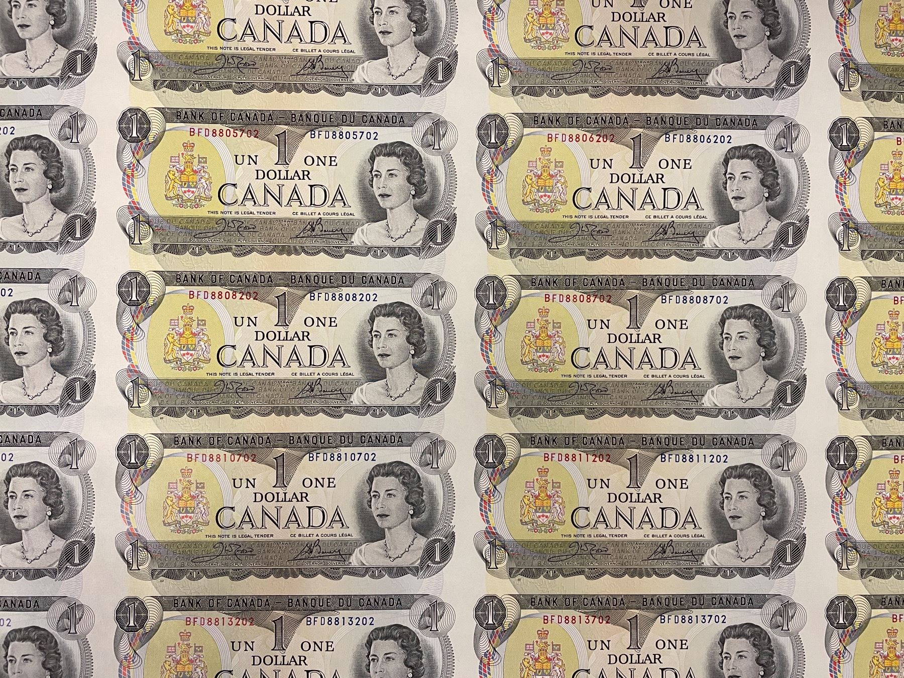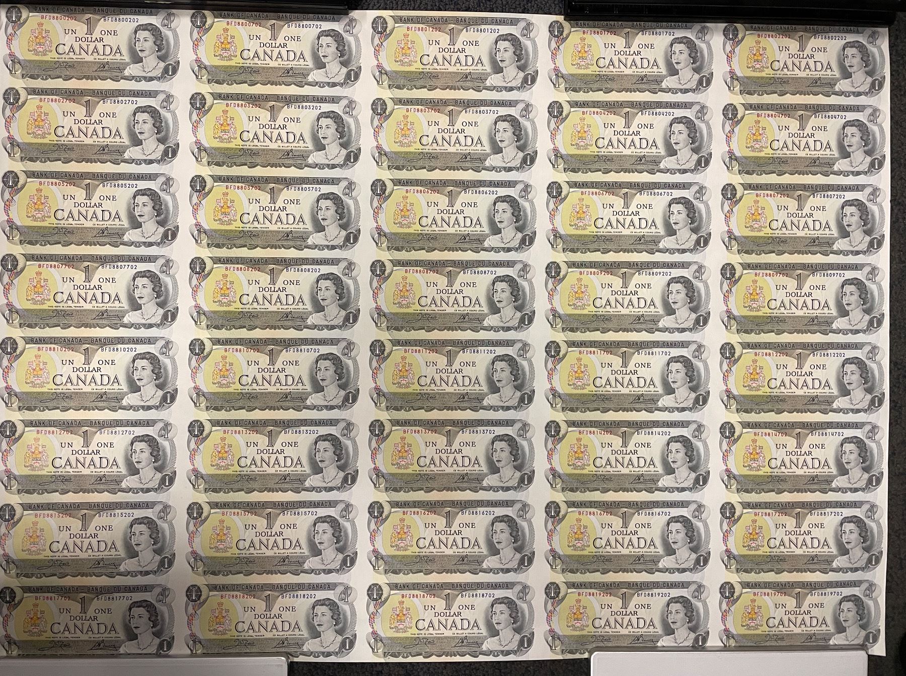 Uncut Sheet of 40 Canadian 1973 One Dollar Bills - BFD Prefix Serial Numbers - In protective tube