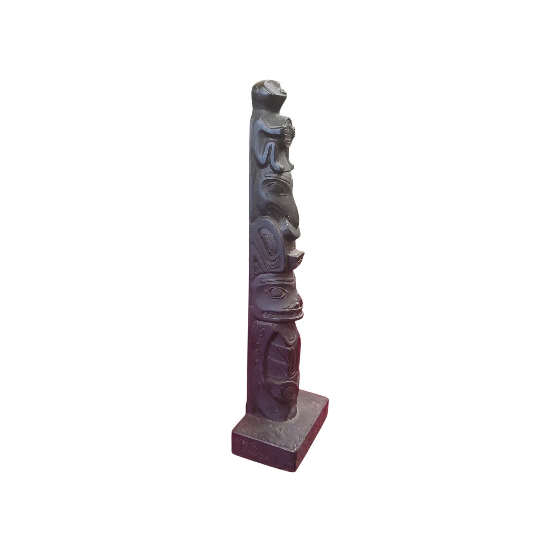 Hand-carved First Nations totem pole crafted by Boma, representing Pacific Northwest indigenous artistry. Measures 8-Inch tall, showcasing detailed traditional iconography. Item is as pictured.