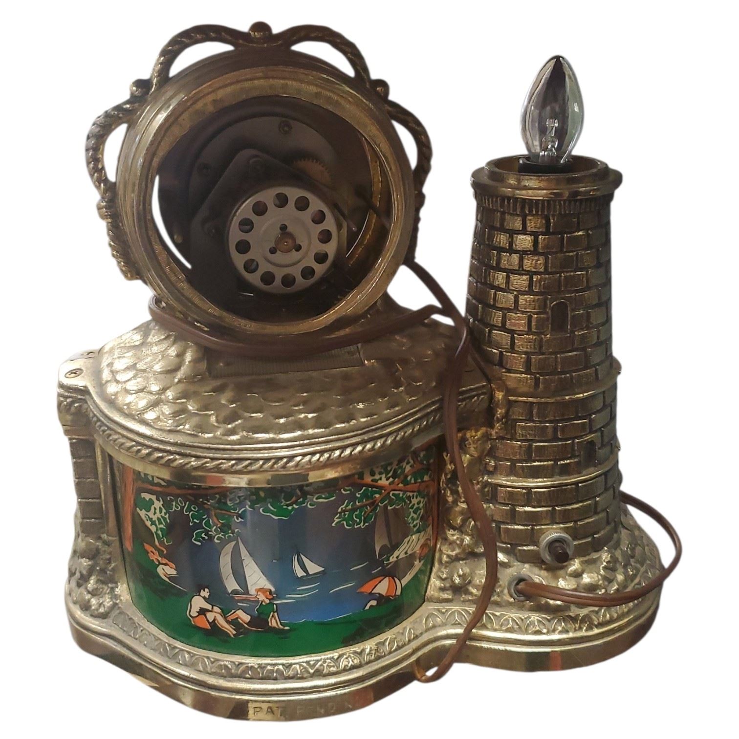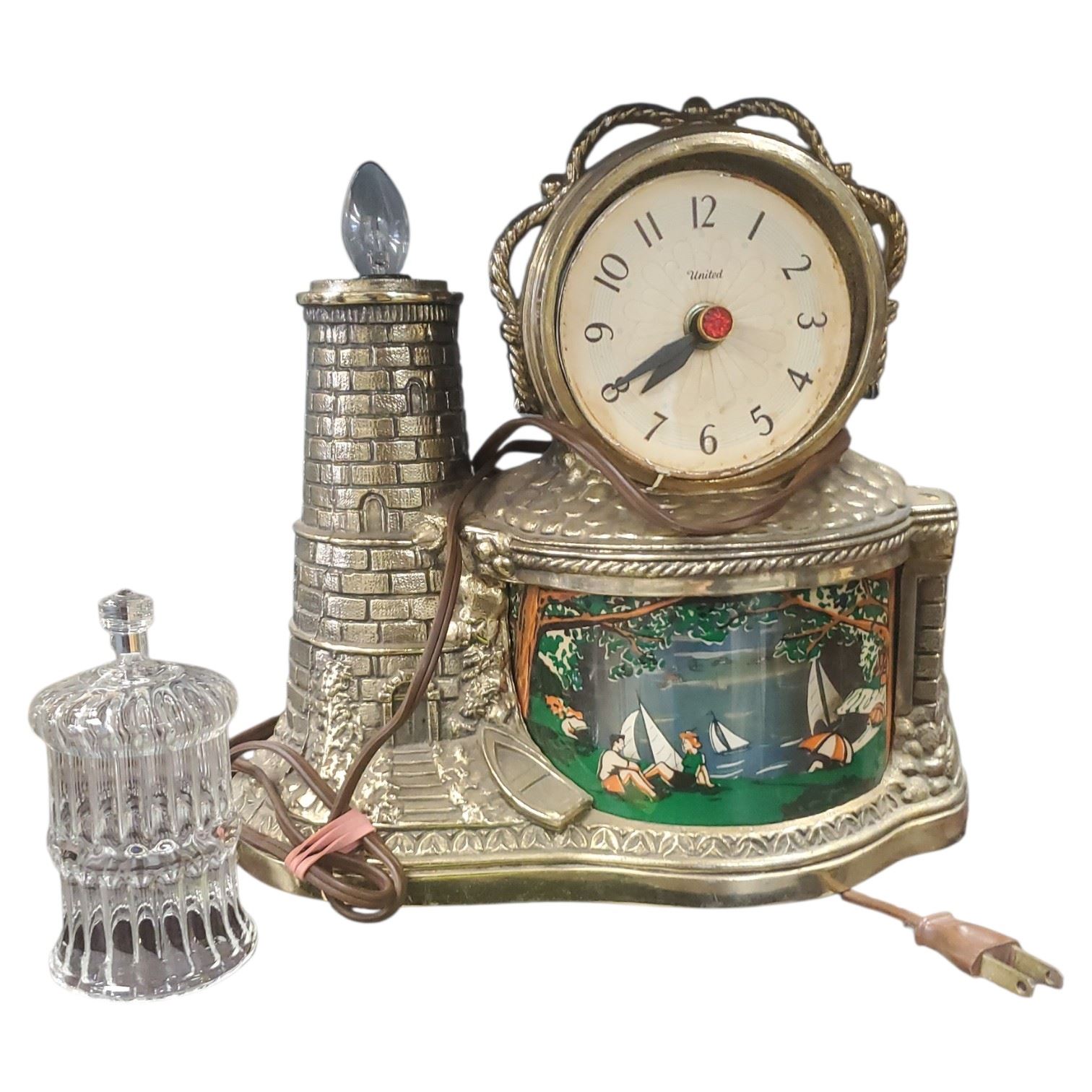 United Clock Corporation Lighthouse Motion Clock circa 1950s. Features lighthouse-themed design with motion feature. Manufactured in Brooklyn, New York. Electric movement requires repair. Item is as pictured and reflects age-related wear.