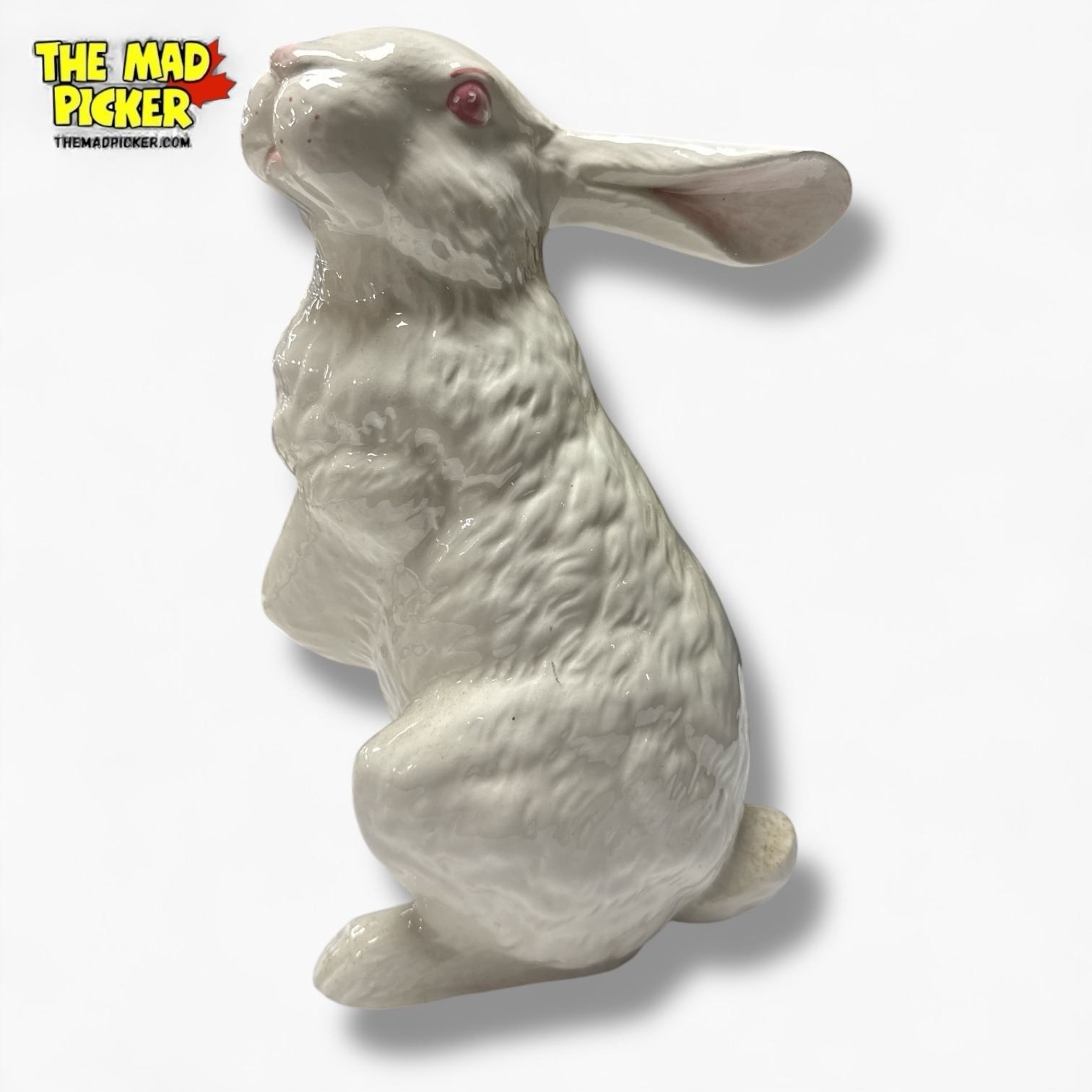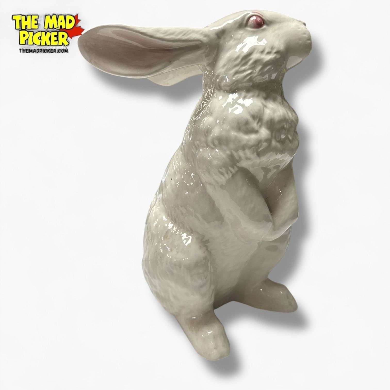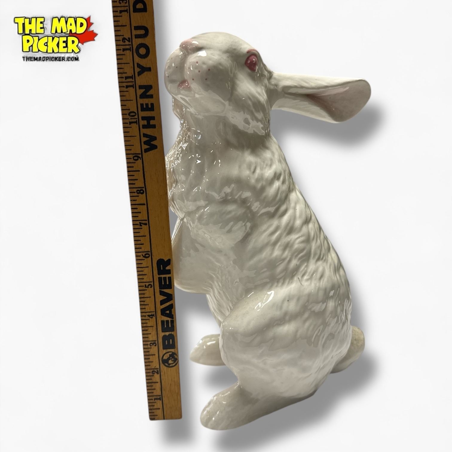 Porcelain rabbit figurine, unmarked, in white glaze. Measures approximately 13 inches tall. Likely produced in the 20th century, with detailed sculpting and smooth surface. Features standing rabbit pose with ears upright. Specific manufacturer or origin unverified.