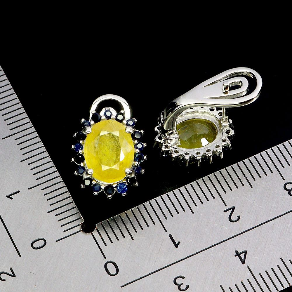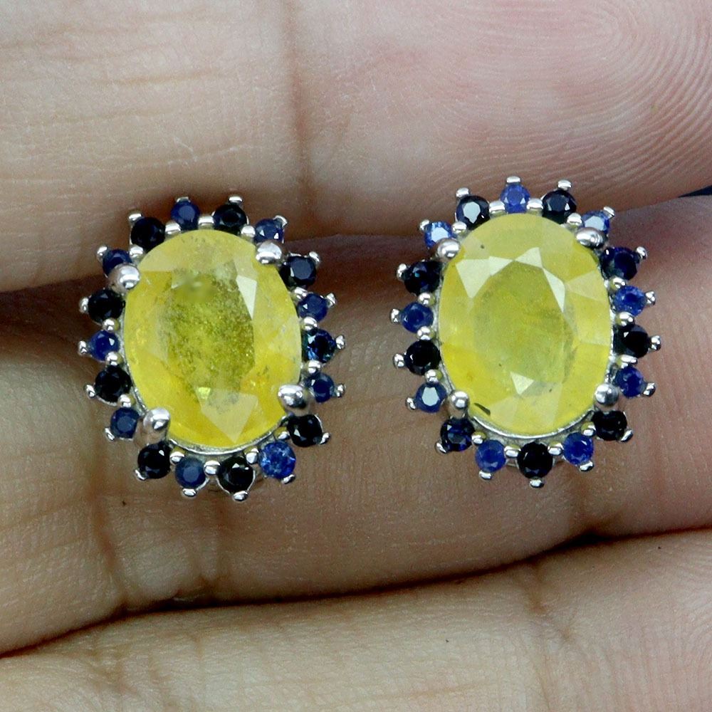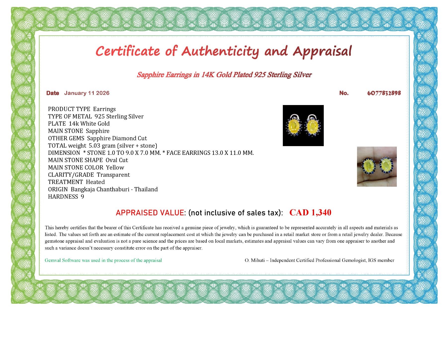 VALUABLE 9X7 mm YELLOW SAPPHIRE AND BLUE SAPPHIRE EARRINGS IN 14K WHITE GOLD PLATED OVER 925 STERLING SILVER - APPRAISED REPLACEMENT VALUE CAD 1,340