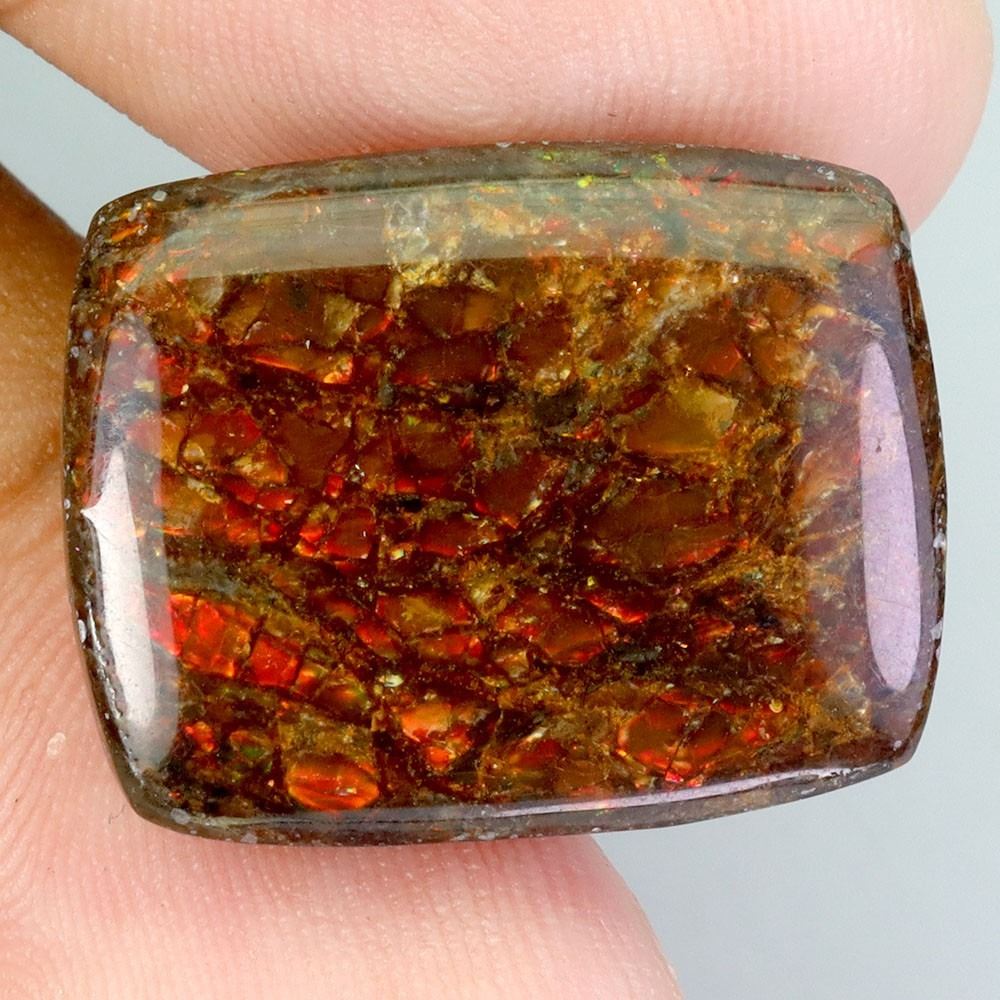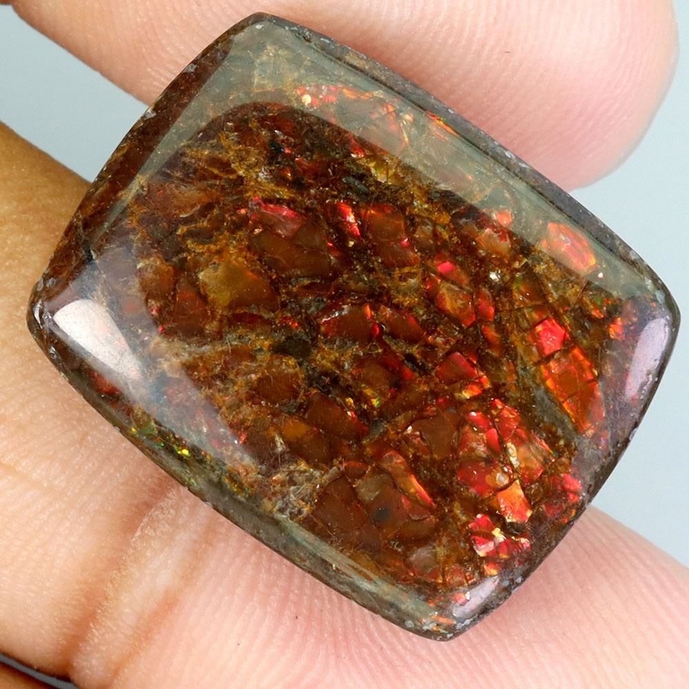 VALUABLE ANTIQUE CUT 26.72 CARATS CABOCHON NATURAL REDDISH AND RAINBOW LUSTER AMMOLITE - ALBERTA CANADA - 22X17 mm - APPRAISED REPLACEMENT VALUE CAD 3,900 (APPROX $150/CARAT) VIVID RED COLOR AND RAINBOW COLORS ARE VALUED AT OVER $ 1,000/CARAT