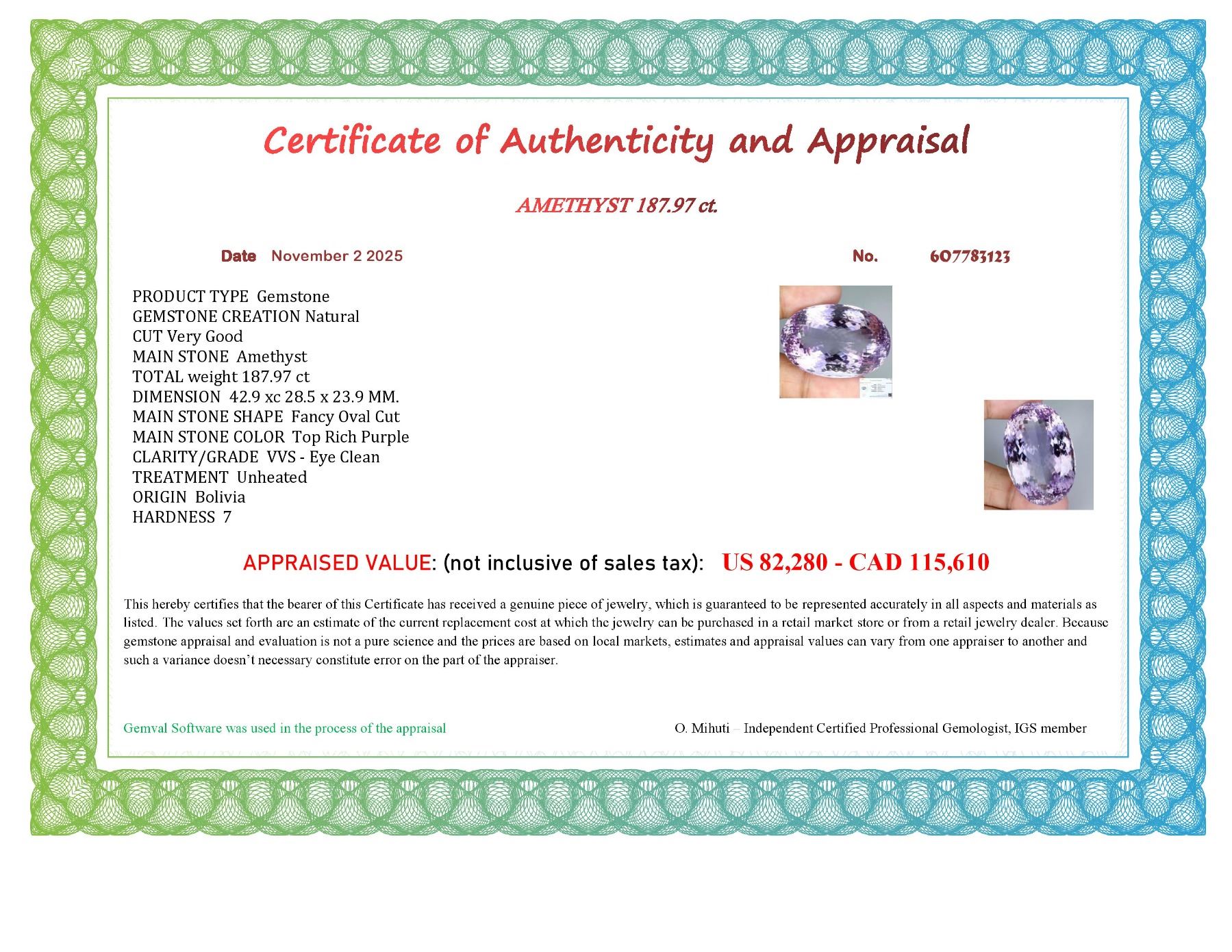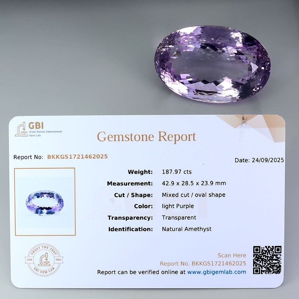 VERY RARE MUSEUM SIZE VERY CLEAN AMETHYST 187.97 CT. - Appraised value CAD 115,610