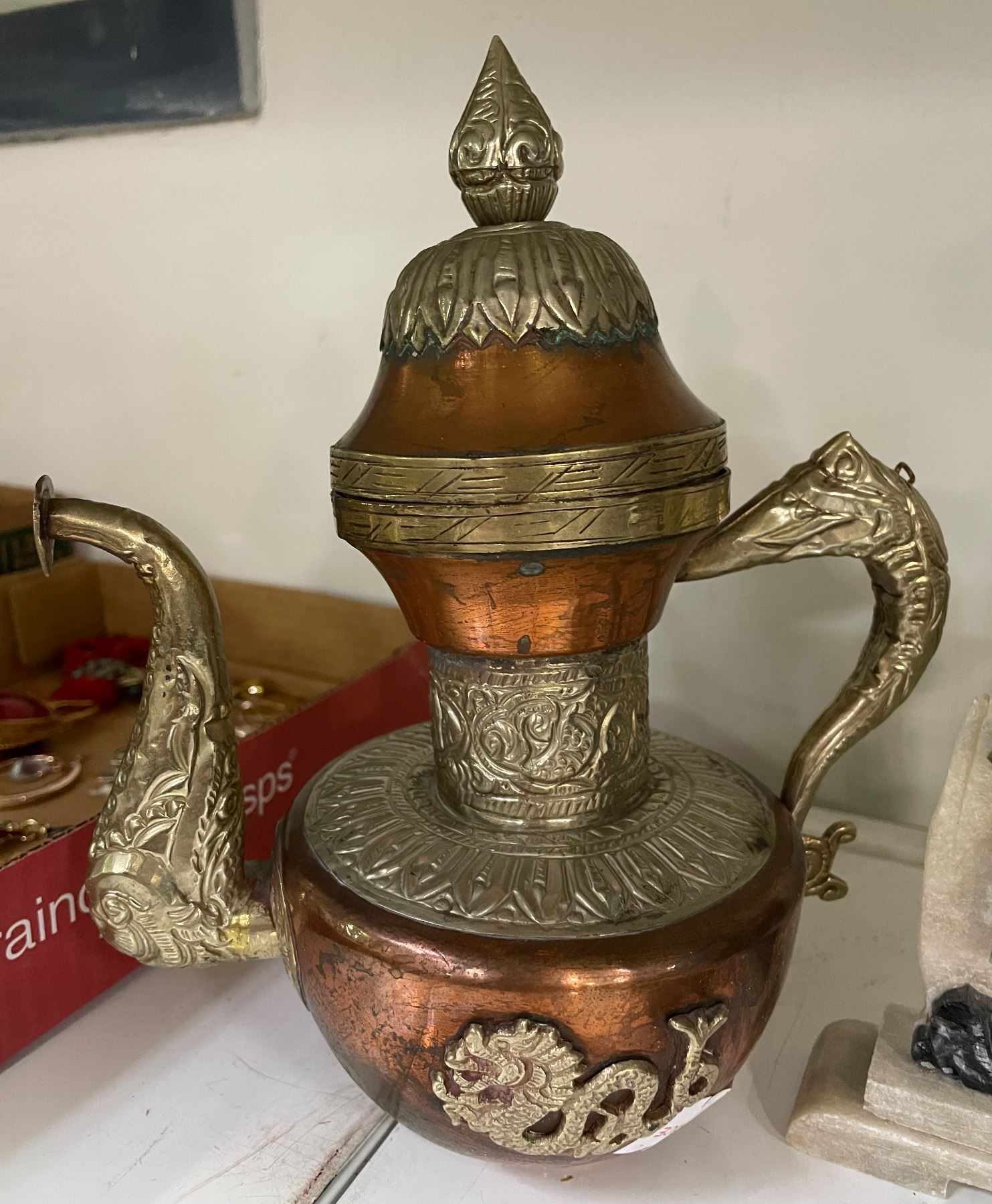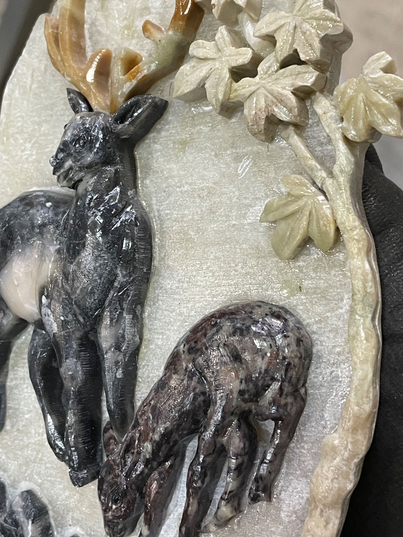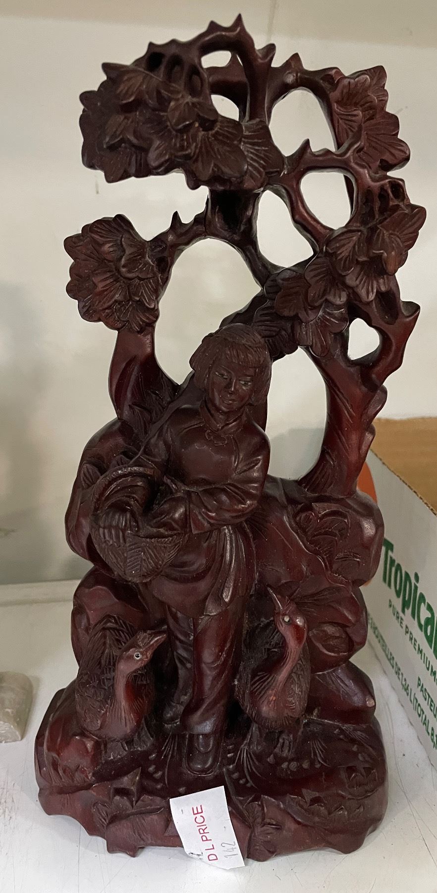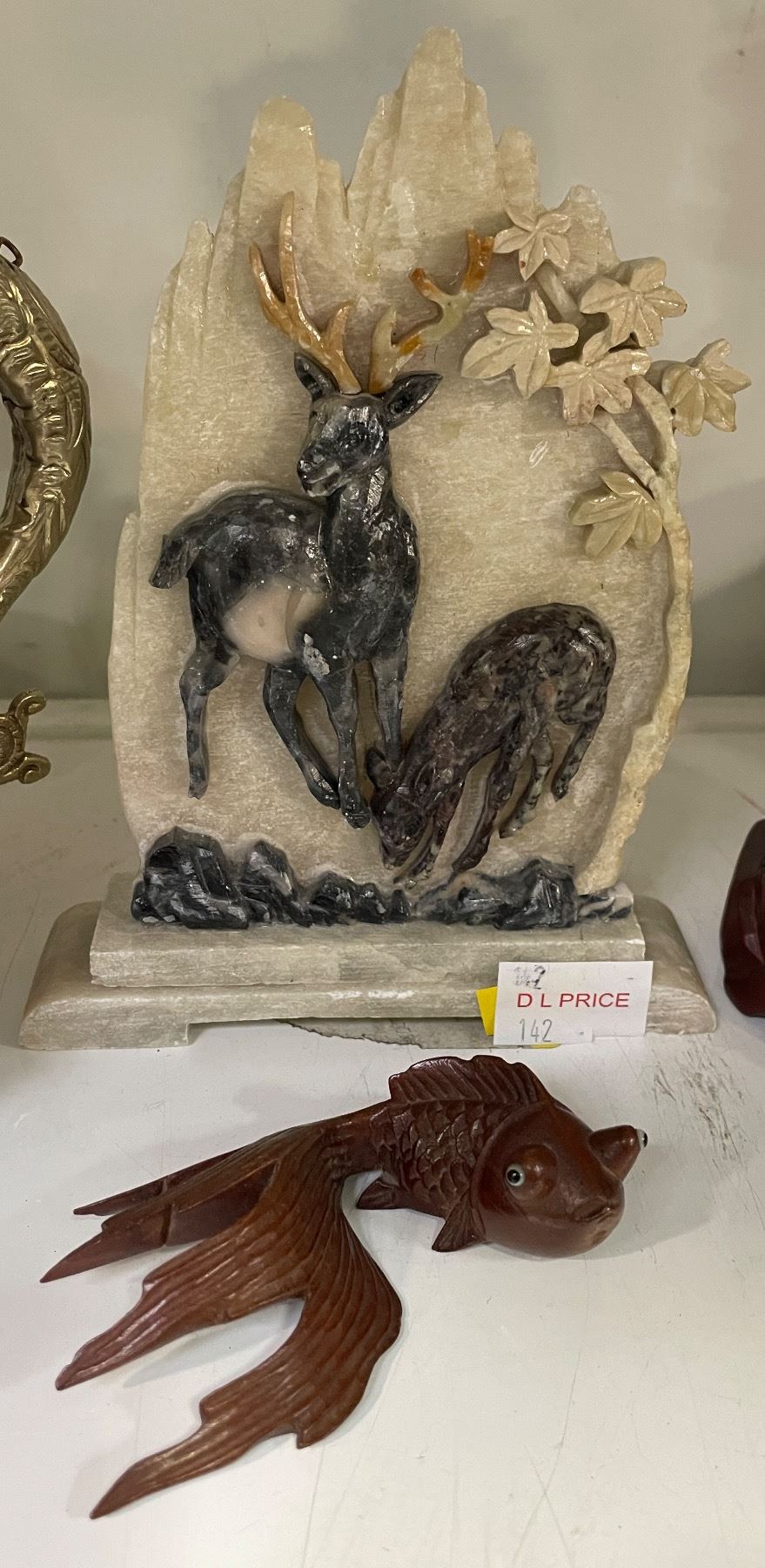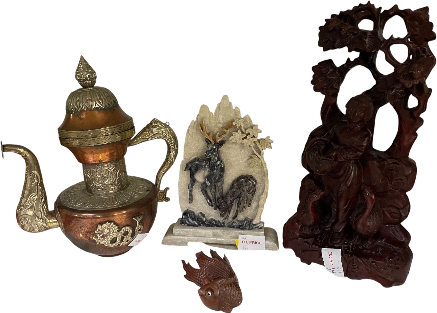 Vancouver - Group of 4-pcs Vintage Decorative items, includes Modern 11" Chinese Hand Carved Wood Firguine/ Decorative Stone Carving Deer/ Vintage Tibetan Chased Teapot & More