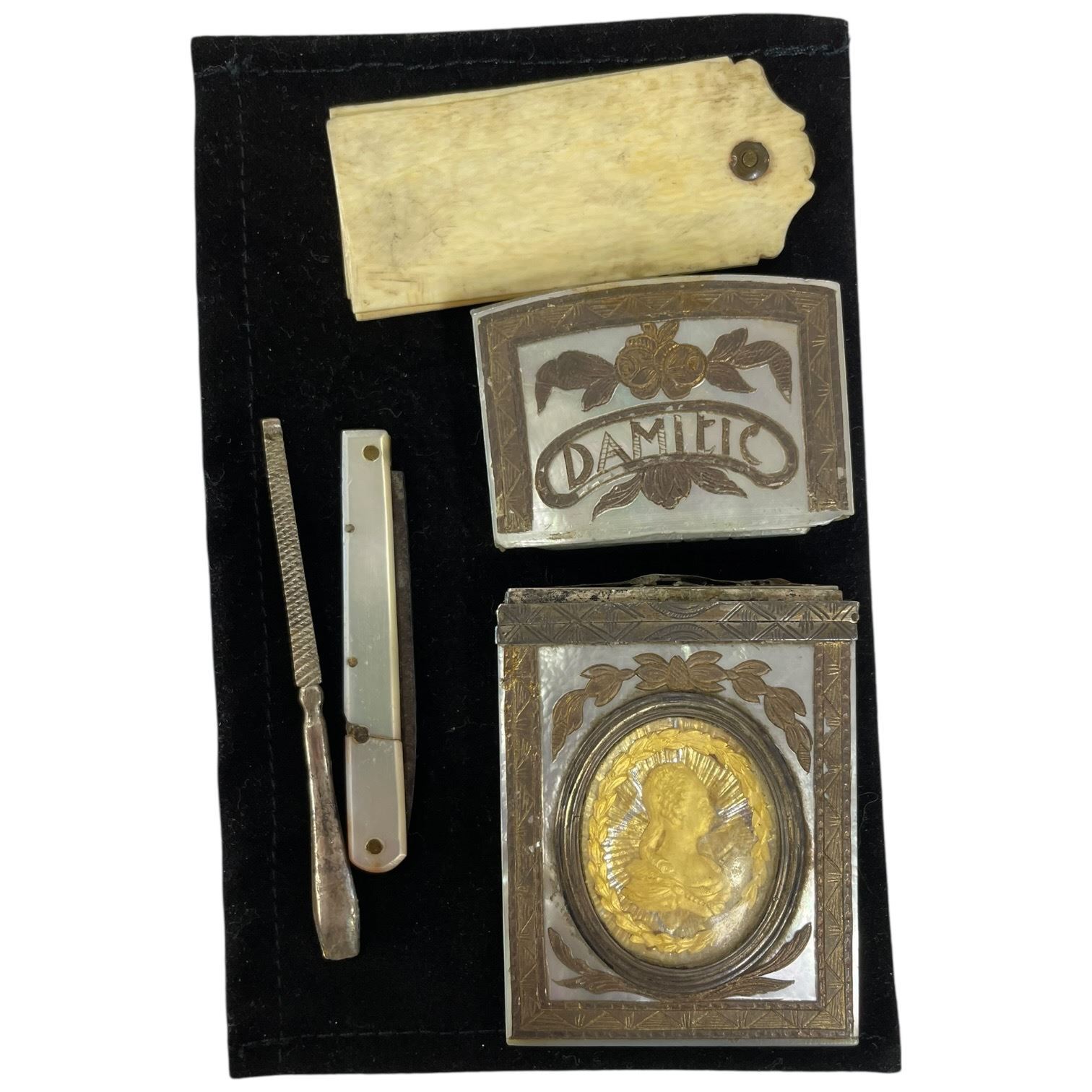Victorian Souvenir Mother of Pearl Box with Nail File & Tiny Knife (box measures 0.5" x 0.5 x3.5"tall) Damage to the lid
