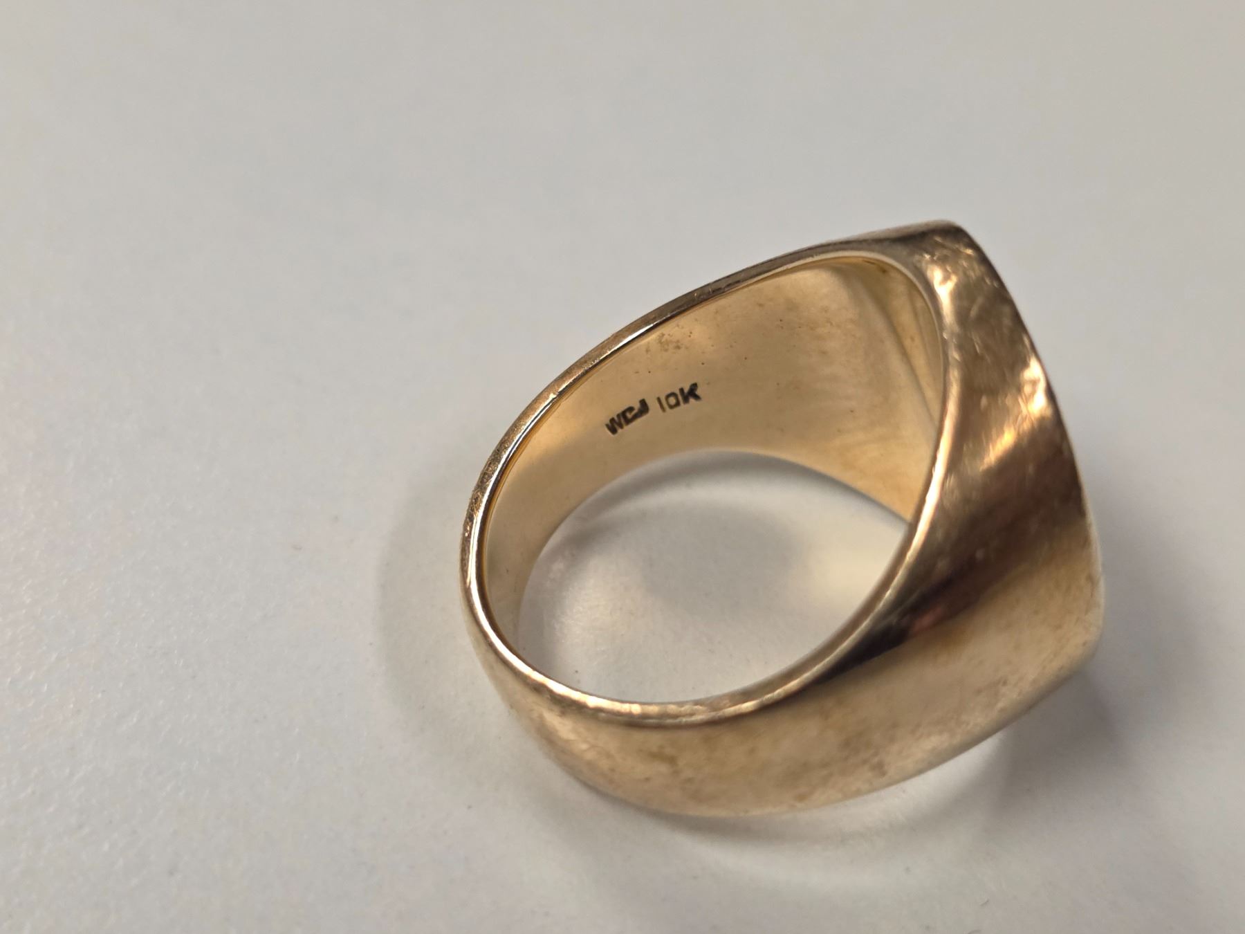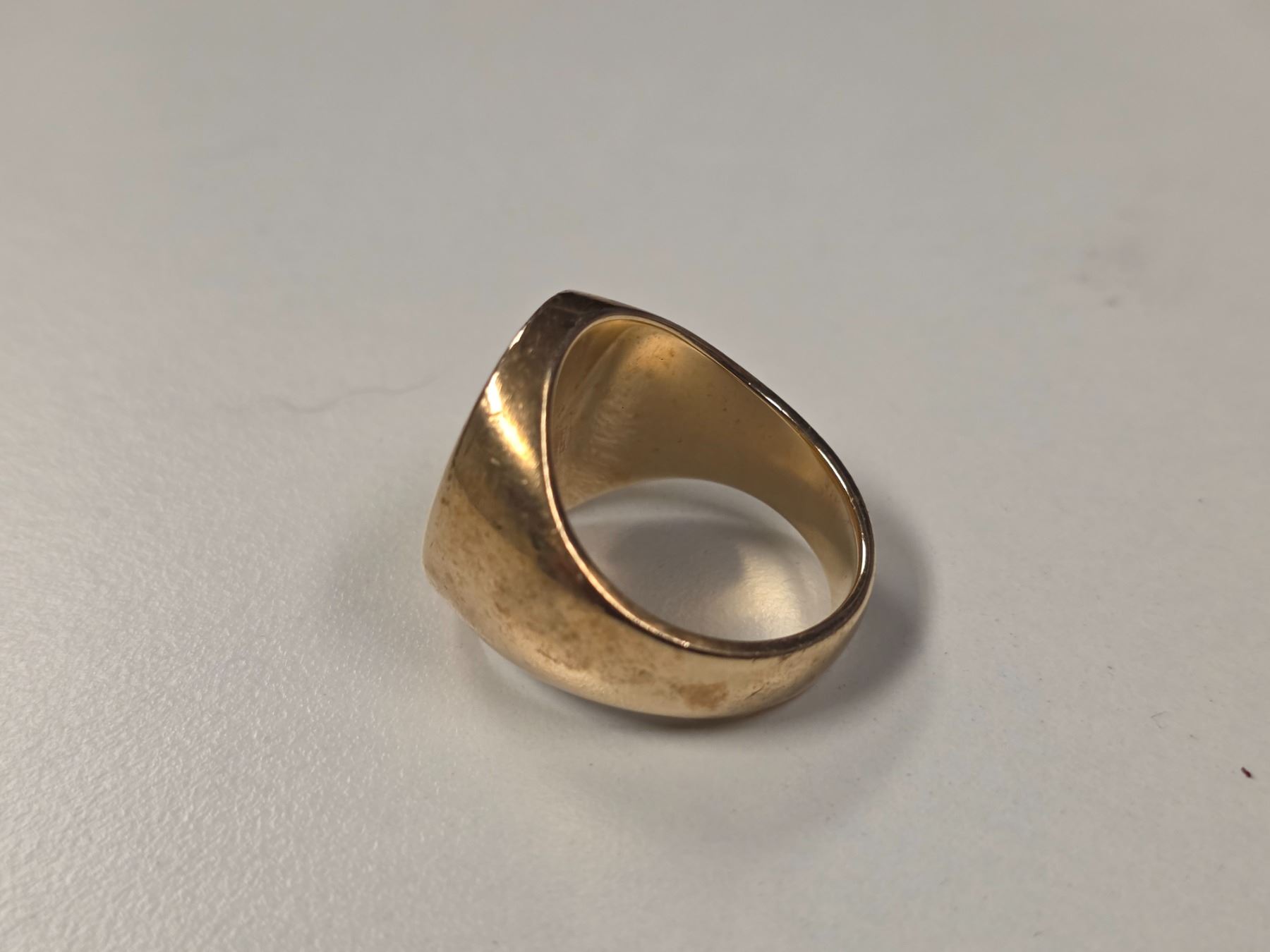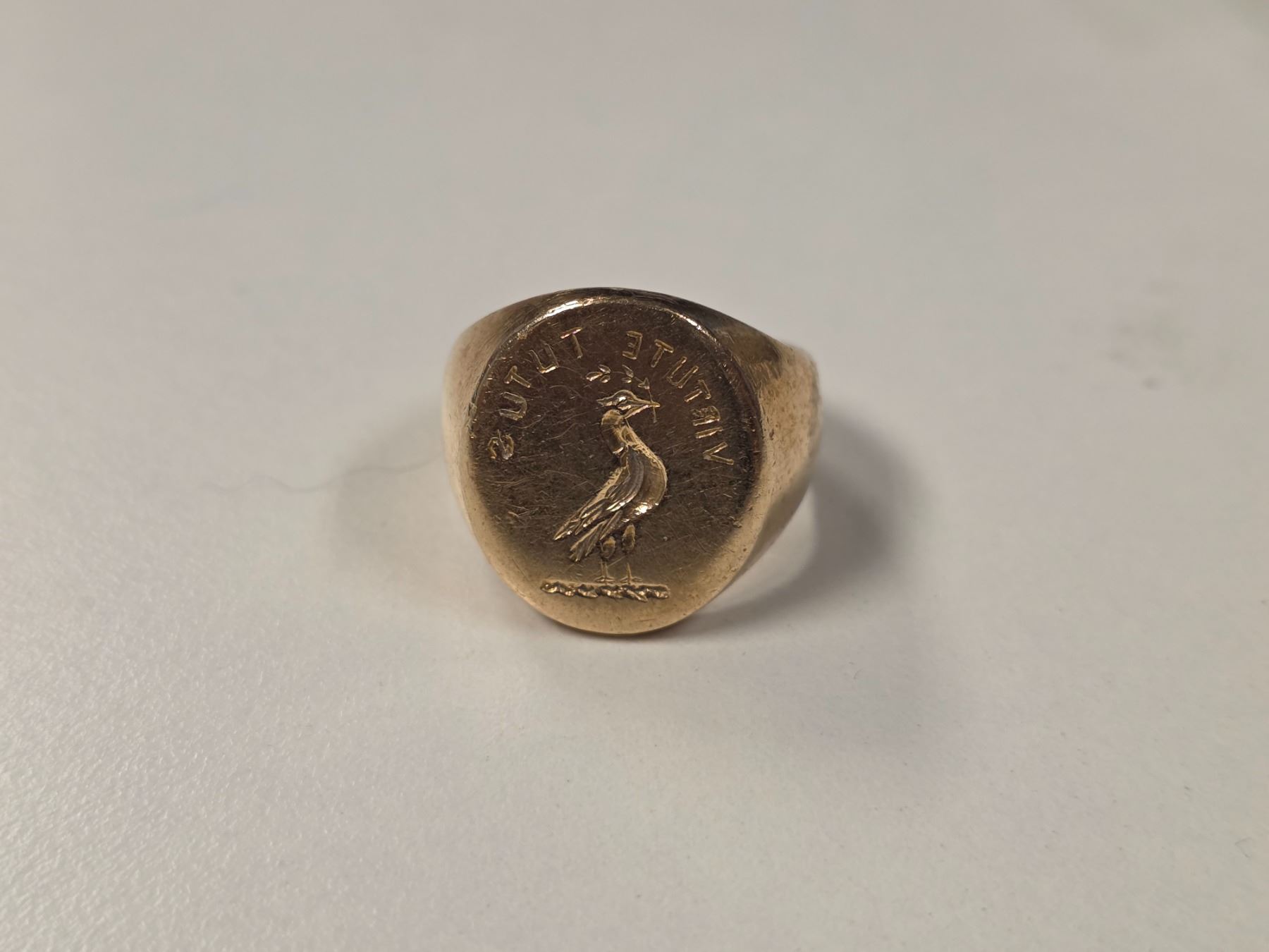 Vintage 10 KT Gold "Clan Blair of Balthayock" Signet Ring - Size 9 - Weight: 21.5 grams - Virtue Tutus & Dove with Olive Branch are reverse engraved so it can be used a seal.