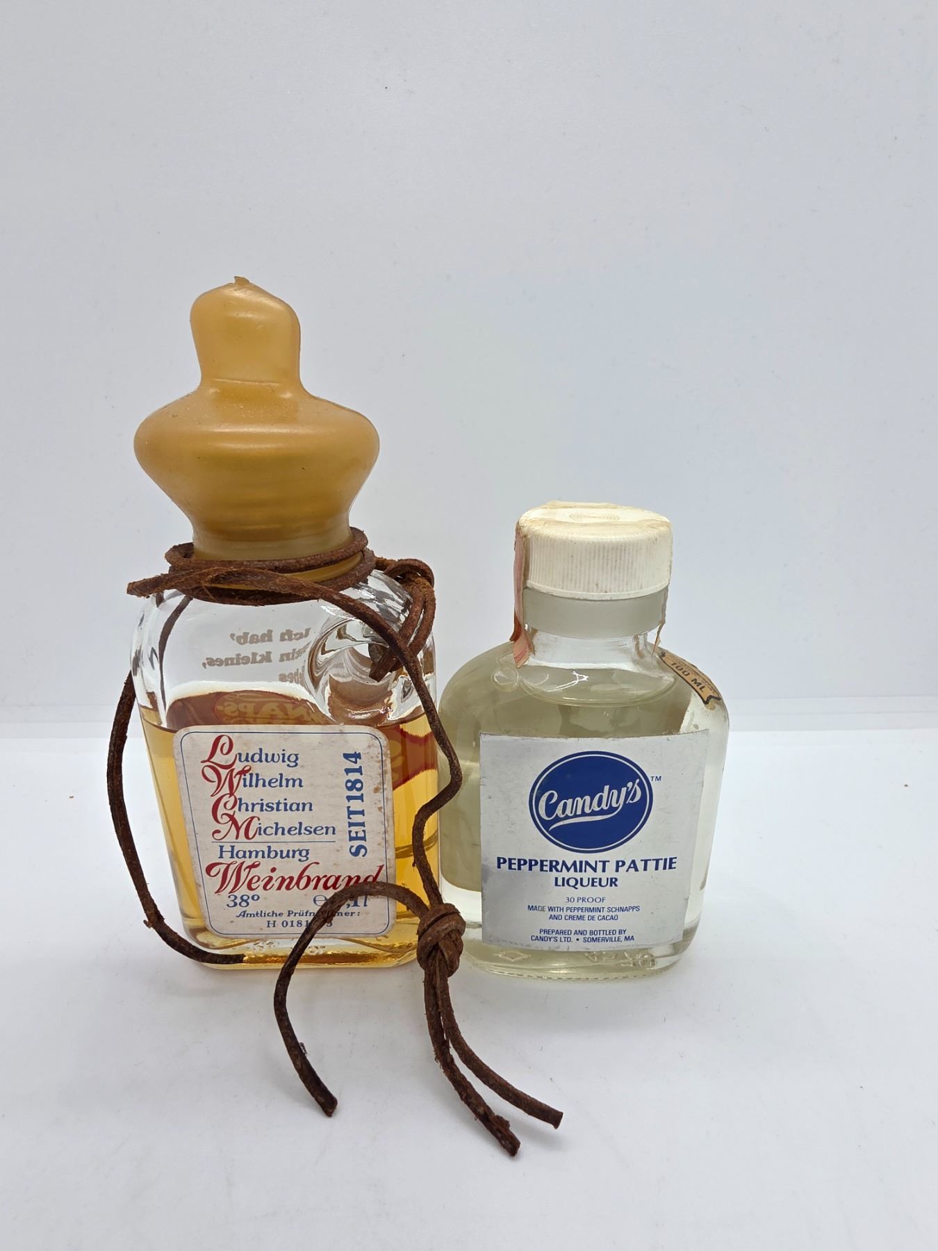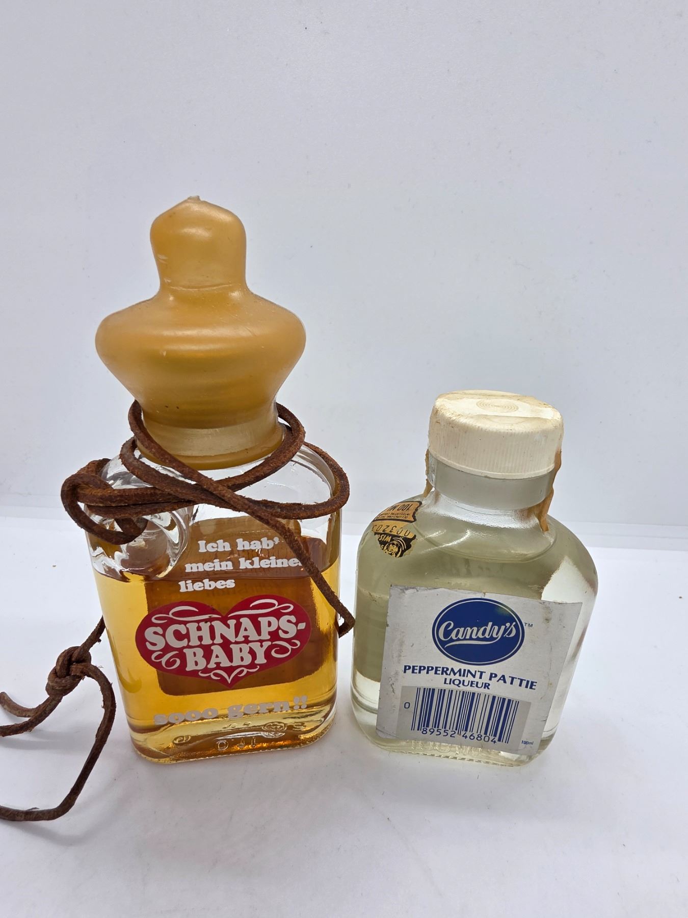 Vintage 100ml Bottle of Candy's Peppermint Patti Liqueur & Weinbrand 0.1 L Schnapps Baby Bottle - Peppermint is full & Schnapps is 3/4 full