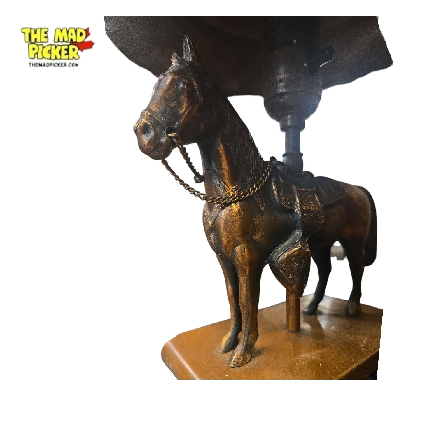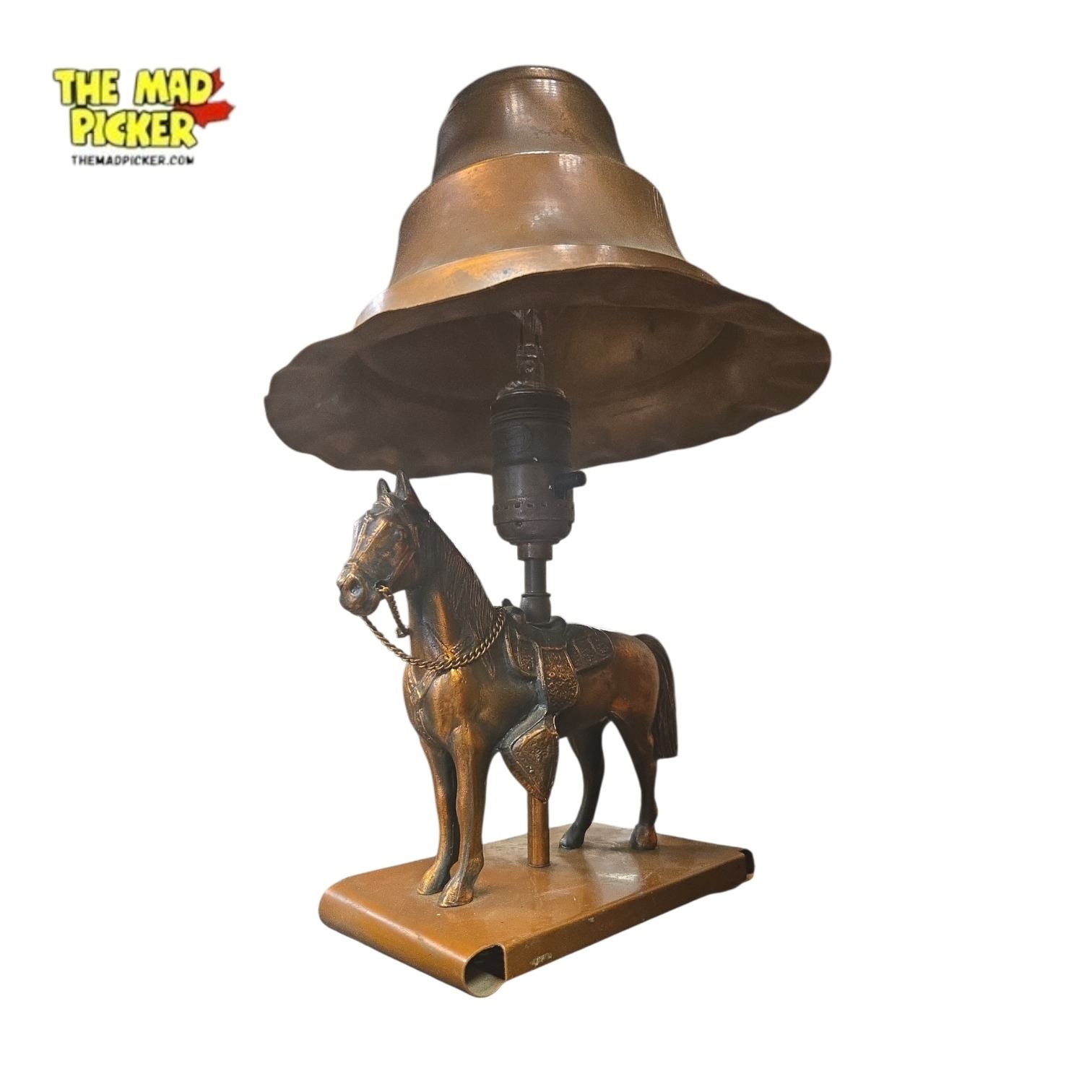 Mid-20th century table lamp featuring a trotting horse figure as the base, mounted on a rectangular wooden base. The lamp and shade have a copper or antiqued-brass finish. Measures 12 inches tall. Likely produced in the 1950s-1960s, this piece reflects the era's design aesthetics.