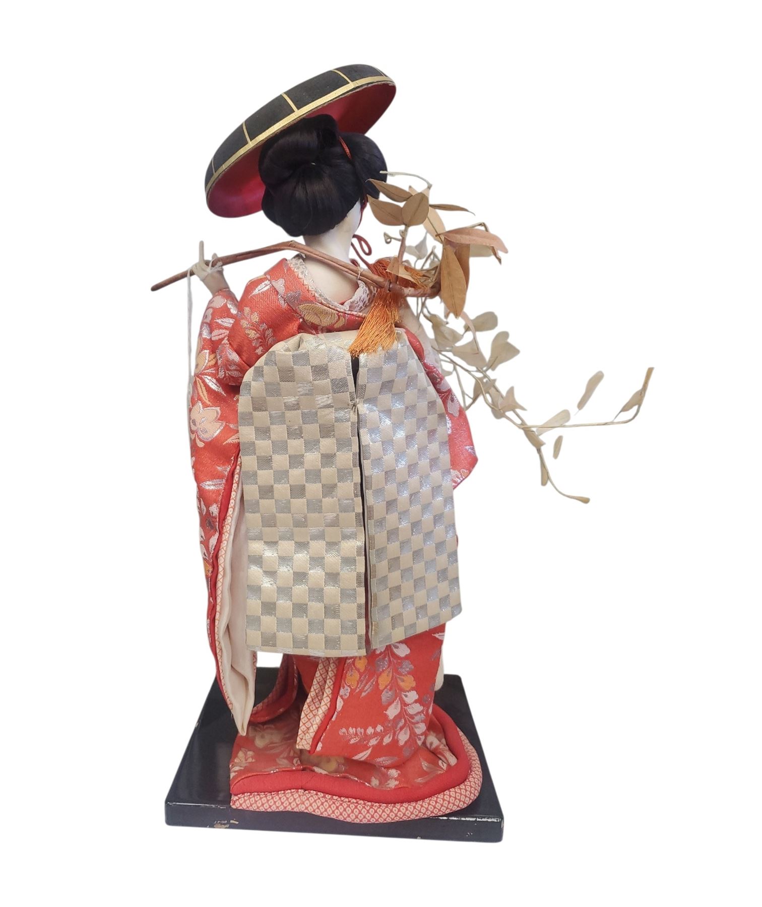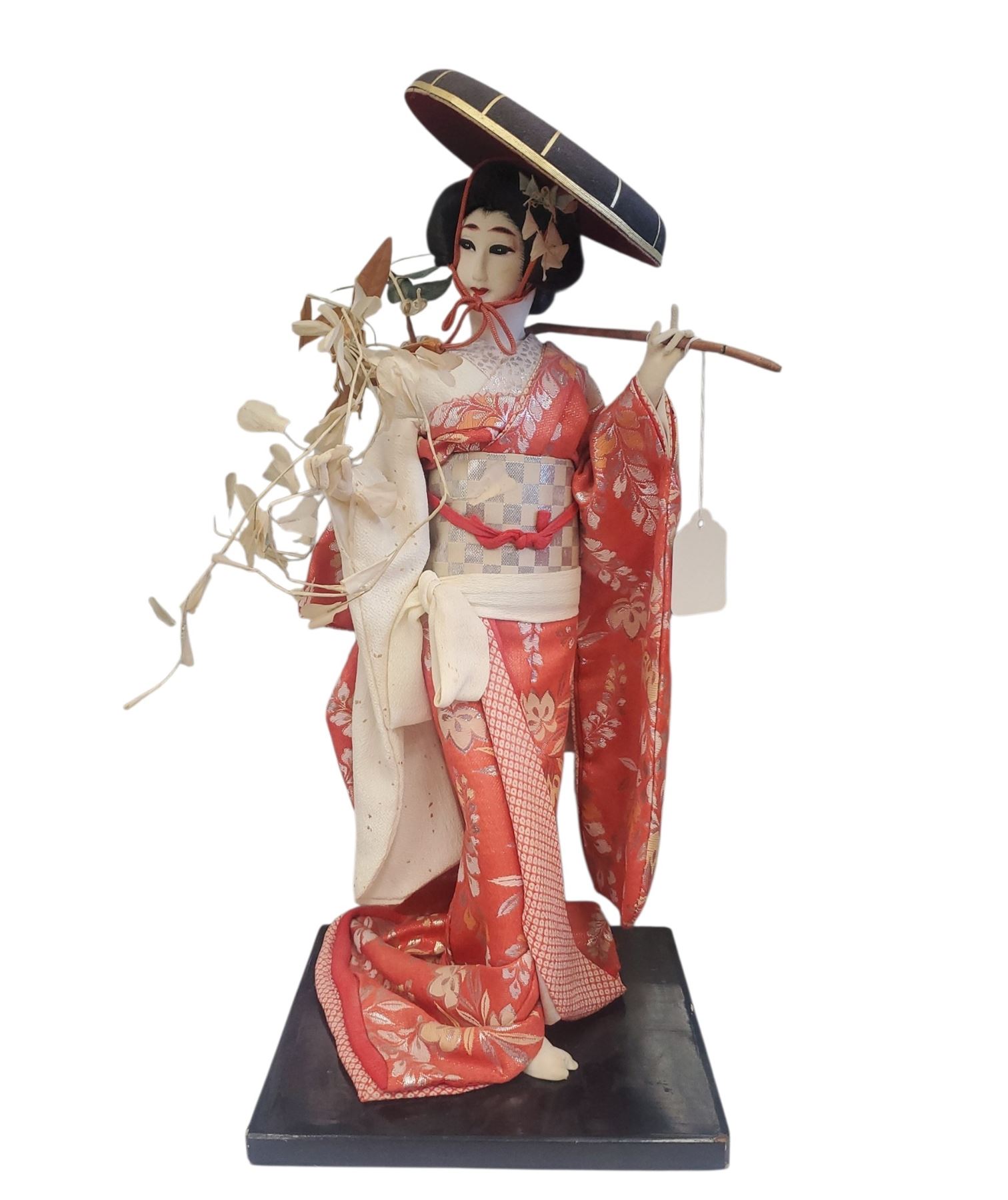 Vintage hand made Japanese Geisha doll from the 1970s. Features intricate craftsmanship and wears a traditional Japanese kimono. The doll showcases detailed facial features and a styled hairpiece. Item is as pictured.