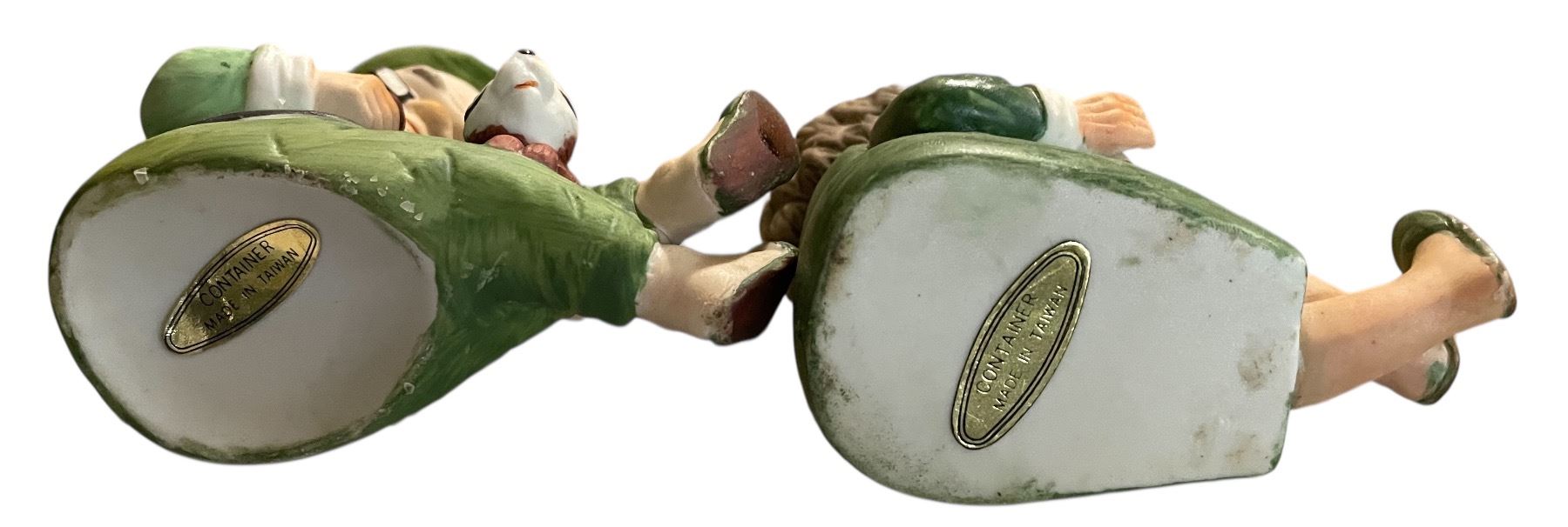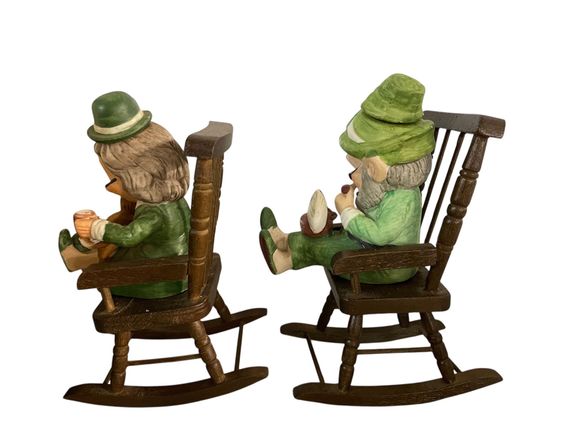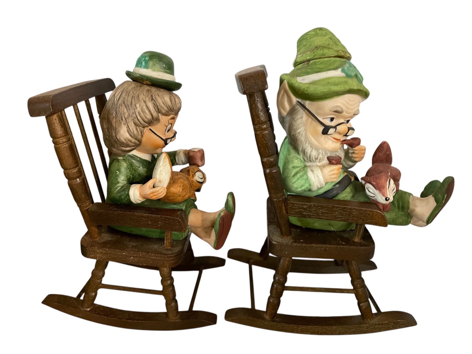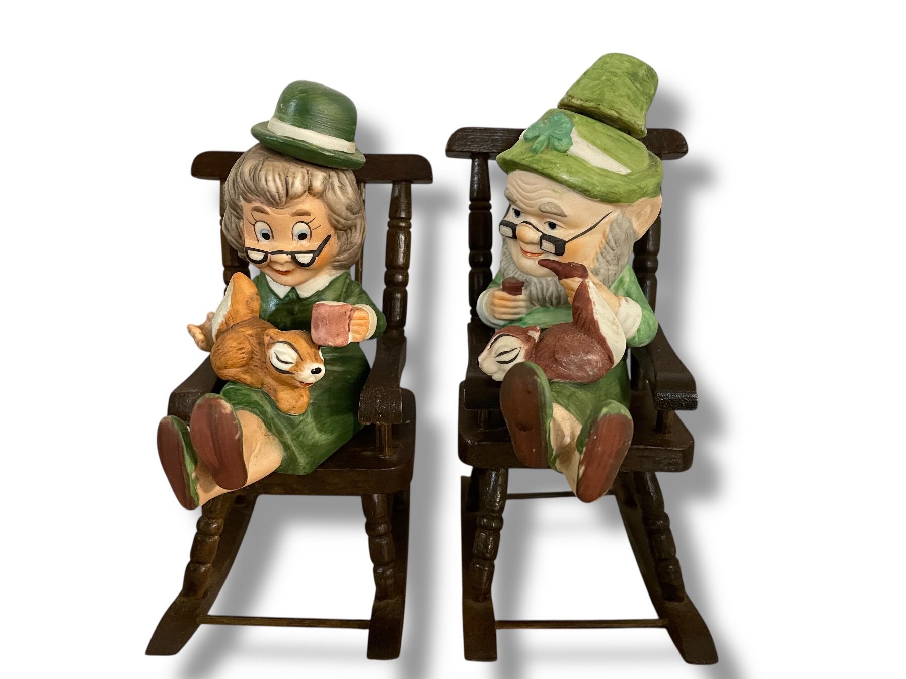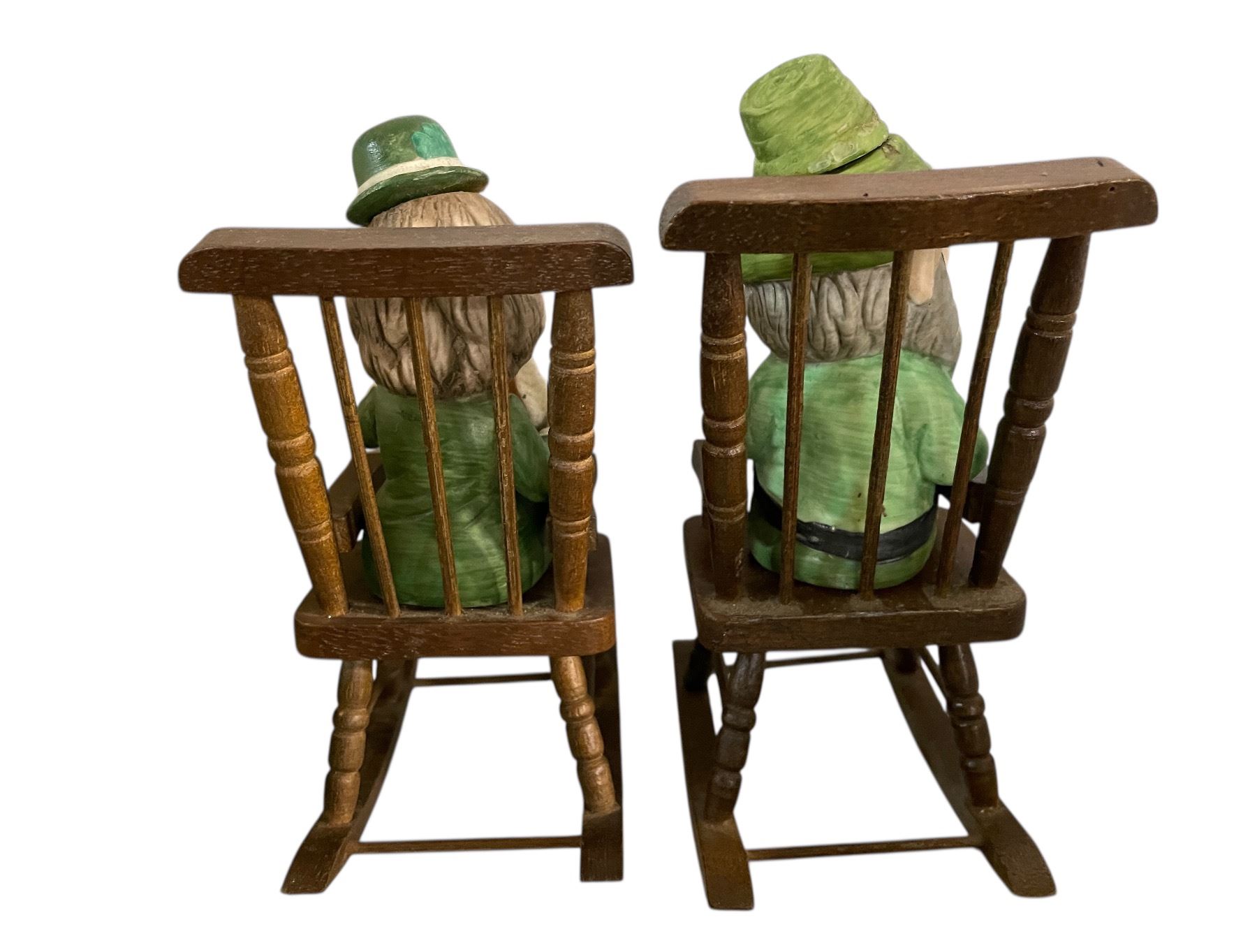 Vintage 1980s National Hoffman “Mr. Lucky & Mrs. Lucky Retired" with Wood Rocking Chair Decanters Empty