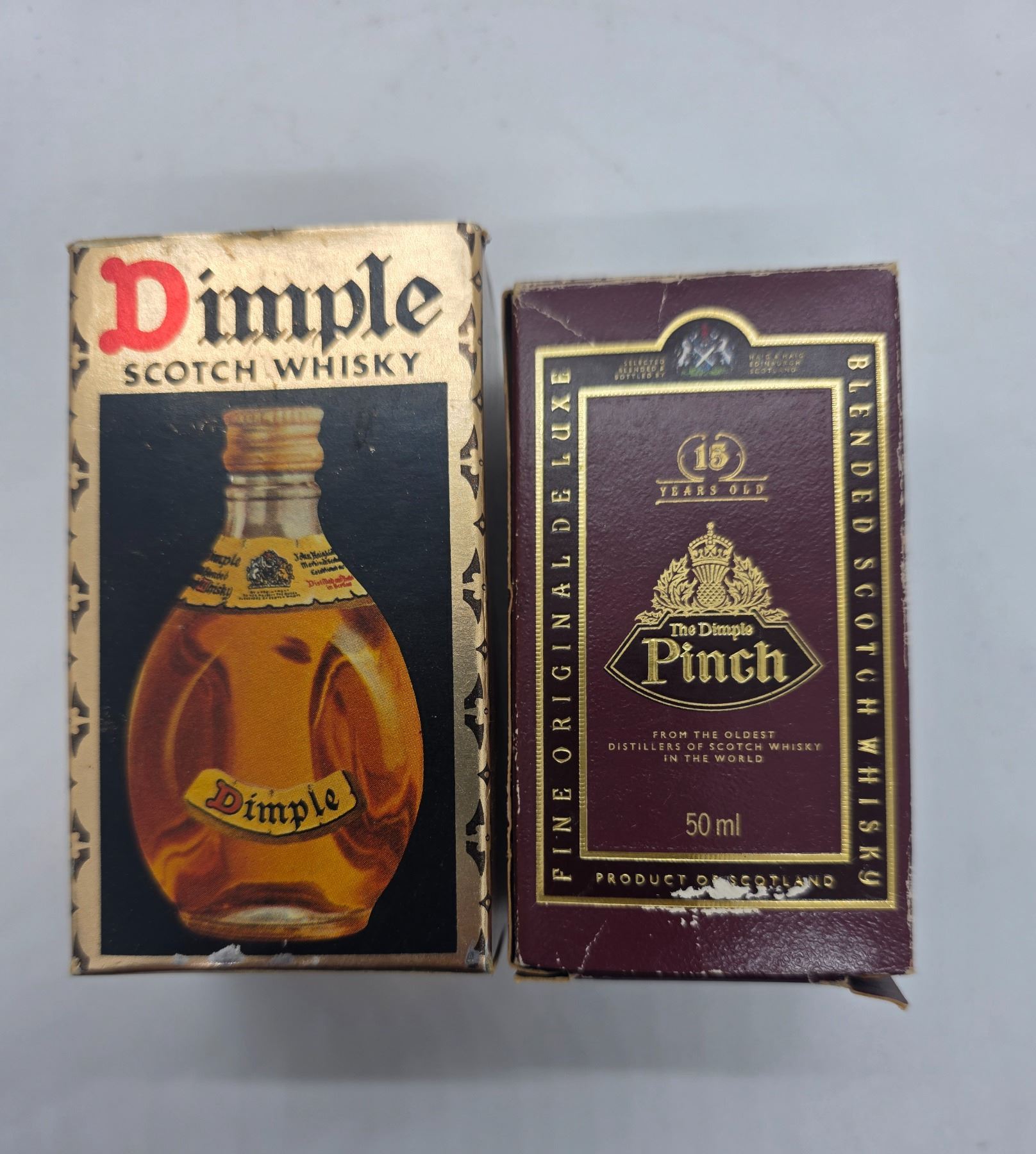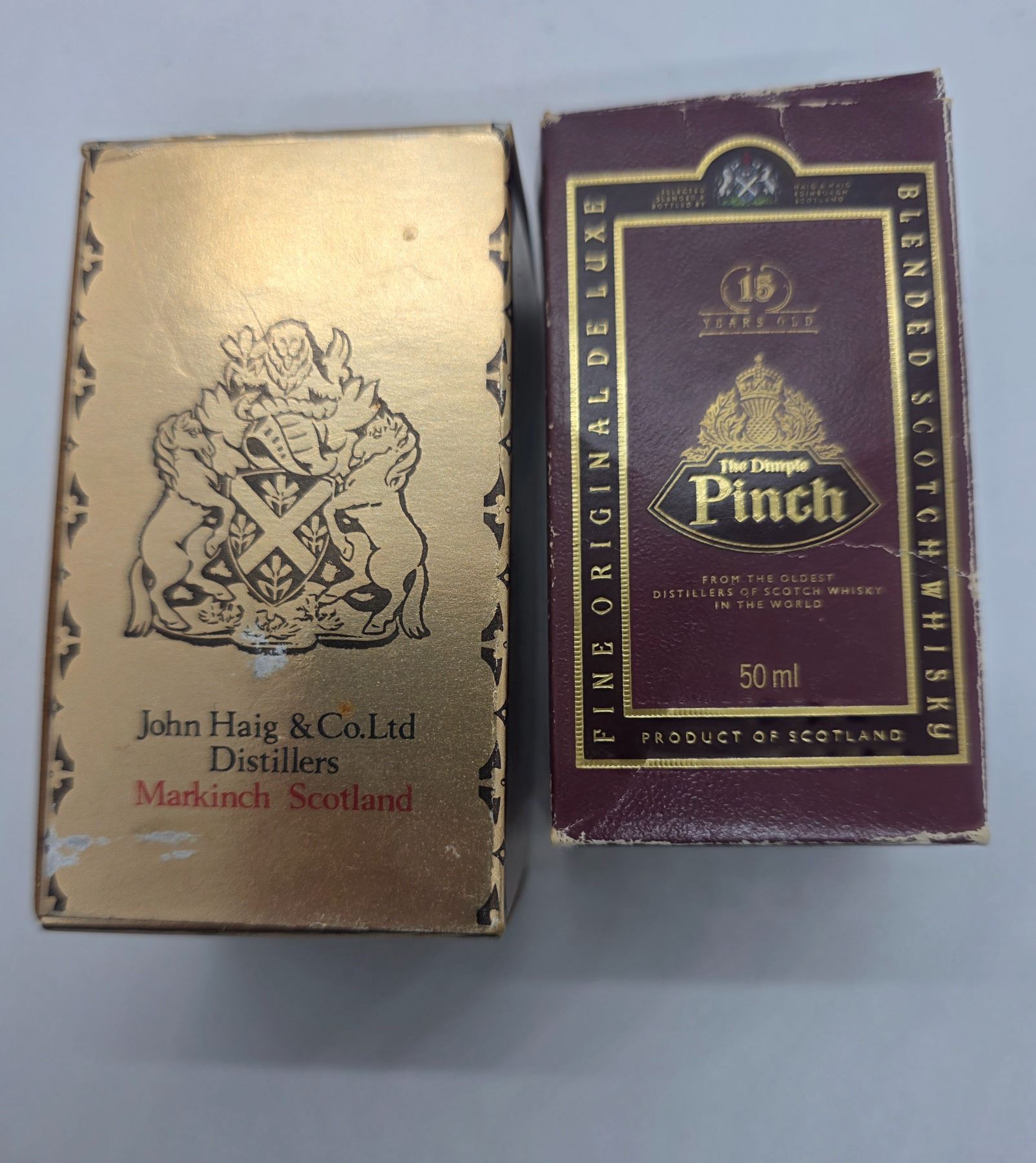 Vintage 50ml Glass Dimple & Pinch Scotch Bottles in Original Boxes - Pinch is empty and Dimple is 1/2 full