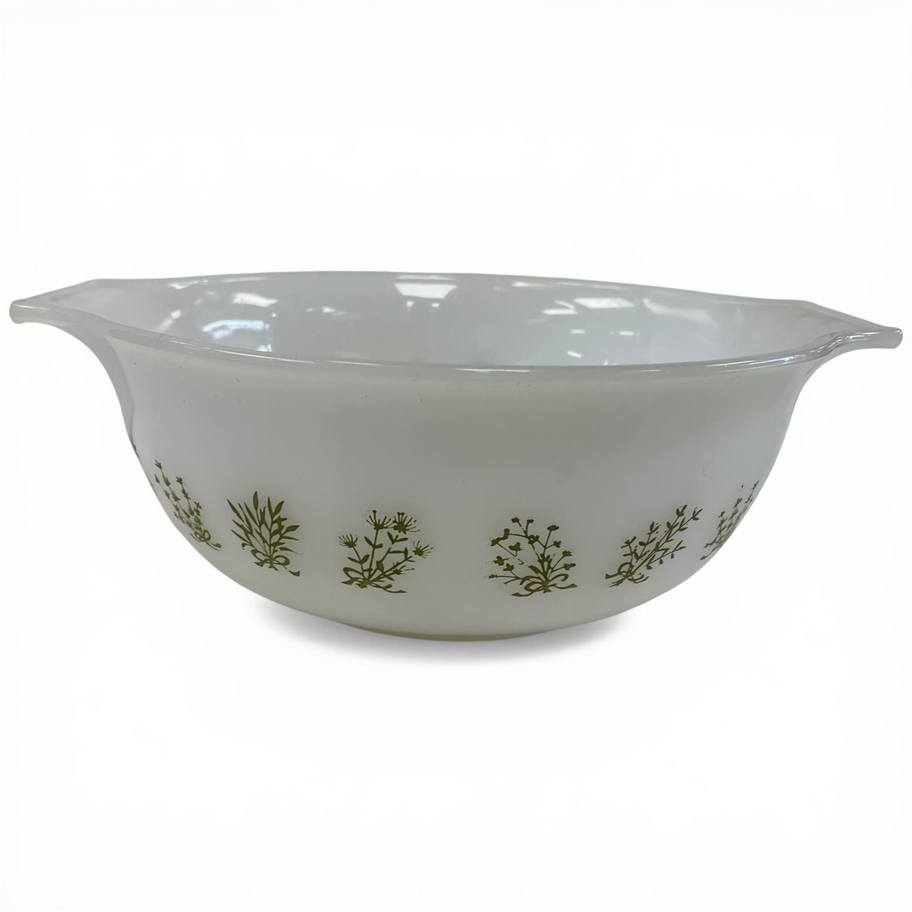 Vintage 9.5" Glasbake "Flowering Herb" Tab Handle Mixing Bowl