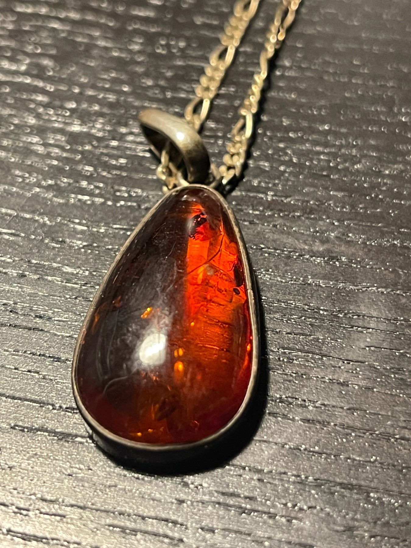 Vintage Amber Resin Pendant on a 30" Sterling Silver Chain - Pendant is 8mm x 20mm x 36mm.