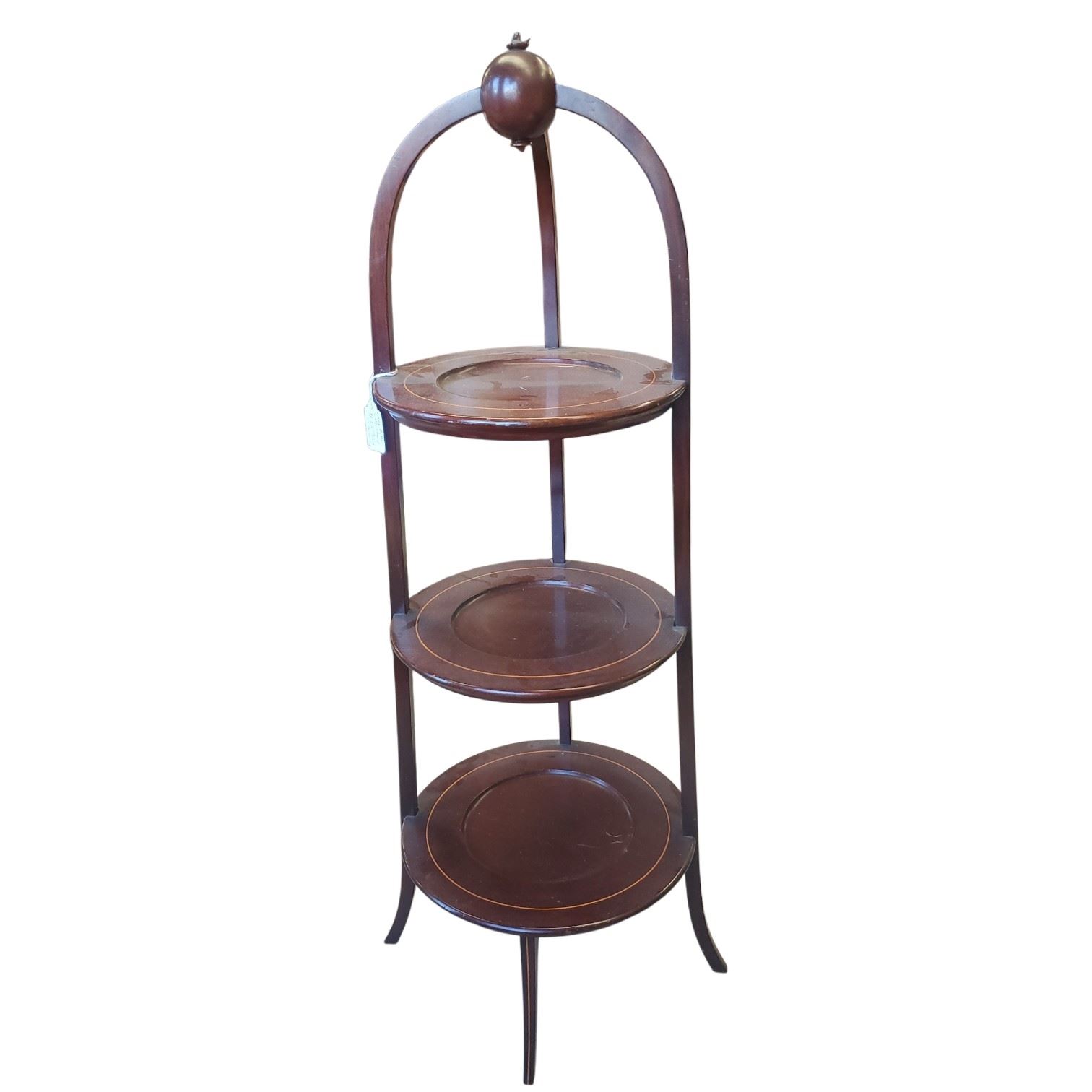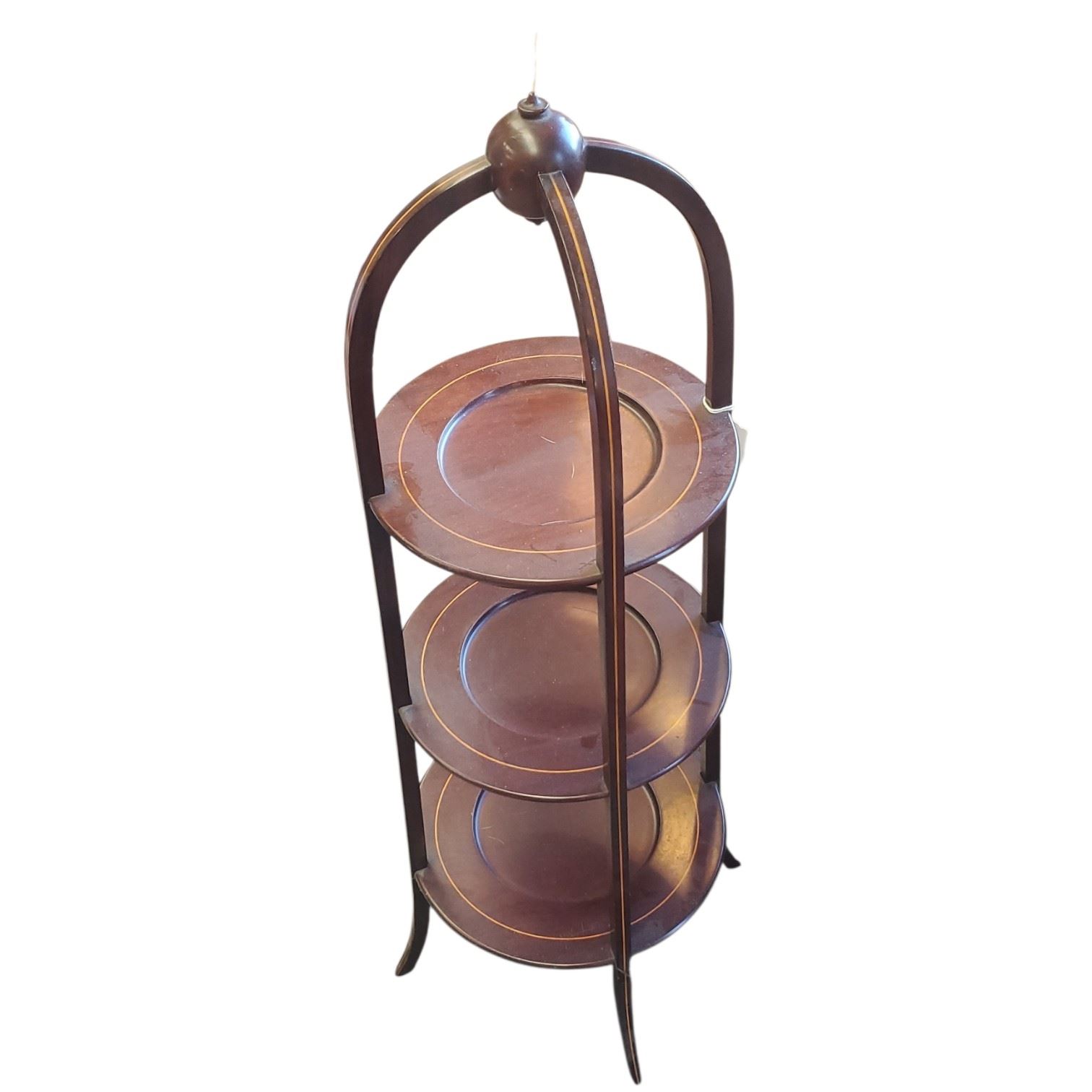Vintage antique 3-tier cake stand crafted from mahogany with inlaid stained design. Features Edwardian style elements and lazy butler functionality. This stand measures 35-Inch tall. Item is as pictured.