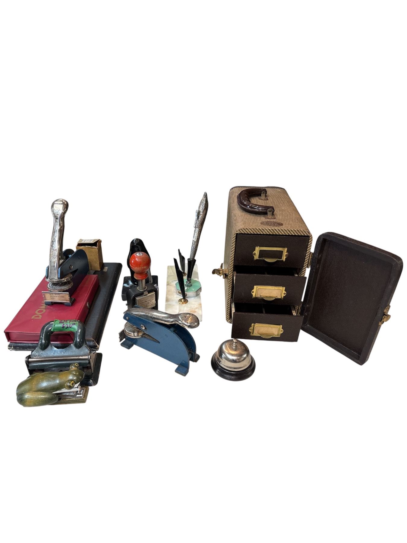Lot includes vintage and antique office supplies such as stamps, embossers, pen holders, bell, stapler, dominos and more. Assorted items reflect varying styles and periods. Item is as pictured.