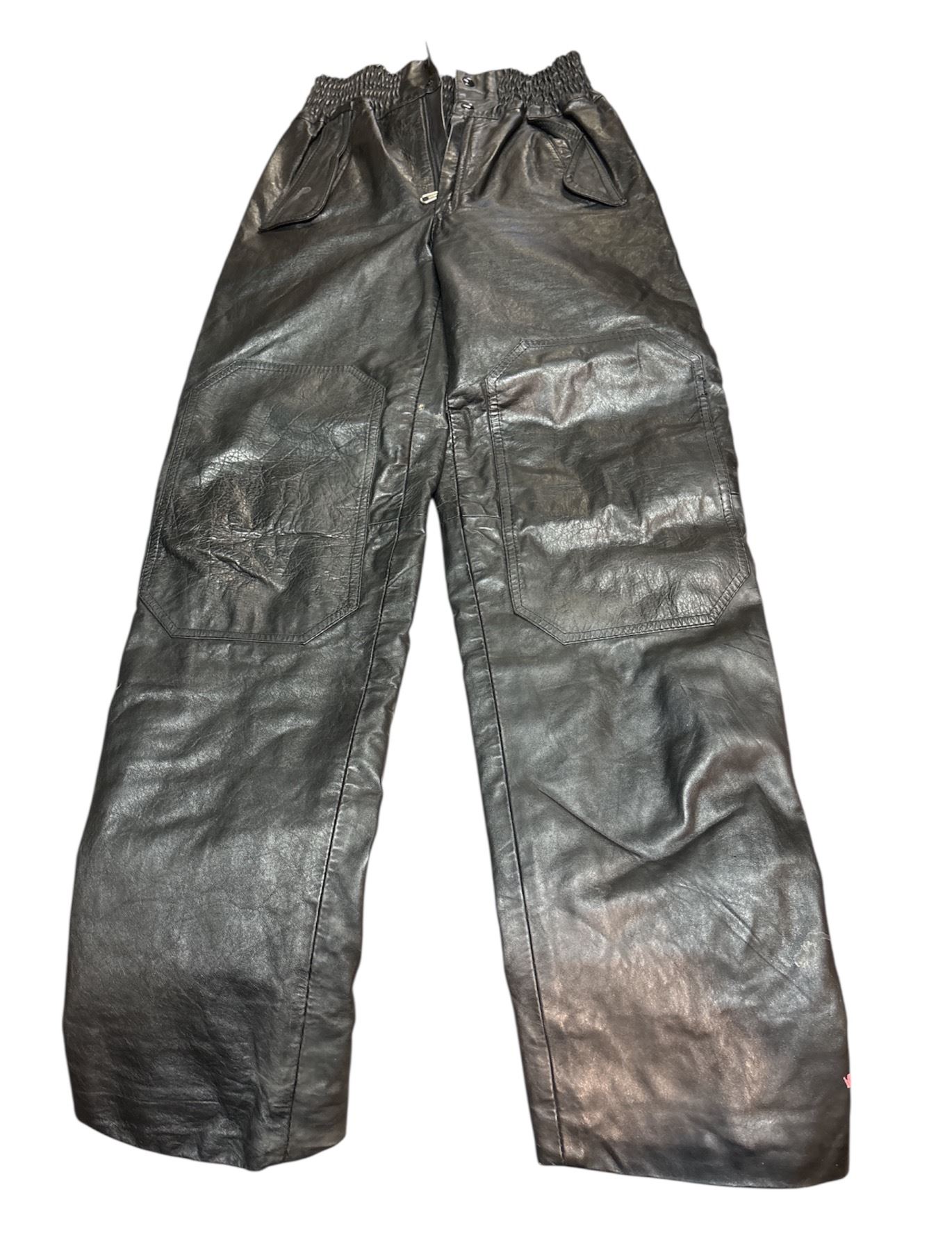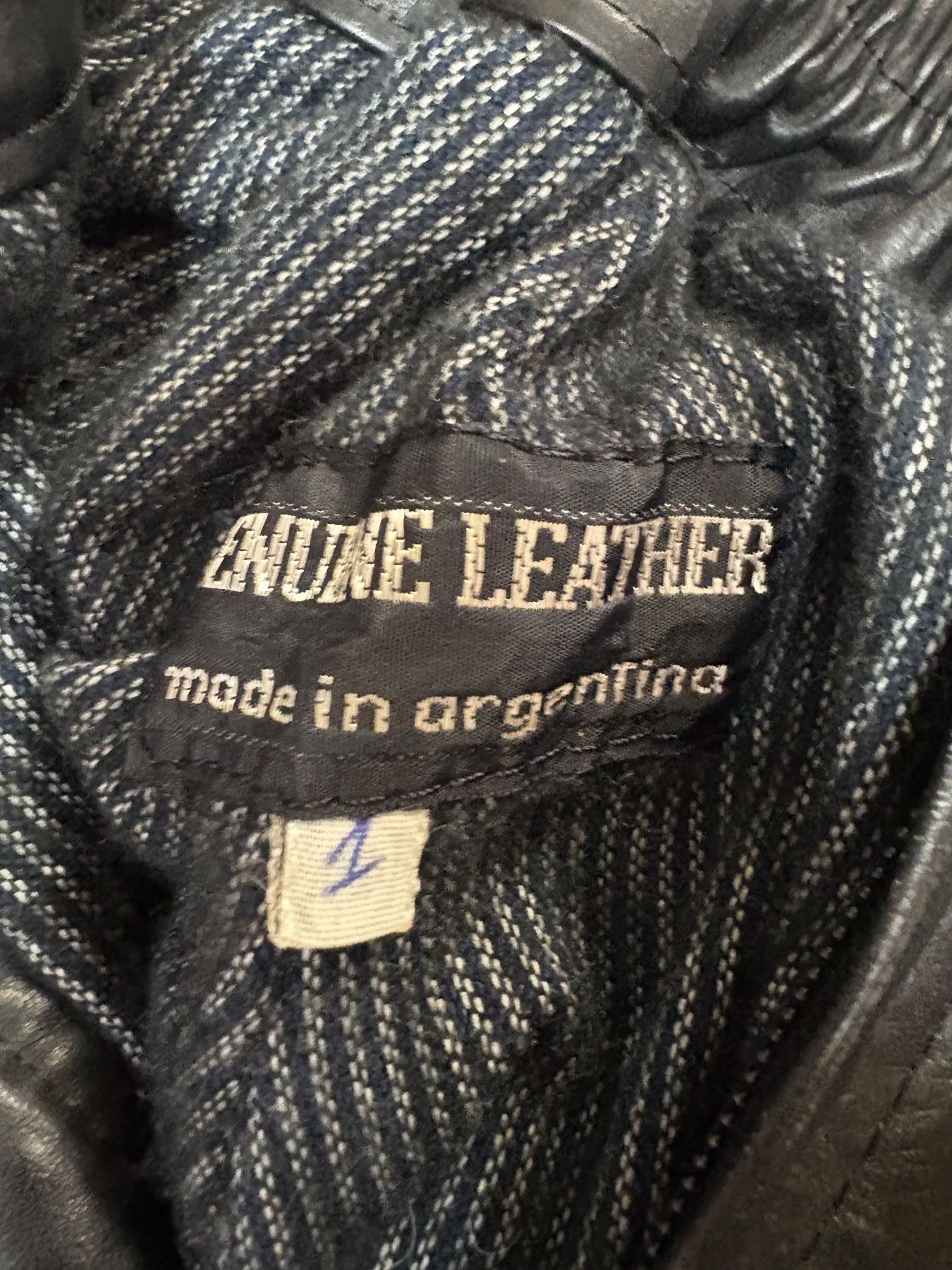 Vintage women's pants made in Argentina from black leather. Features classic styling and size 1 fit as indicated. Item is as pictured with details reflecting material and craftsmanship.