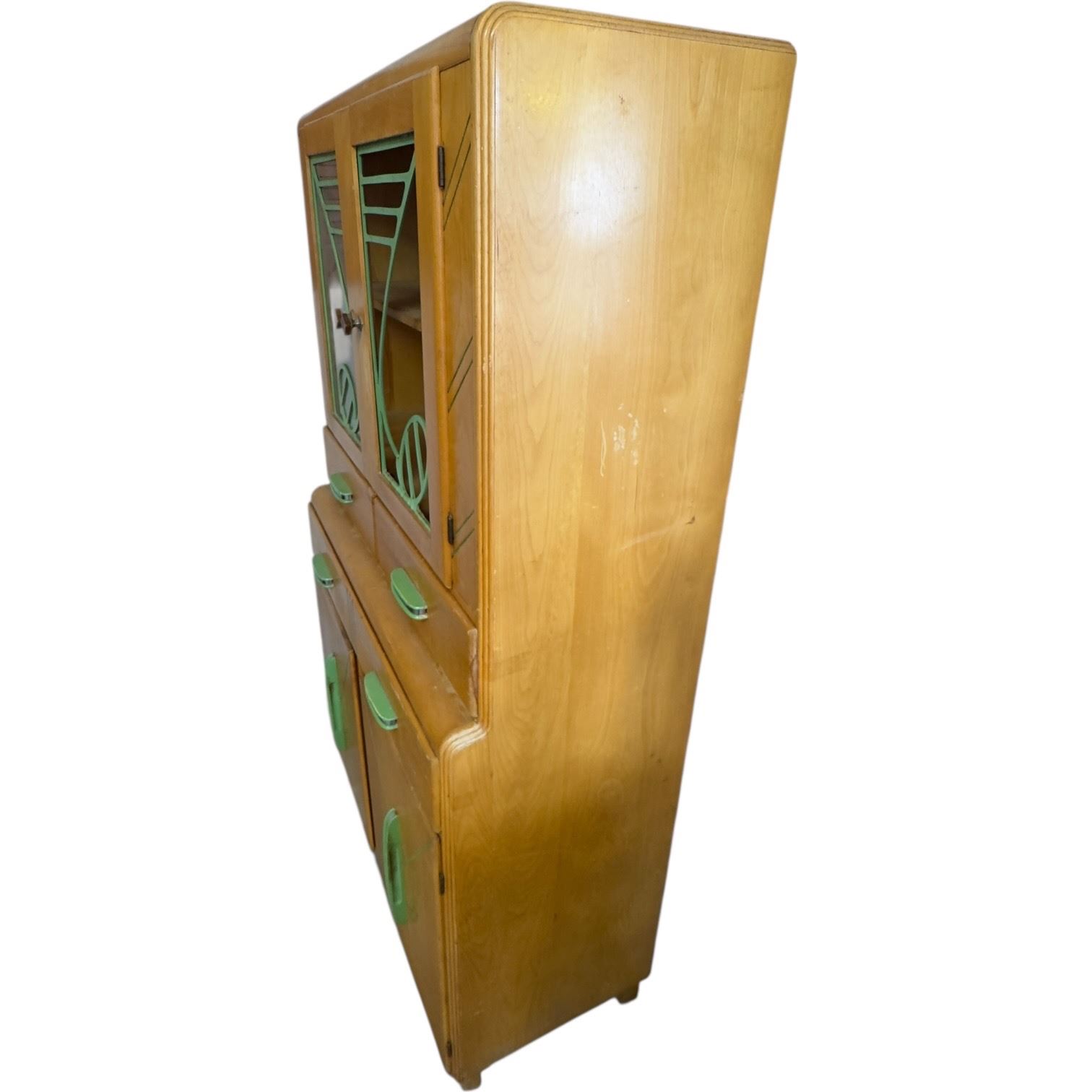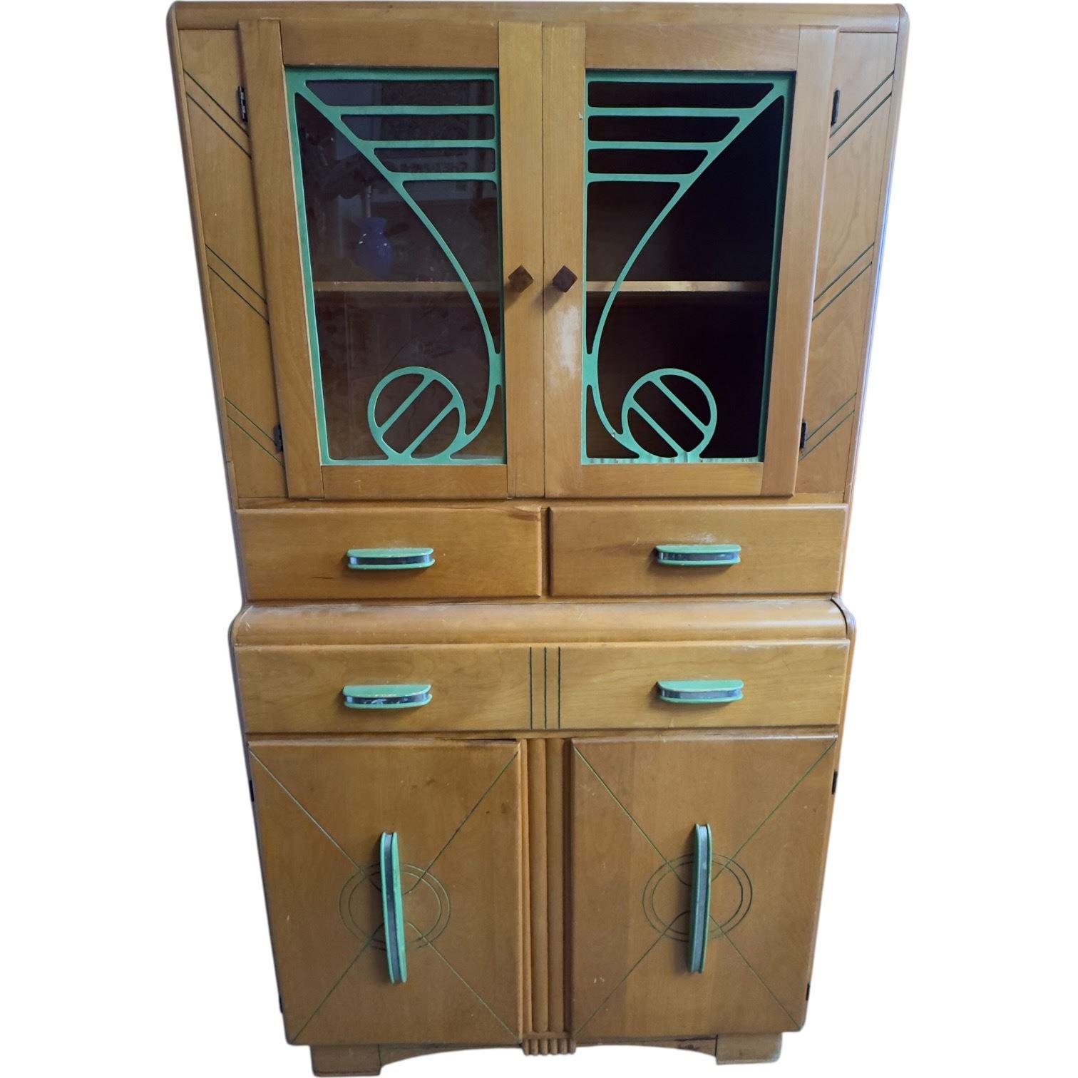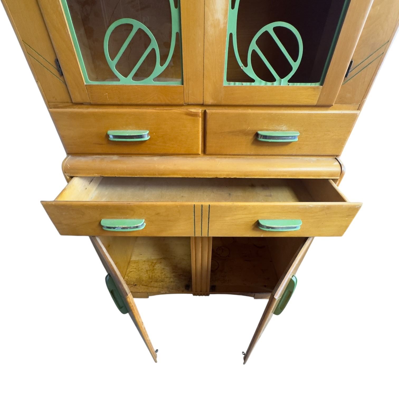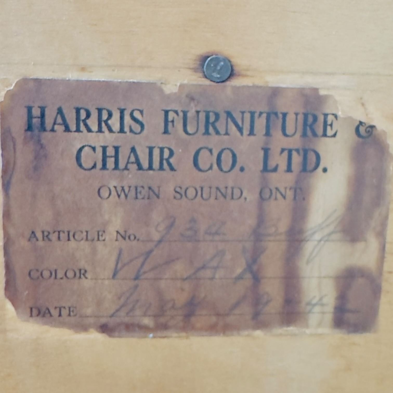 Vintage Art Deco cabinet by Harris Furniture & Chair Co Ltd from Owen Sound Ontario. Measures 33x16x62-Inch. Features new glass, though the door panel is loose and needs some repairs. Item is as pictured.