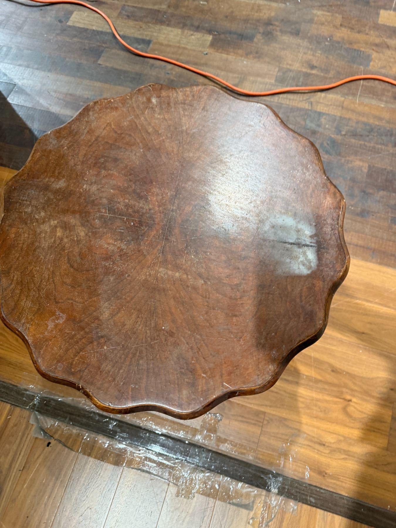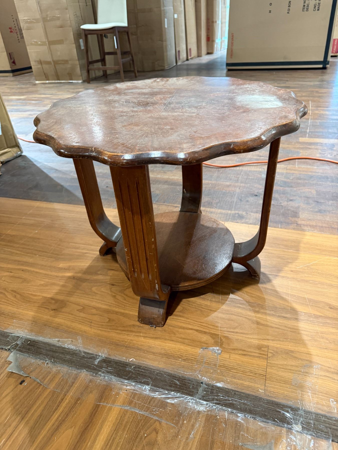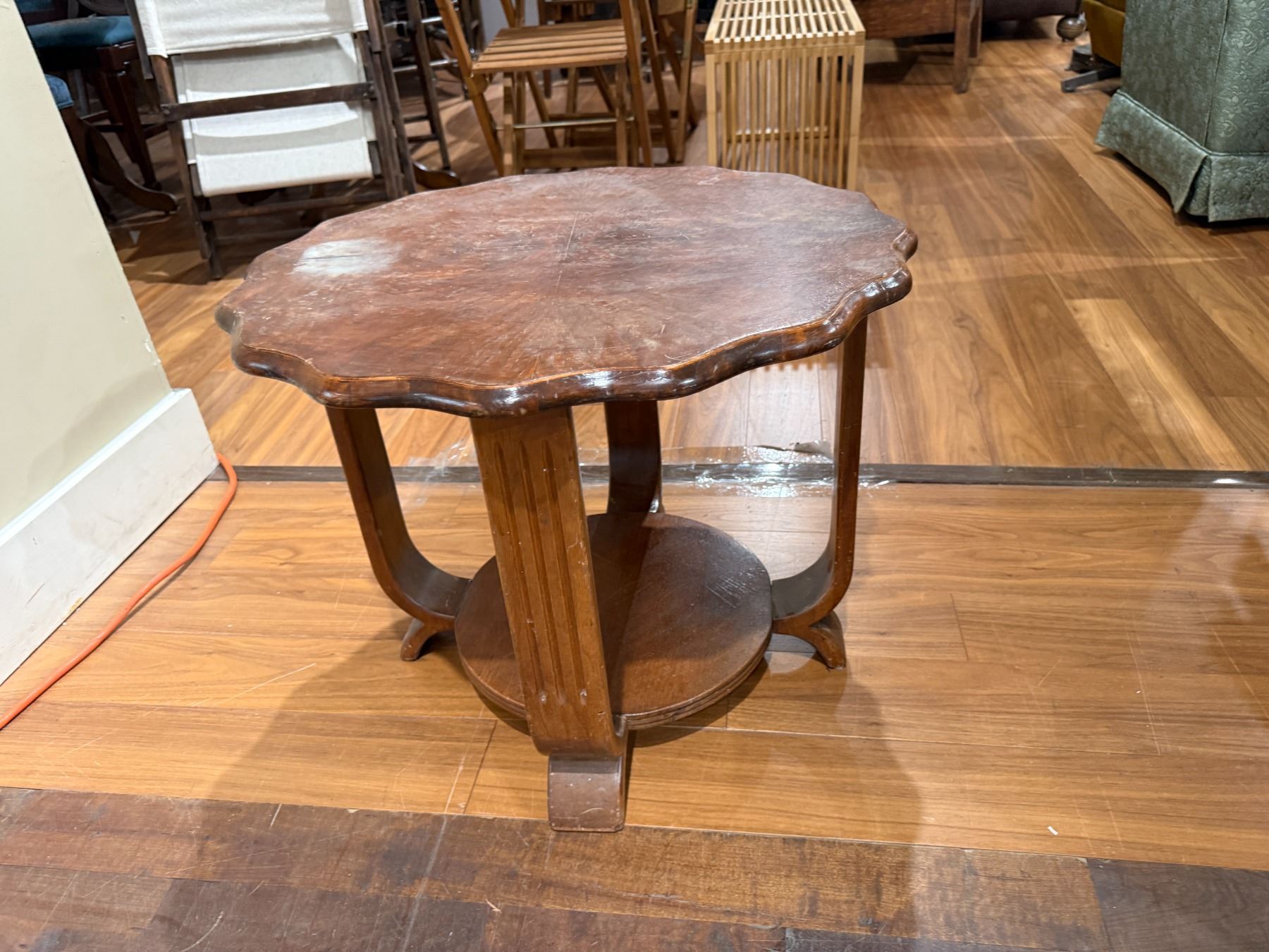 Vintage Art Deco wood table featuring scalloped edges and a walnut veneer surface. Measures 18-Inch in height and 23-Inch in diameter. Characteristic of the 1920s-1930s Art Deco design style, showcasing clean geometric lines and rich material finishes. Item is as pictured.