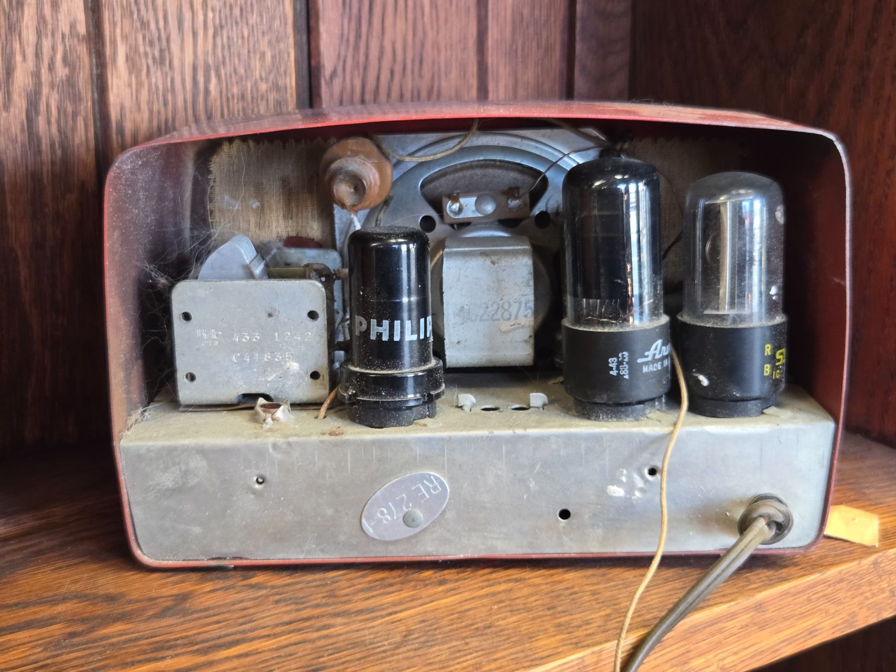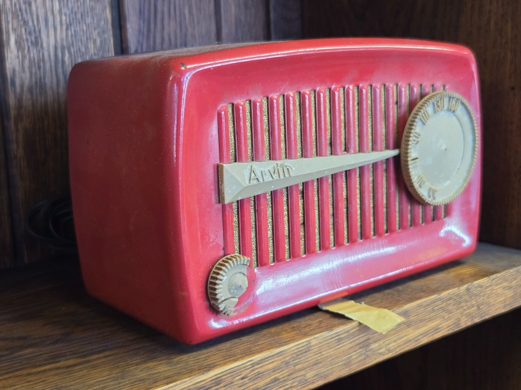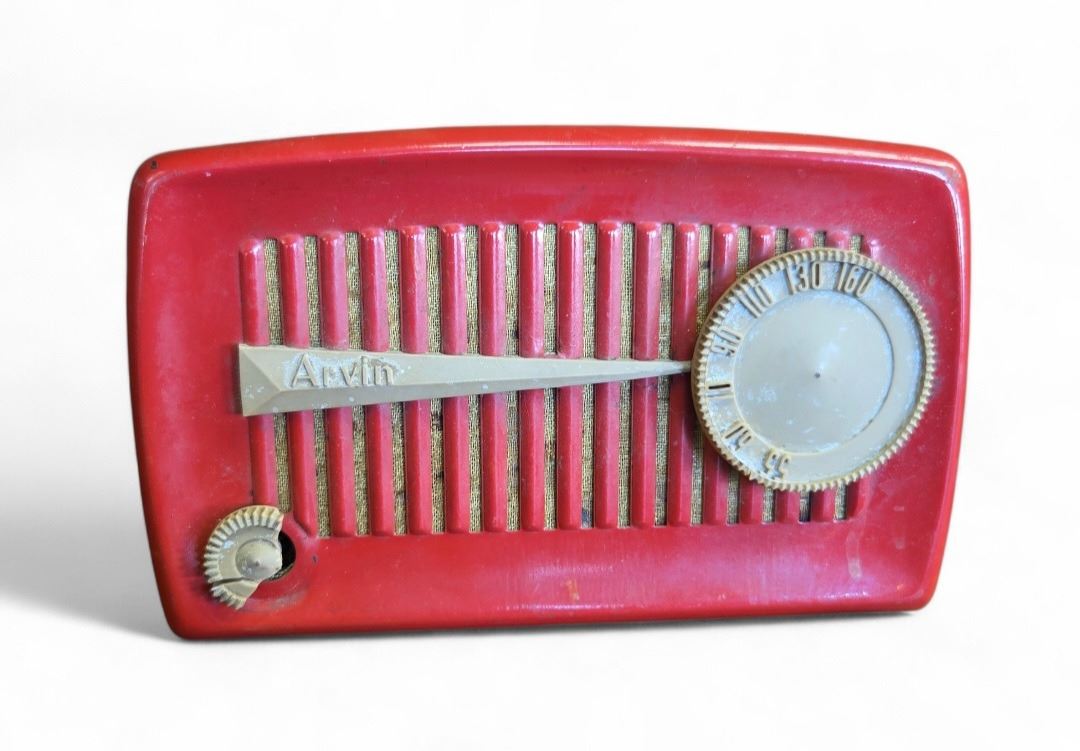 Arvin Model 840T tube radio manufactured in the 1950s with red Bakelite casing. This tabletop AM radio features a front rounded speaker grille and an analog tuning dial. Designed by Noblitt-Sparks Industries in Columbus Indiana USA. Item is as pictured.