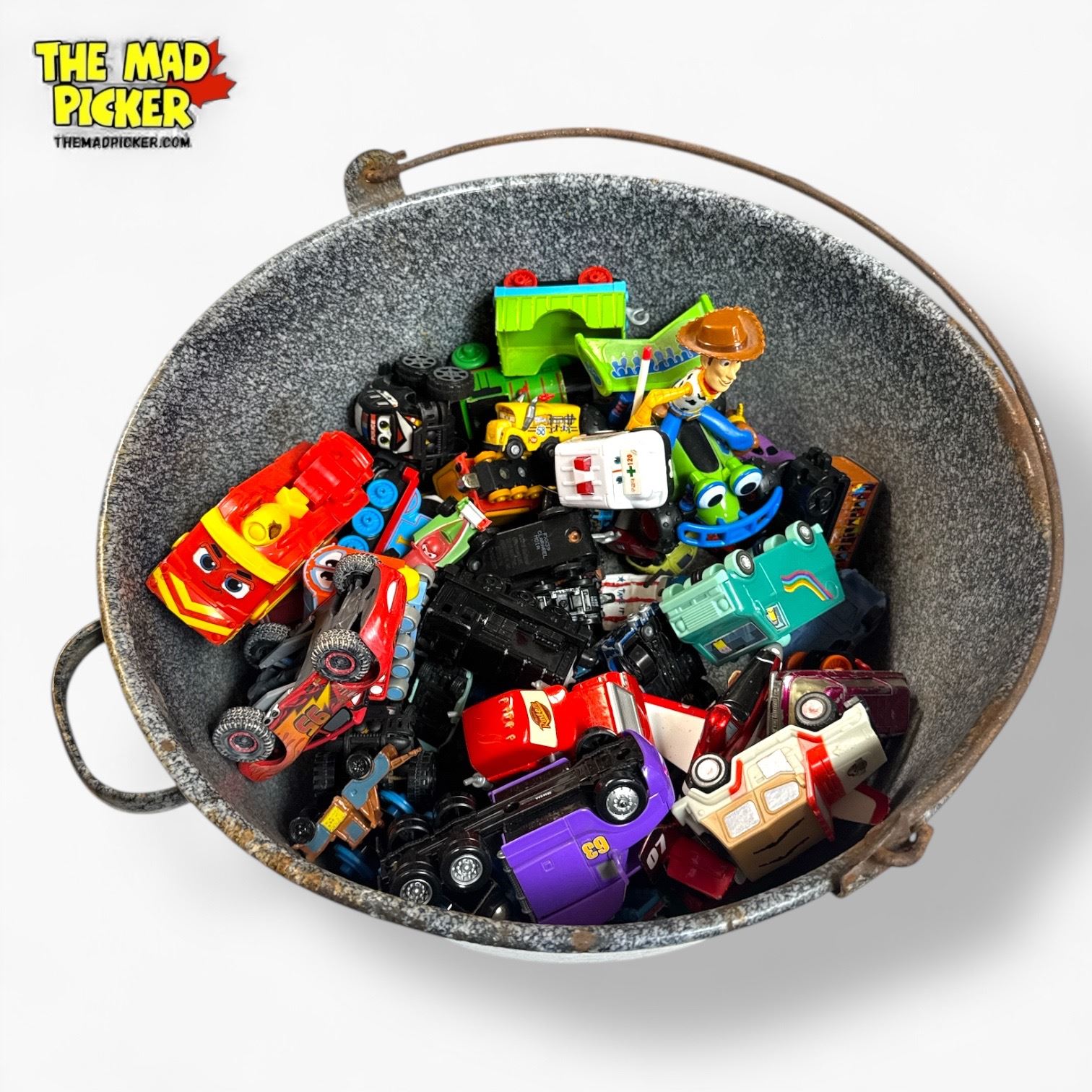 Collection of assorted vintage toy cars including brands like Hot Wheels and Matchbox. Suitable for collectors or play. Cars come housed in a galvanized metal bucket. Specific models, years, and conditions are not detailed in the provided information.