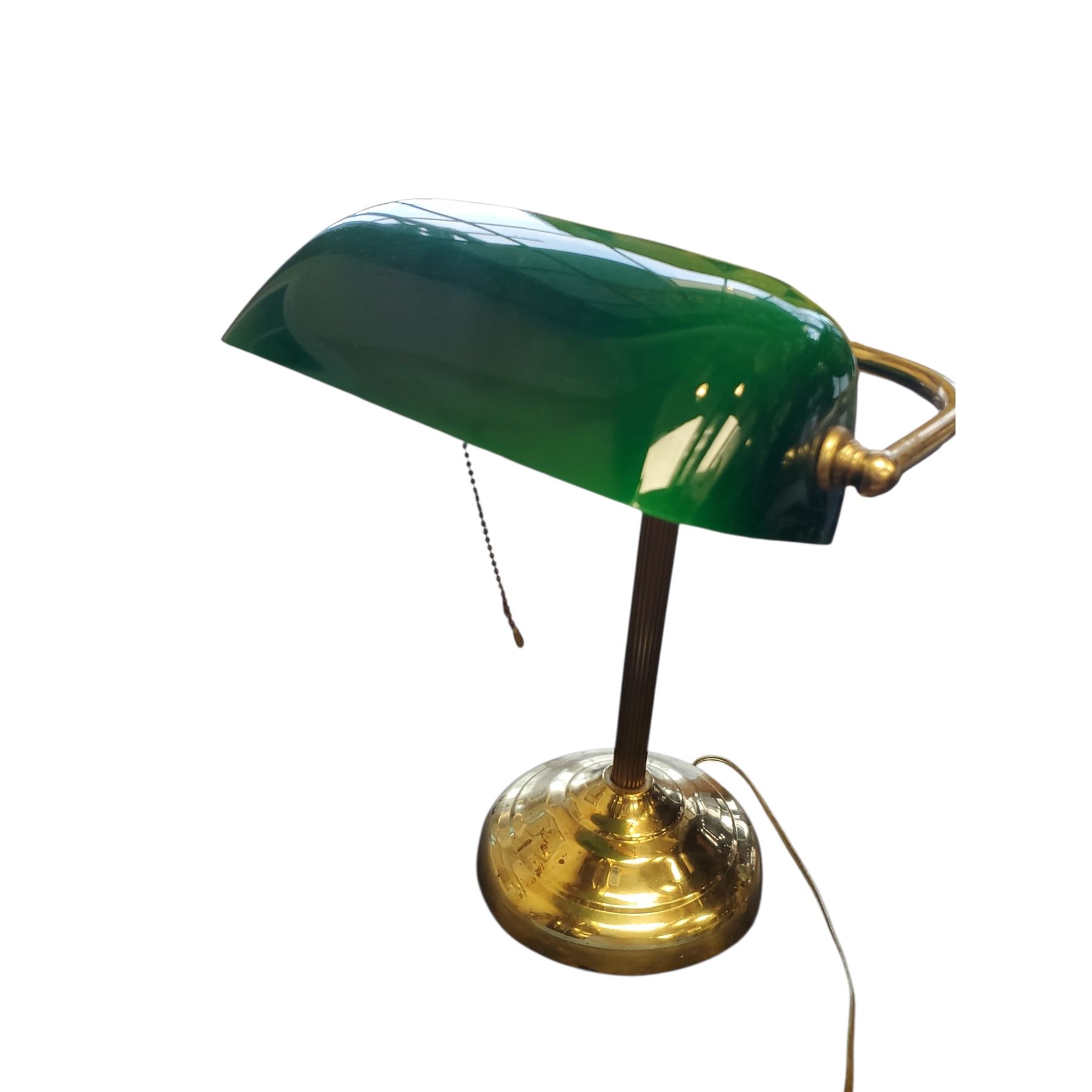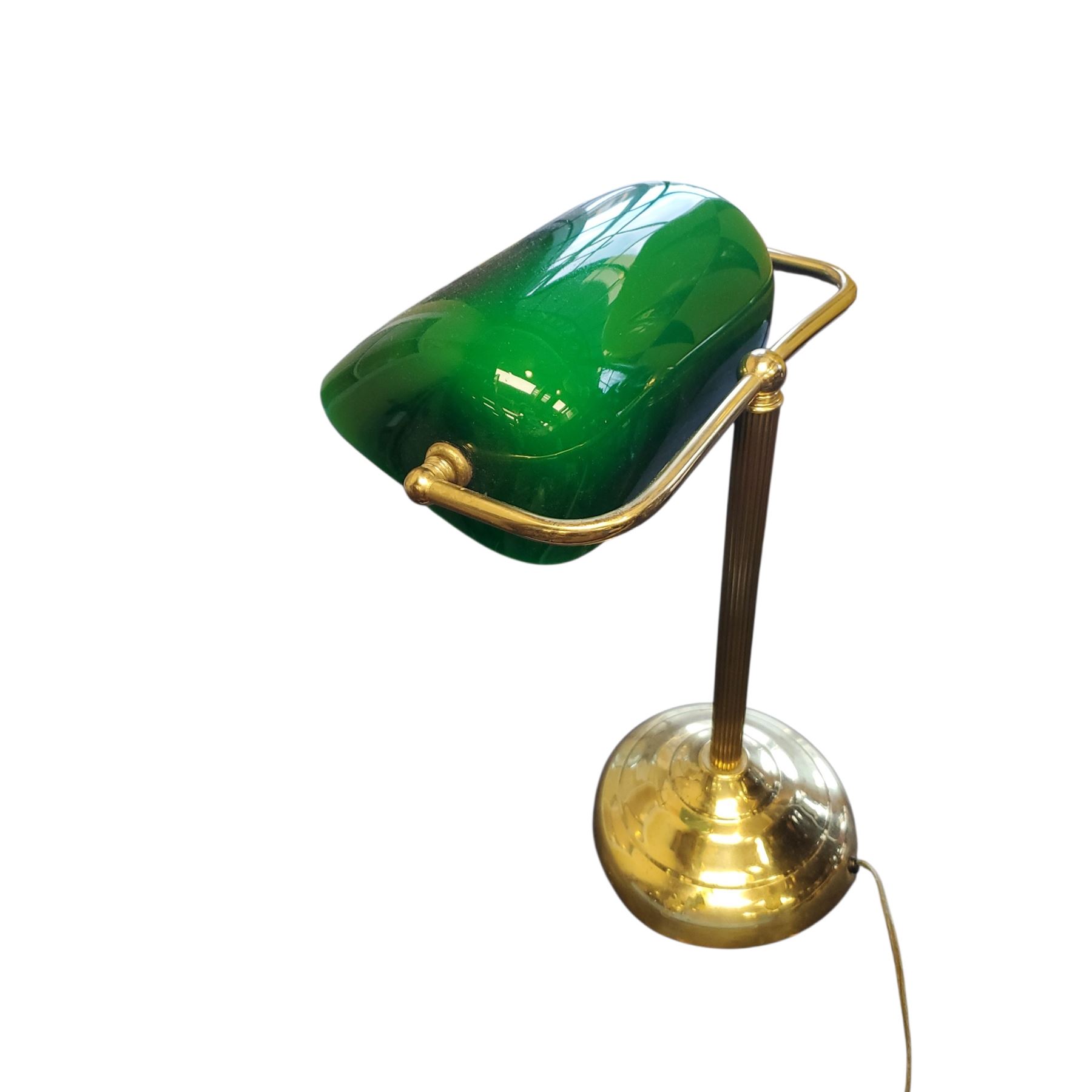 Vintage Bankers Lamp featuring a green glass shade and brass base, measuring 14.5-Inch tall. Classic design often seen in libraries and offices. Item is as pictured.