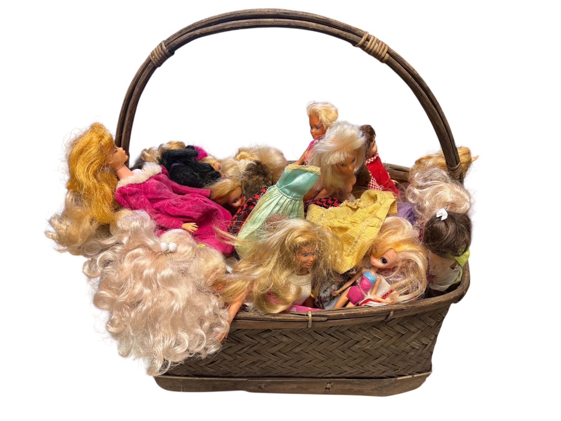 A collection of vintage Barbie dolls with assorted clothing and accessories presented in a single basket. Includes various outfits and accessories from different eras. Exact quantities, styles, and conditions of individual items not specified.