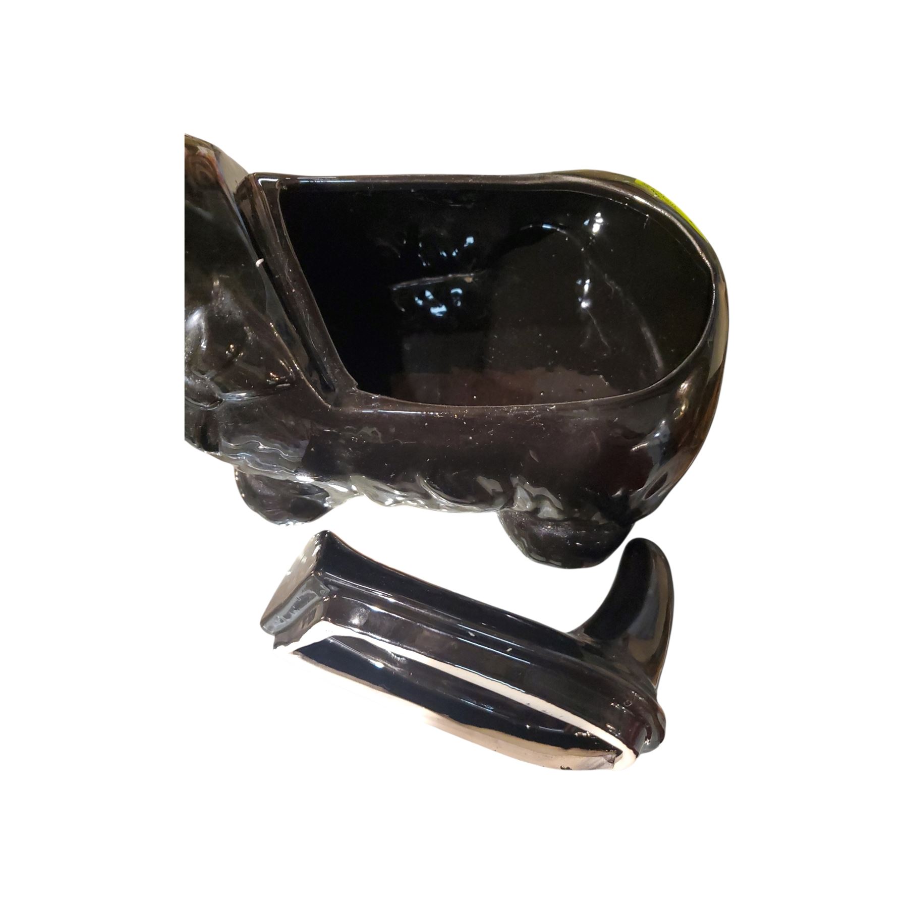 Vintage cookie jar shaped as a Scottish Terrier (Scottie) dog, crafted from high-gloss black ceramic. Measures 12.5 inches in length. Popular collectible design featuring detailed craftsmanship. Functional lid for storage. Likely mid-20th century production, maker not specified.