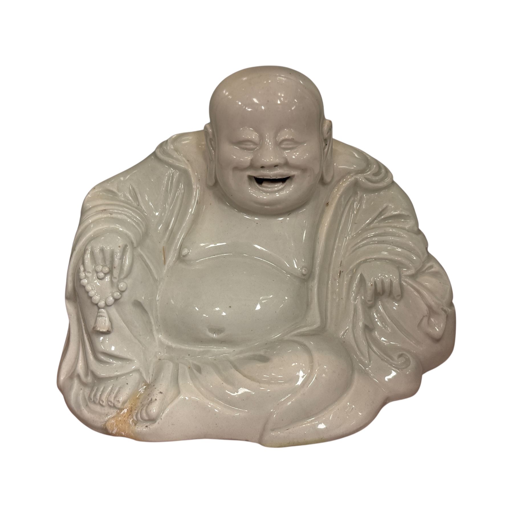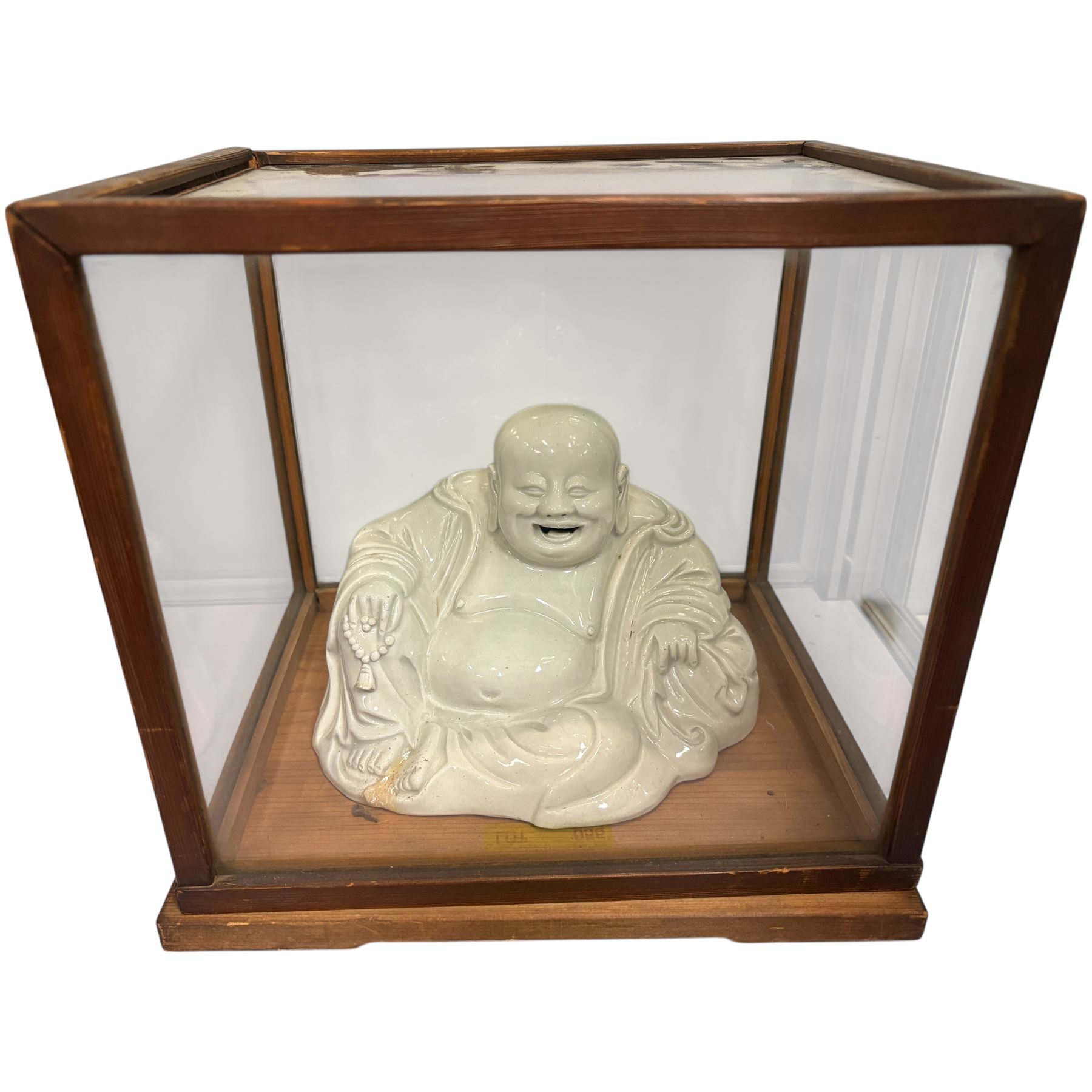 Vintage Blanc De Chine white porcelain figurine of the Laughing Buddha, also known as Budai or Hotei. Features a seated, smiling figure with a large belly, symbolizing happiness and prosperity. Encased in a wooden display case with glass panels. Display box dimensions: 10x8.5x9.5 inches.