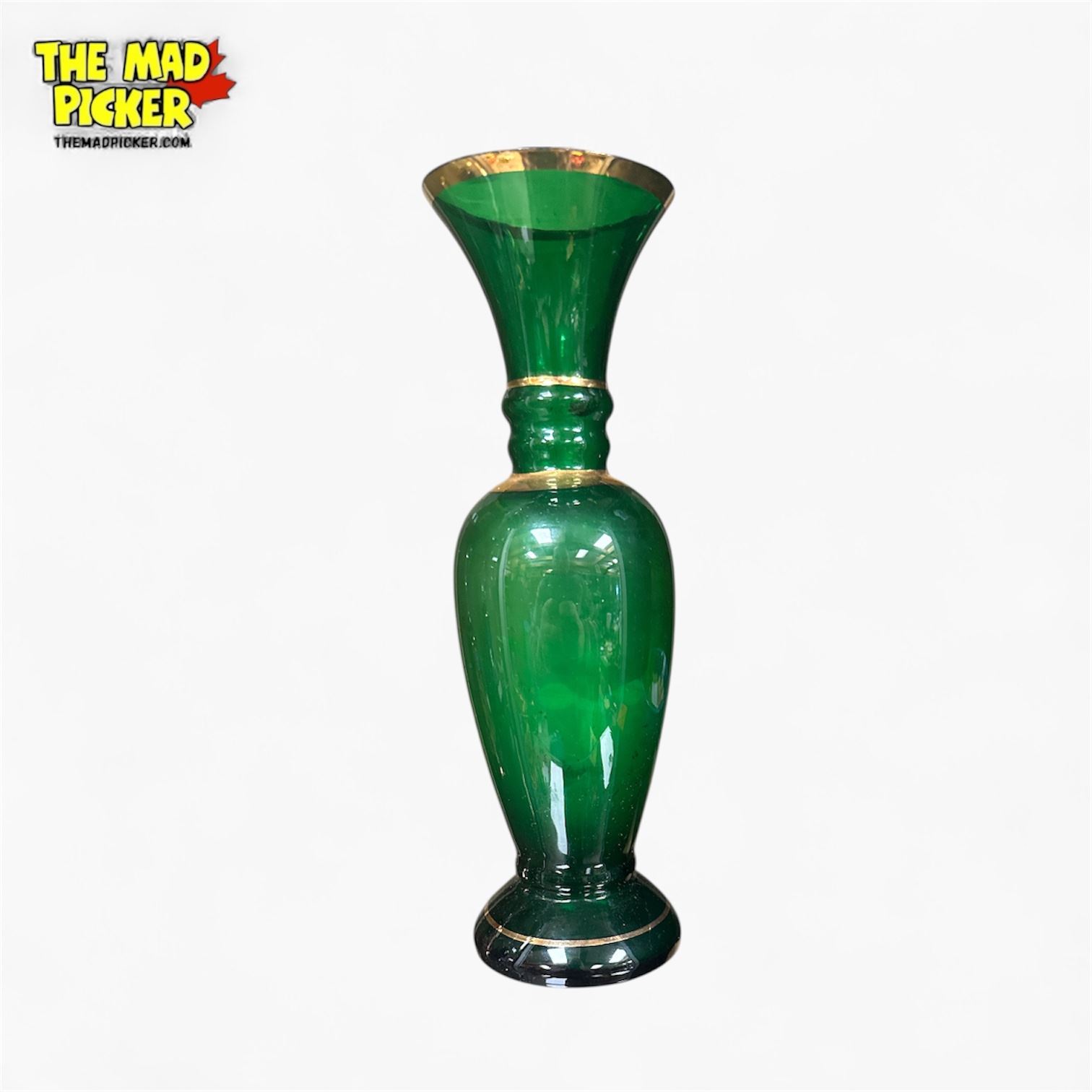 Emerald green Bohemian glass vase, likely late 19th to early 20th century. Features hand-painted gold gilt and raised floral enamel decorations, applied with brush techniques and furnace-fired. Associated with Art Nouveau or Hollywood Regency style. Measures 8 inches tall. Origin: Czech Republic (Bohemia).