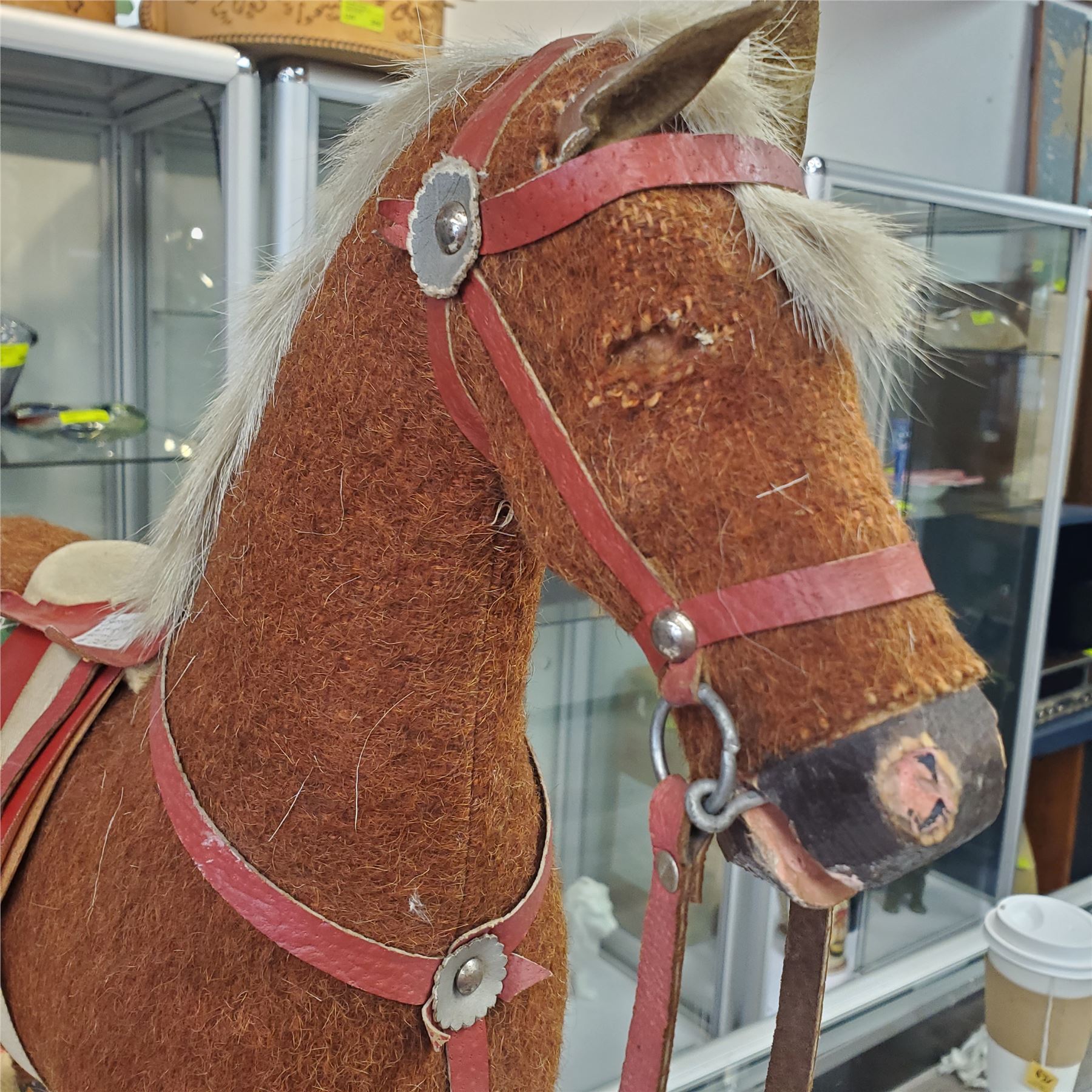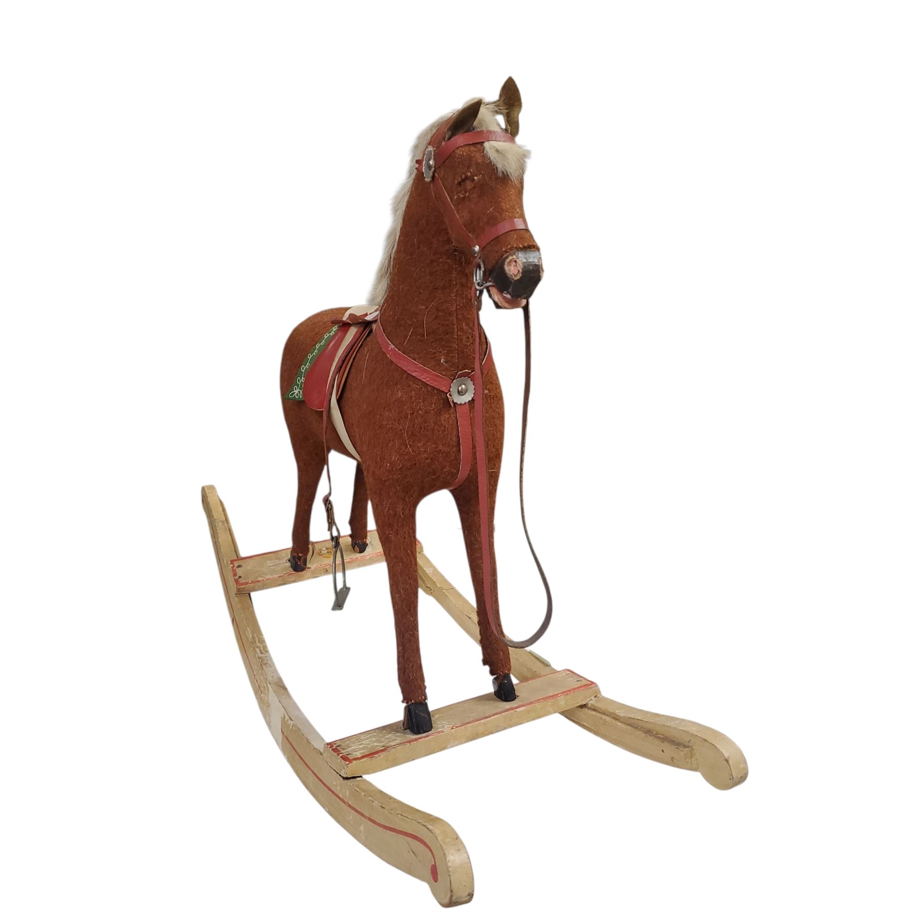 Vintage bow rocker style rocking horse, 25 inches tall. Features a convertible design with a wheeled platform for pull-toy use. Constructed from a carved wooden frame covered in fabric, possibly plush or wool, with a leather or leatherette saddle and bridle. Feet need reattachment to rocker base.