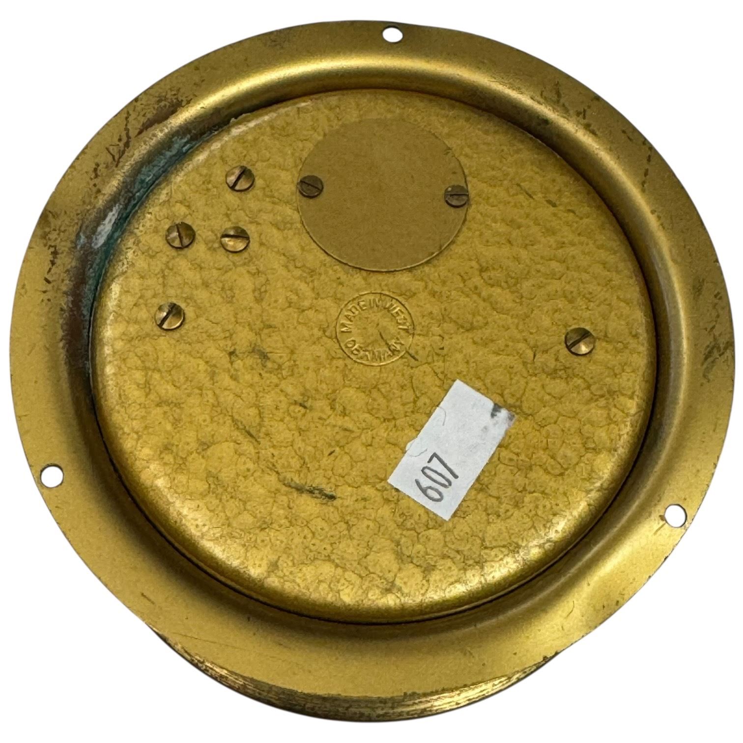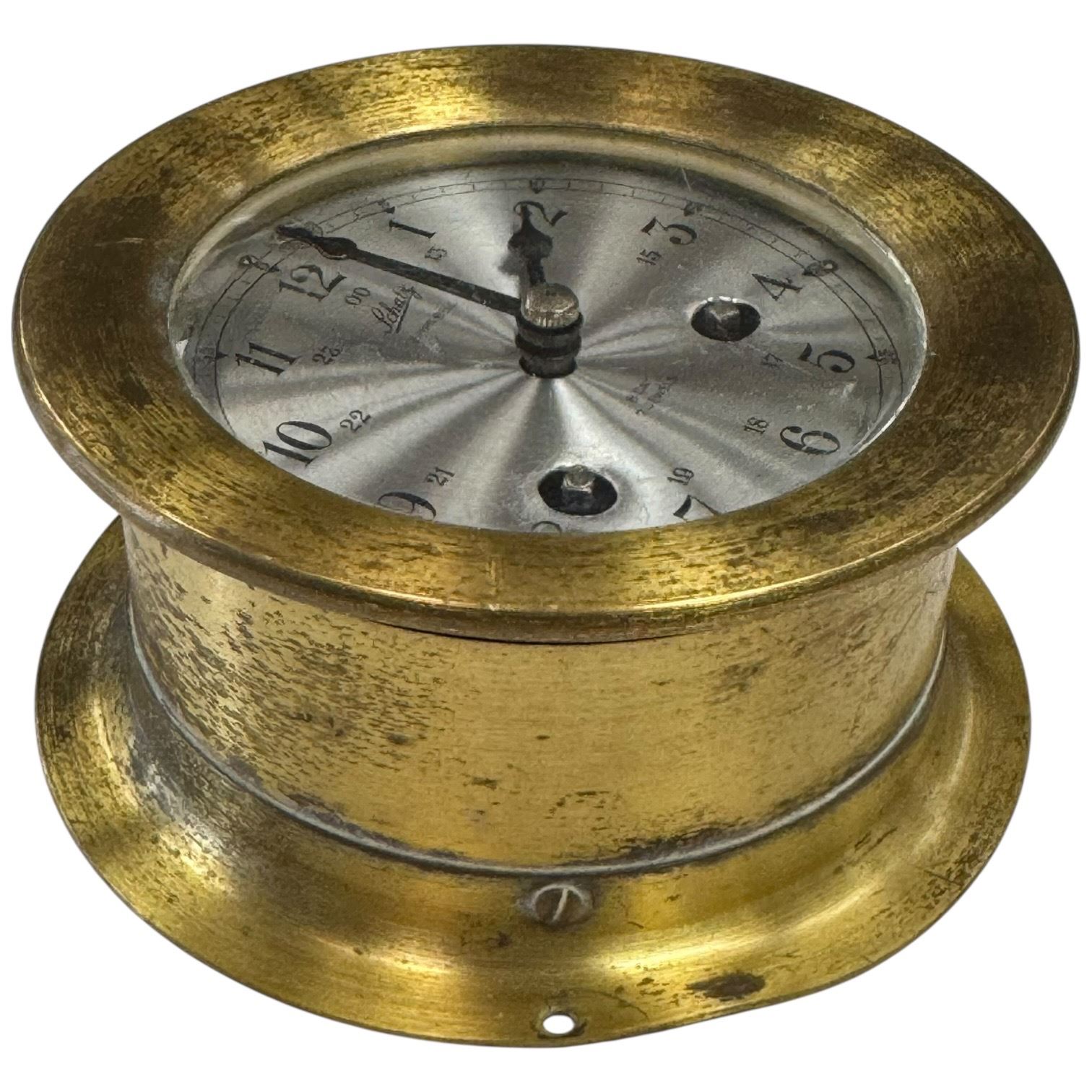 Vintage brass Schatz 'Ship's Bell' clock manufactured in West Germany. Features an 8-day movement with 7 jewels. Measures 4.25-Inch in diameter. Designed for maritime use with traditional ship's bell striking mechanism. Item is as pictured.