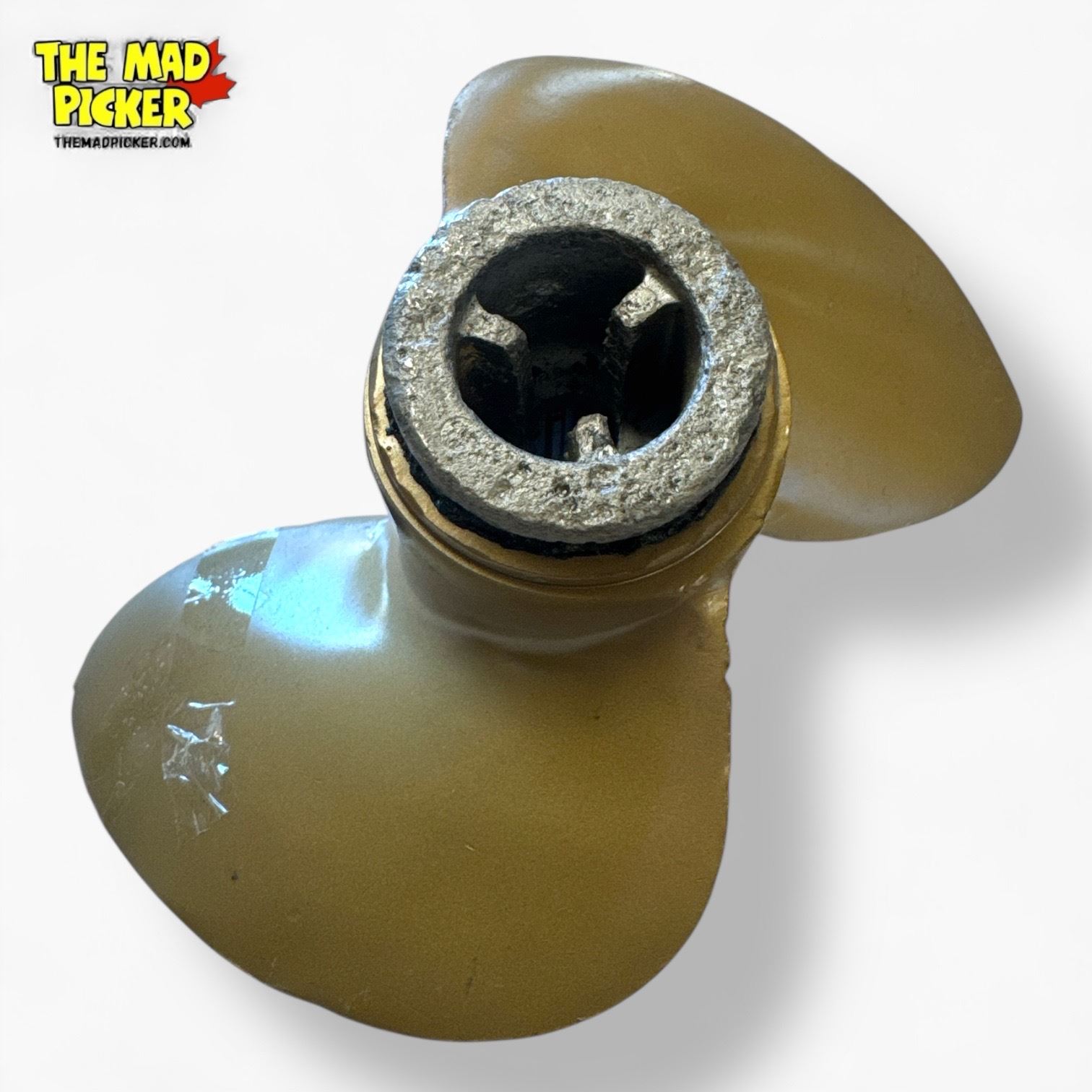 Vintage two-blade boat propeller made of brass, marked 'Quick Silver 20'. Dates to the 1920s and measures approximately 9 inches in length. Functional and collectible maritime item from the early 20th century.