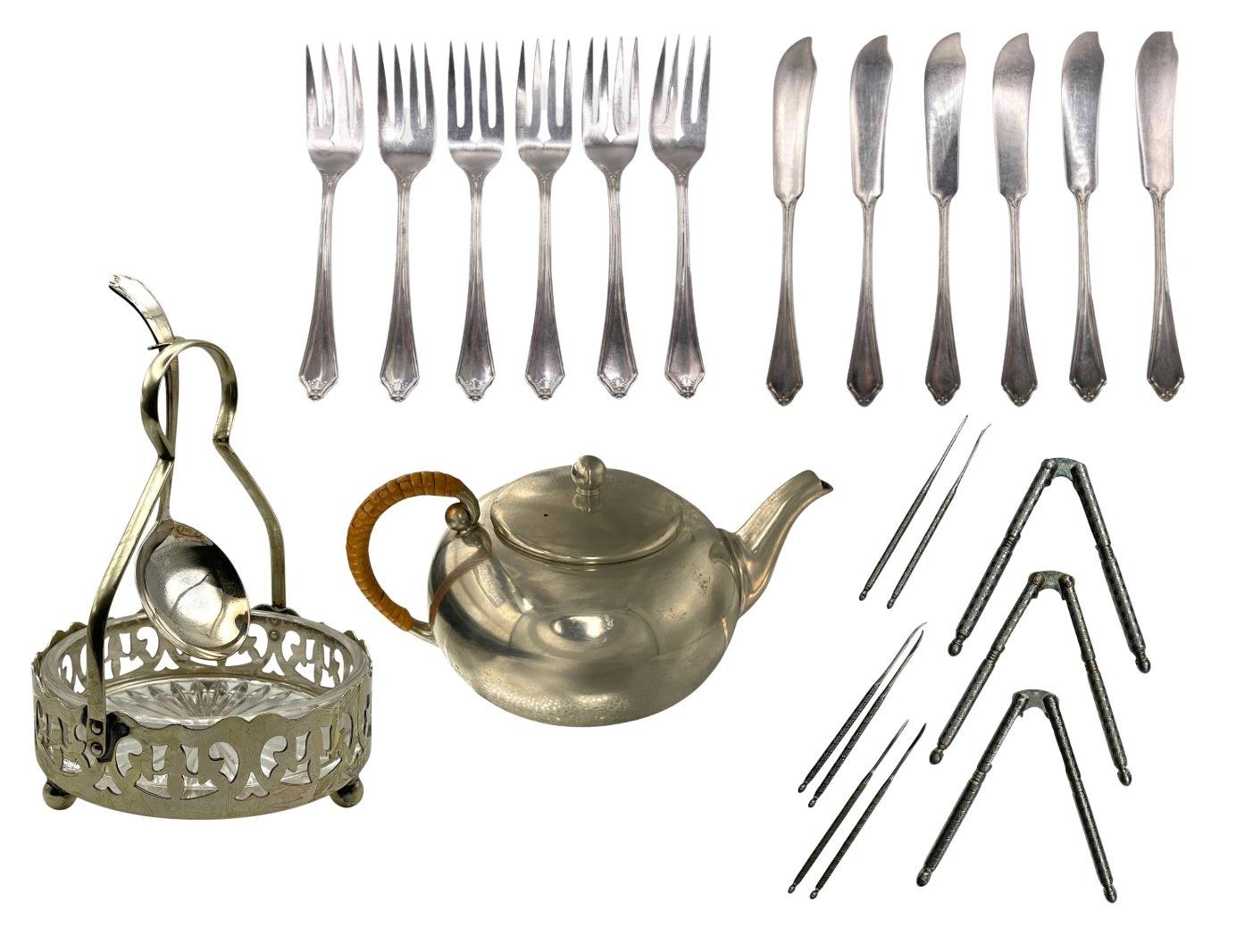 Vintage British Anur Plate with Glass Insert, 12-Piece McGlashan & Clarke Cutlery Set, H.M. Quackenbush Nut & Seafood Cracker Set