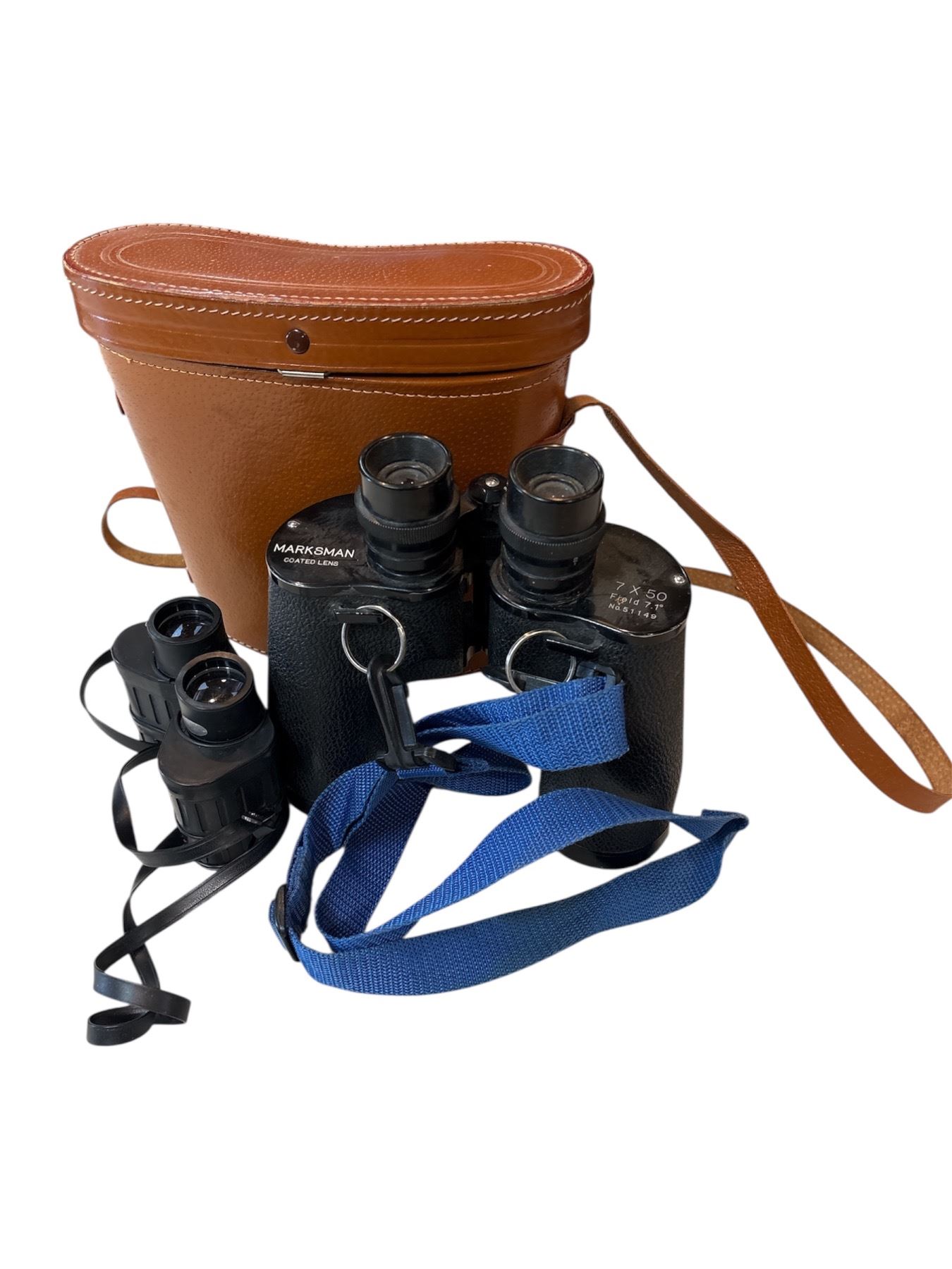 Lot includes vintage Bushnell Ensign 7x25 Field Binoculars and Marksman 7x50 Binoculars. Bushnell model features a 7x magnification and 25mm objective lens, while the Marksman offers 7x magnification with a 50mm objective lens. Both items are as pictured.
