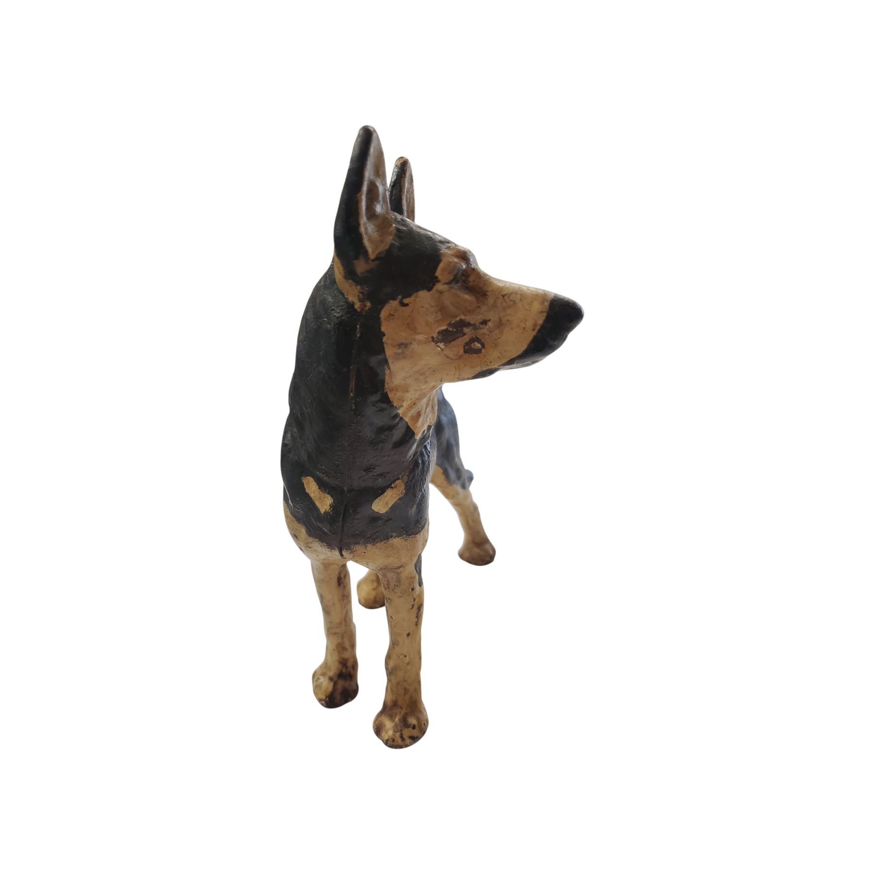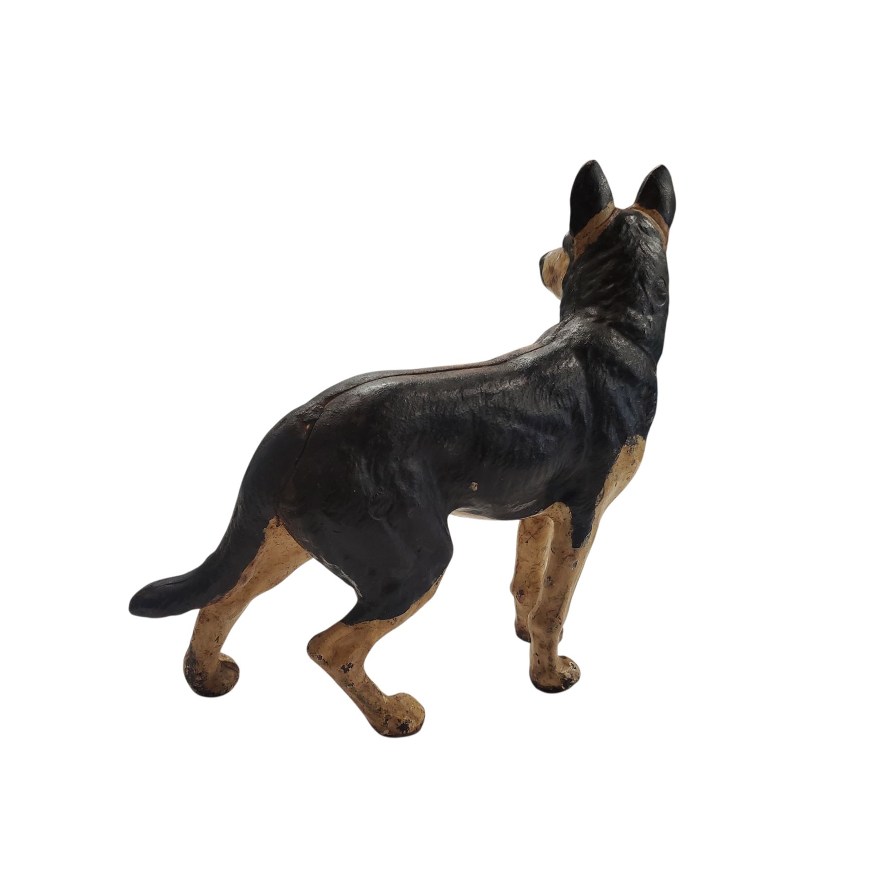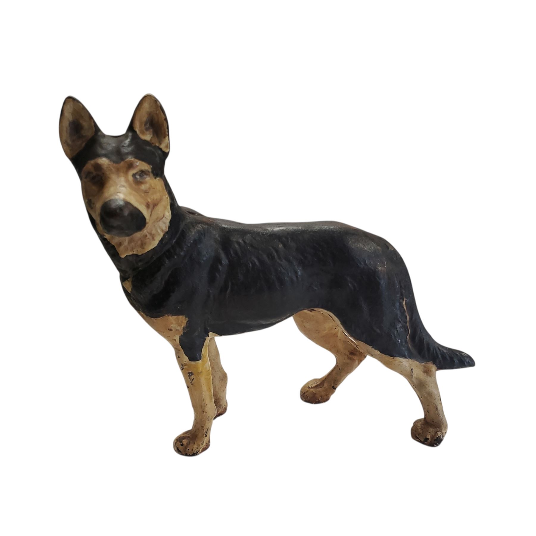 Cast iron figurine of German Shepherd Alsatian dog, standing 9.25 inches tall. Likely 20th-century production with intricate detailing. Features a solid cast design, unpainted finish, and naturalistic canine posture. Popular as a decorative piece or paperweight.
