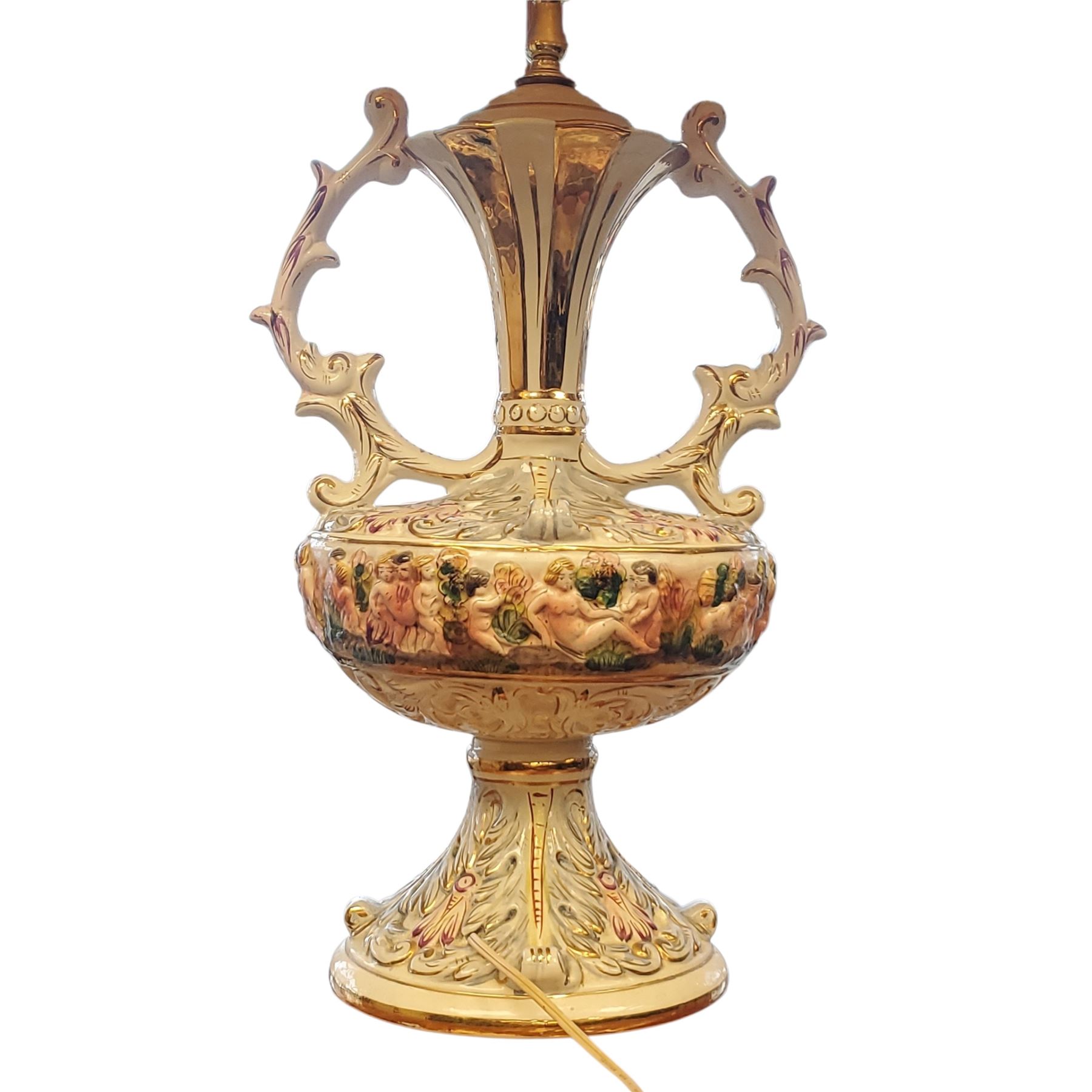Vintage ceramic lamp in Capodimonte style featuring intricate detailing and a tassled fabric shade. Dates to the mid 20th century. Measures 40-Inch in height. Decorative and functional piece showcasing the ornate design typical of Capodimonte-inspired craftsmanship. Item is as pictured.