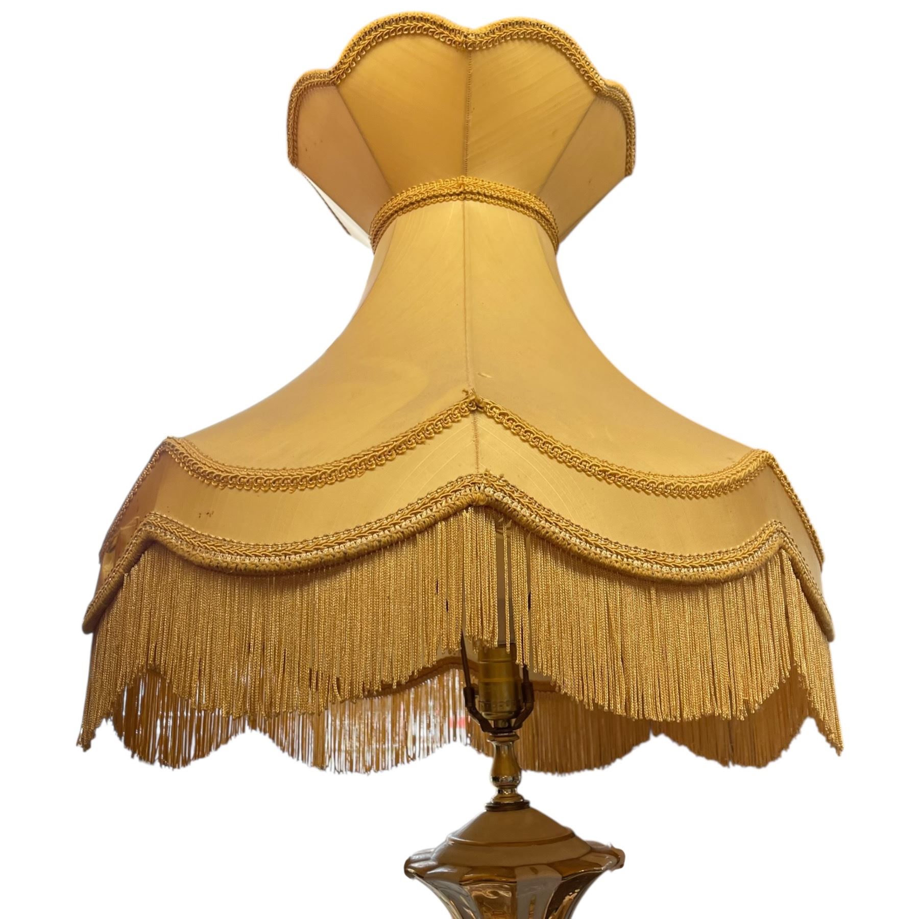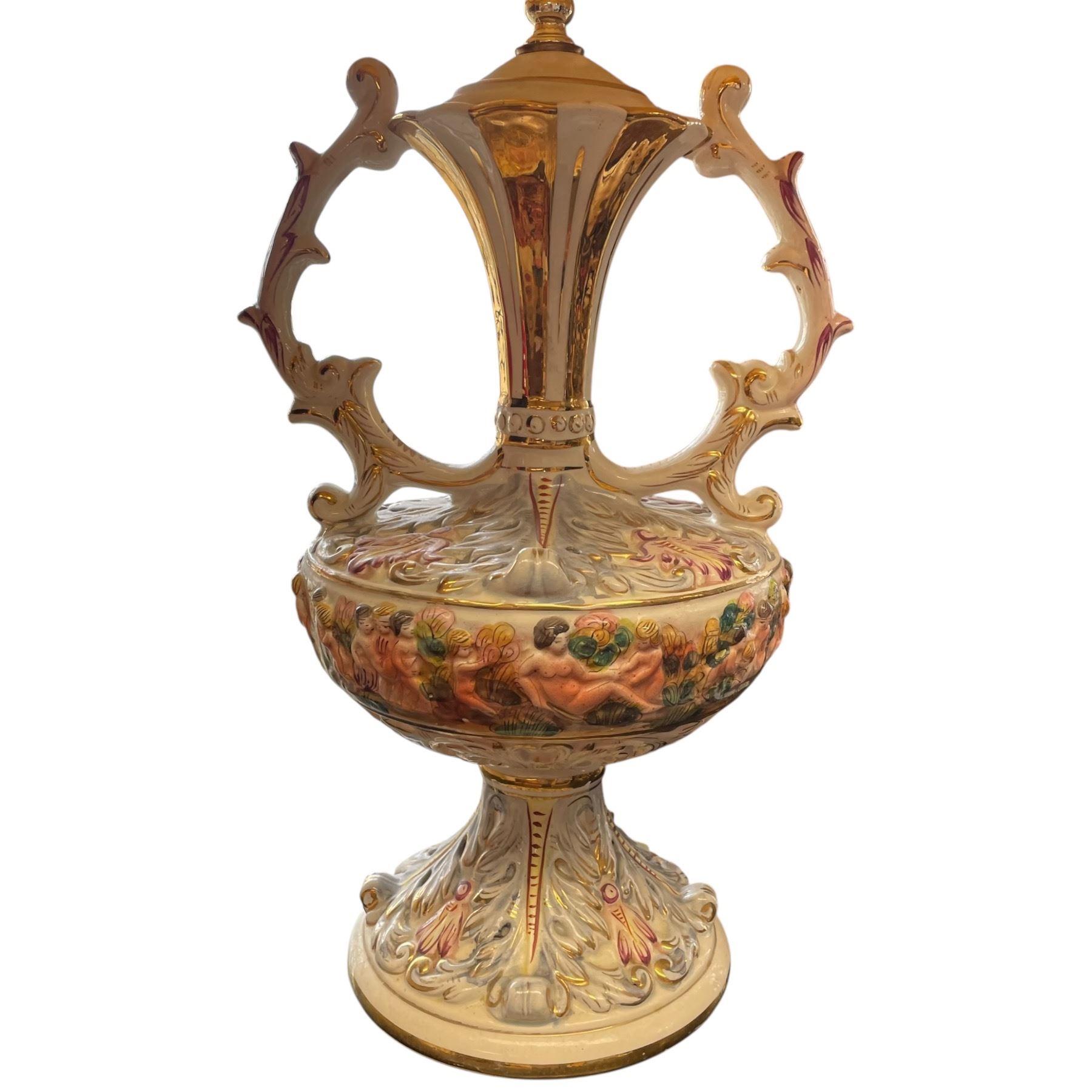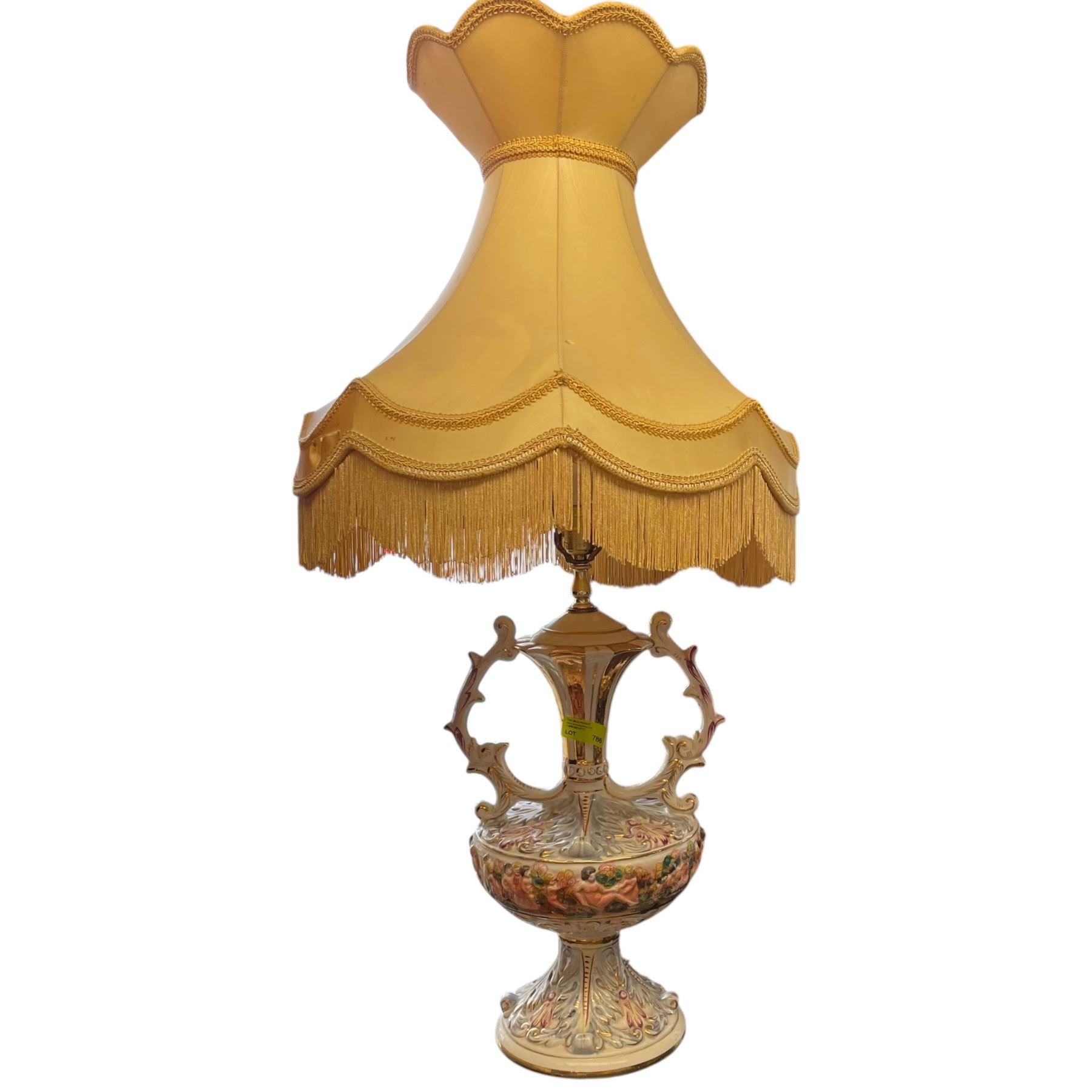 Vintage ceramic lamp in Capodimonte style featuring intricate detailing and a tasseled fabric shade. Dates to the mid 20th century. Measures 40-Inch in height. Decorative and functional piece showcasing the ornate design typical of Capodimonte-inspired craftsmanship. Item is as pictured.