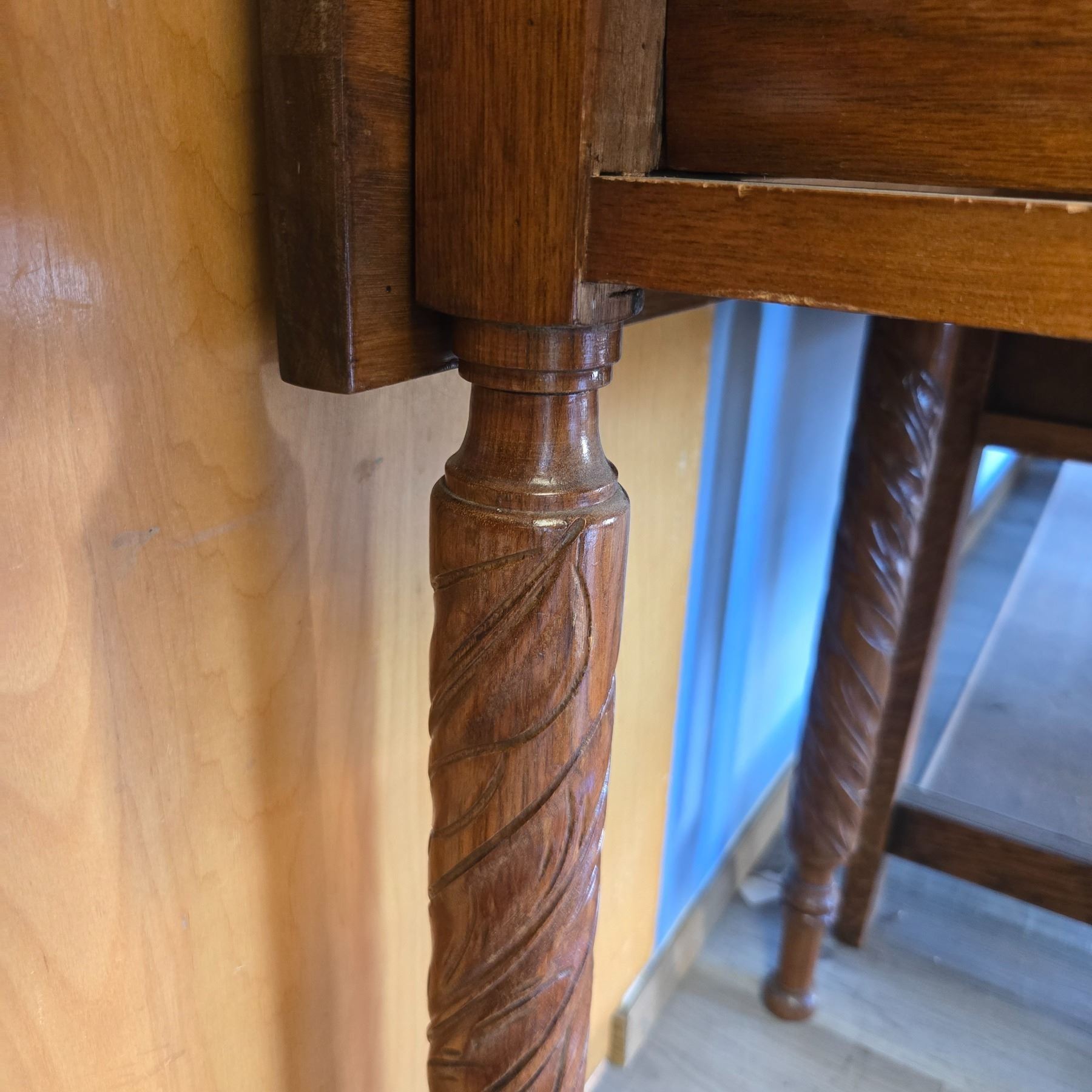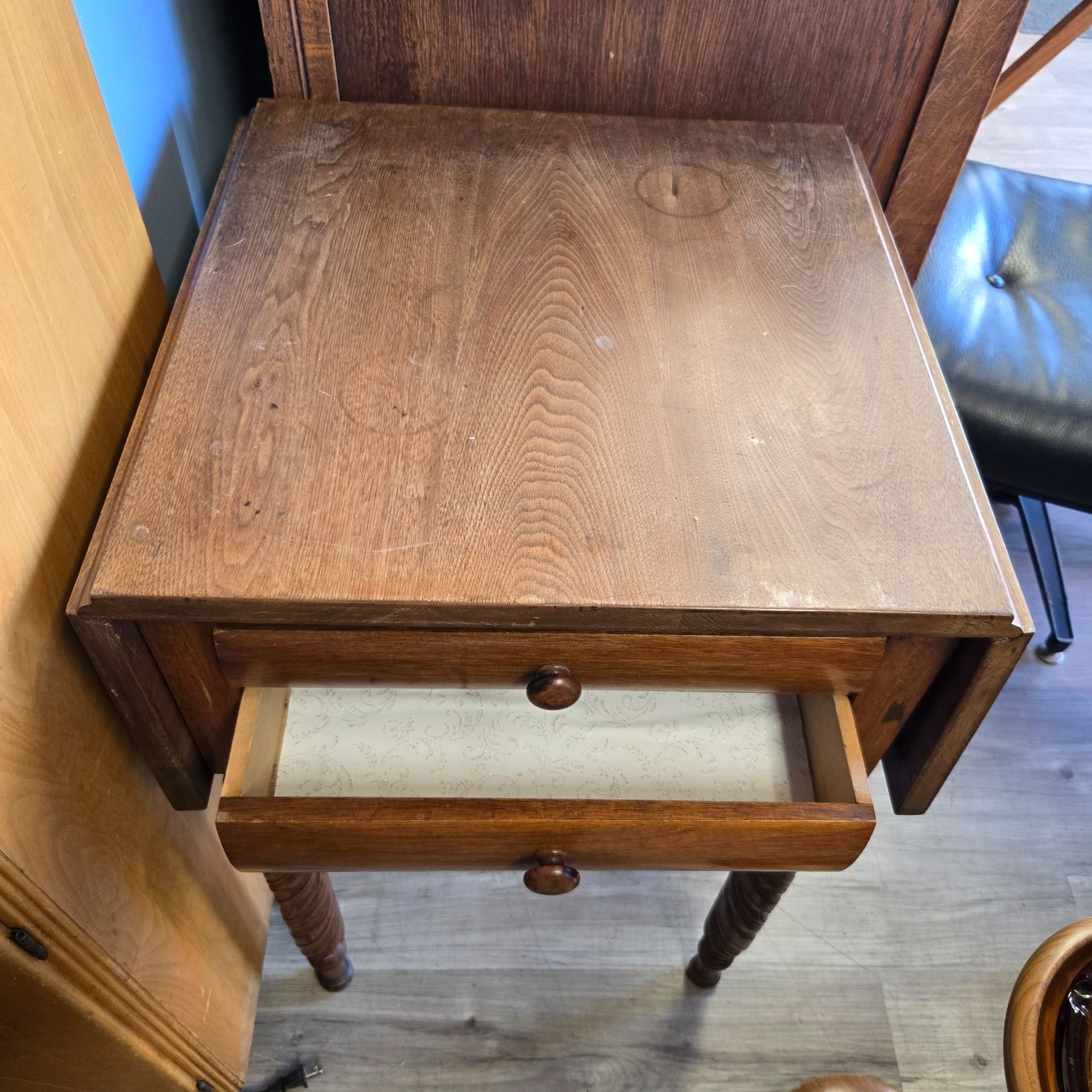 Vintage cherry wood drop leaf table measuring 18x18x29-Inch, expanding to 35-Inch wide with the leaf open. Features rope turned style legs and two drawers that pull out from both sides for storage. Functional design and compact size provide versatility for various spaces and uses. Item is as pictured.