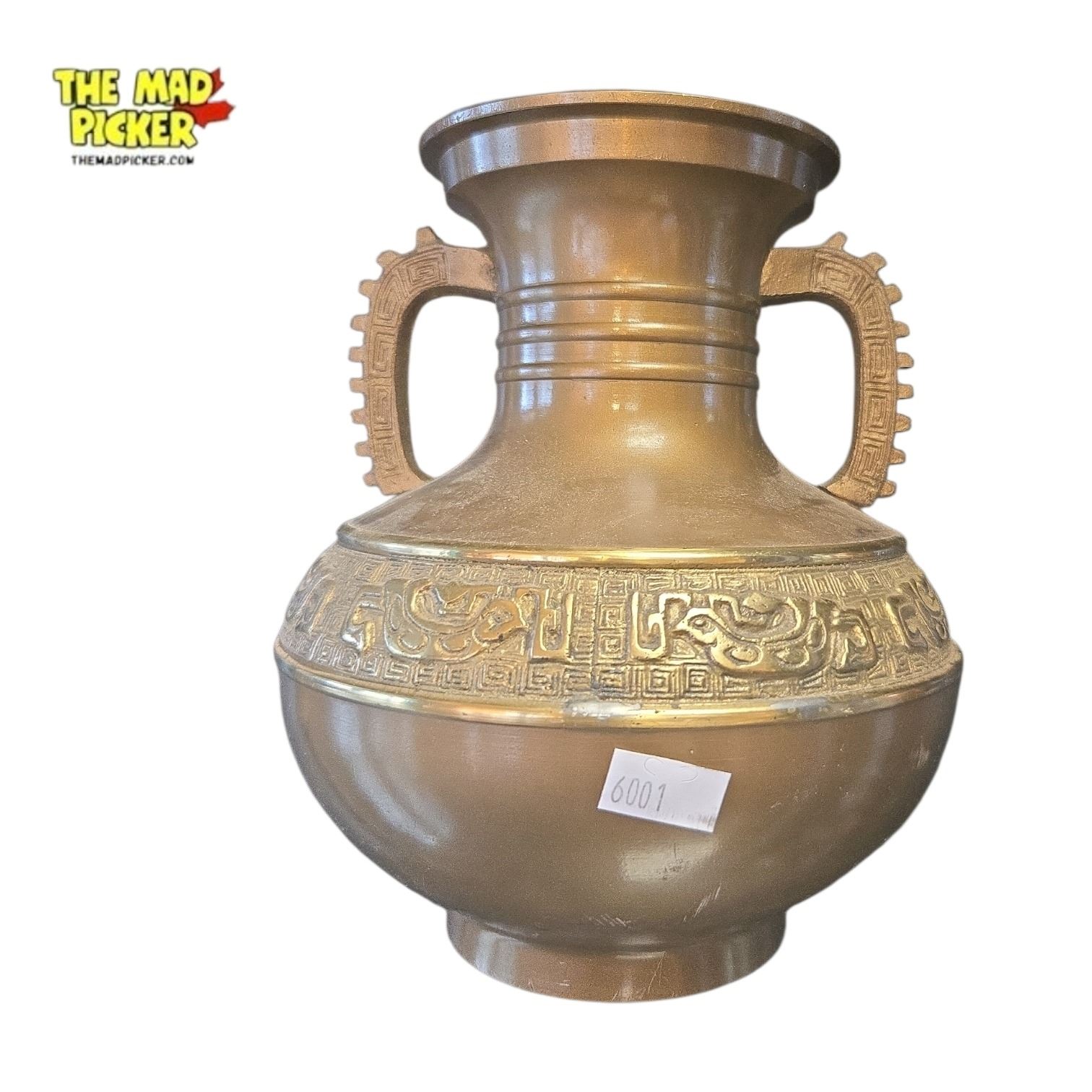 Vintage Chinese brass vase standing 7 inches tall. Features intricately detailed dragon handles and an archaic dragon motif in relief encircling the body. Traditional design elements reflect Chinese artistry, with decorative patterns and symbolic representations. Ideal as a flower urn or display piece.