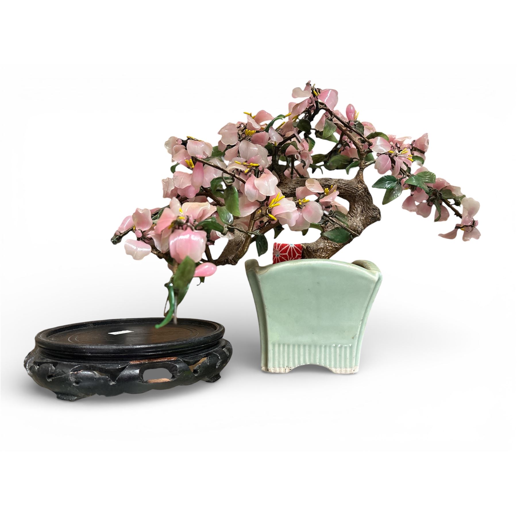 Vintage Chinese decorative piece made of jade-colored glass. Stands 10.5-Inch tall. Glass features traditional jade-like design and color emulating the aesthetic of carved jade. Item is as pictured.