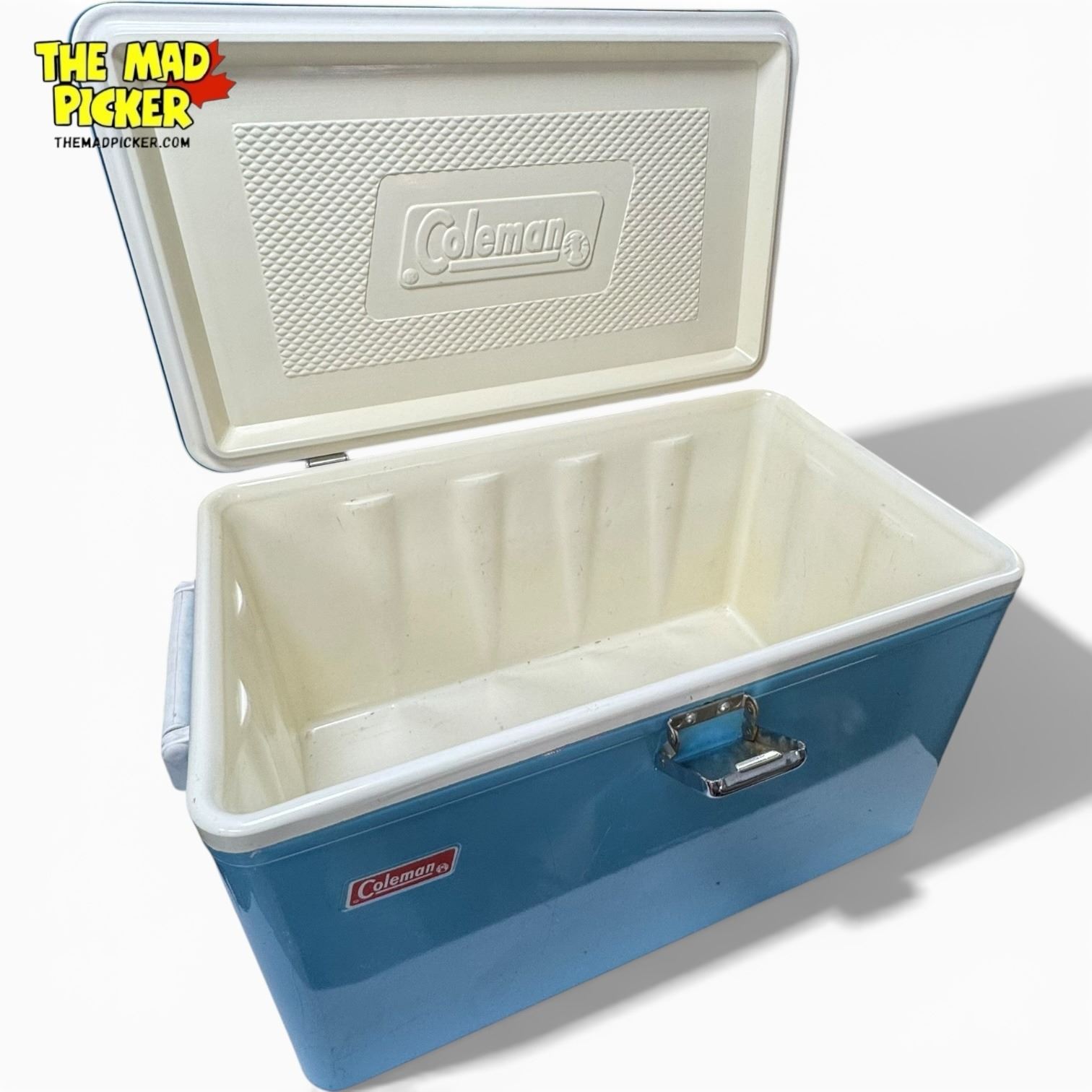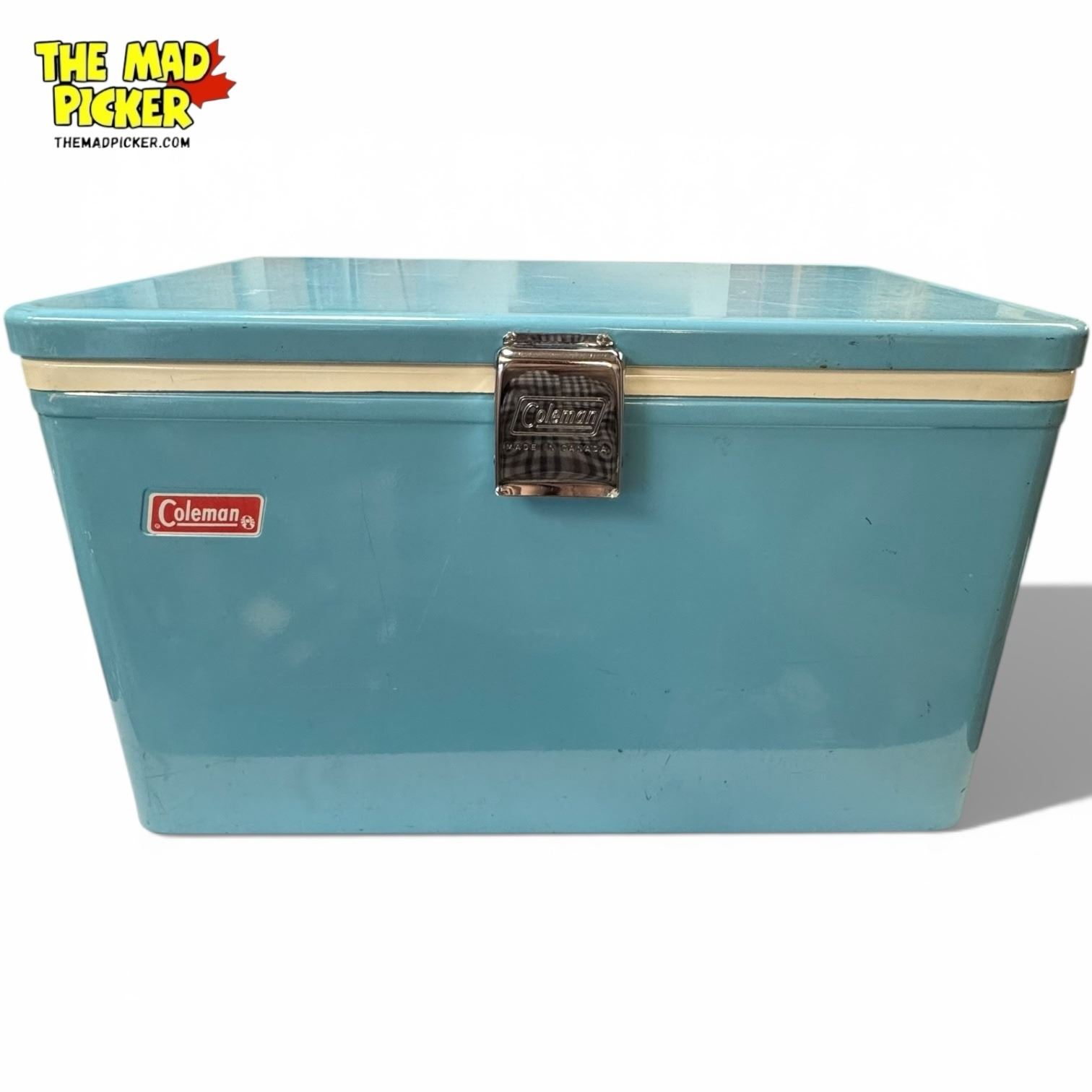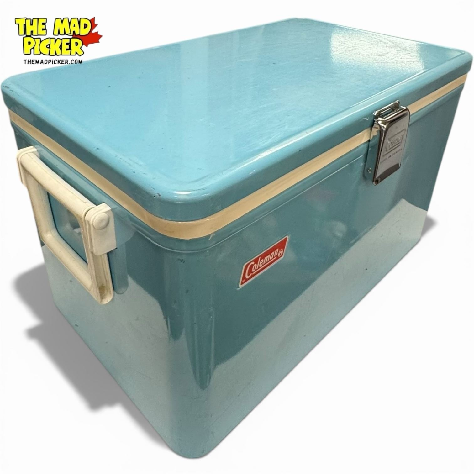 Vintage Coleman Snow-Lite metal cooler in pastel blue, commonly called 'Baby Blue' or 'Sky Blue.' Manufactured in Canada during the 1960s and 1970s. Features a built-in bottle opener latch, durable metal handles, and a white plastic-insulated interior. Iconic all-metal, steel-belted design.