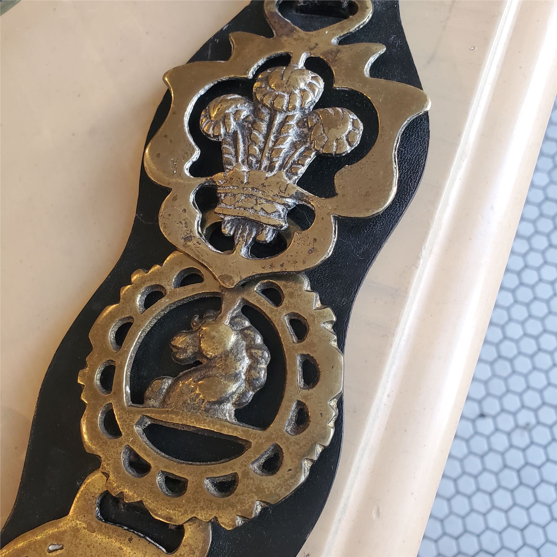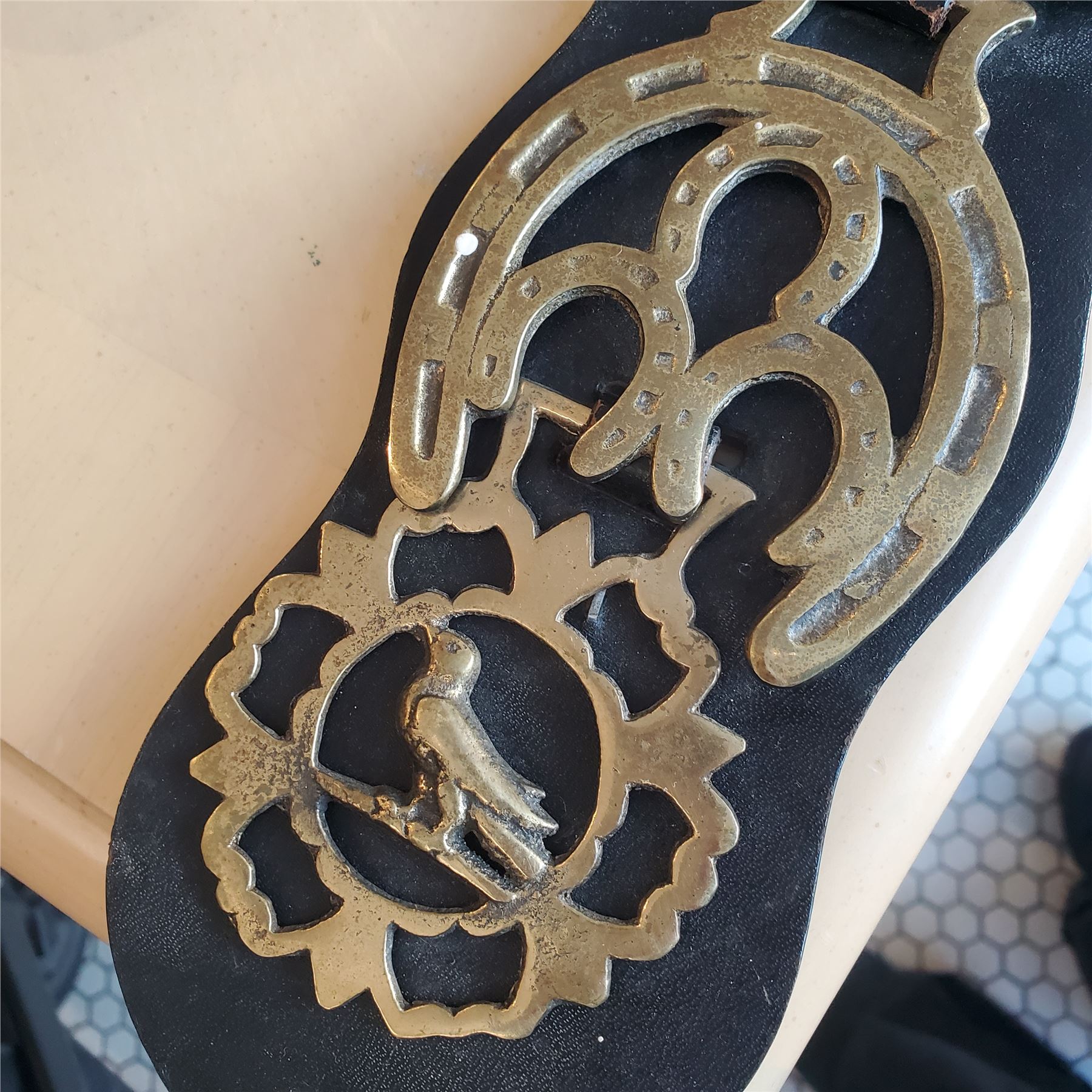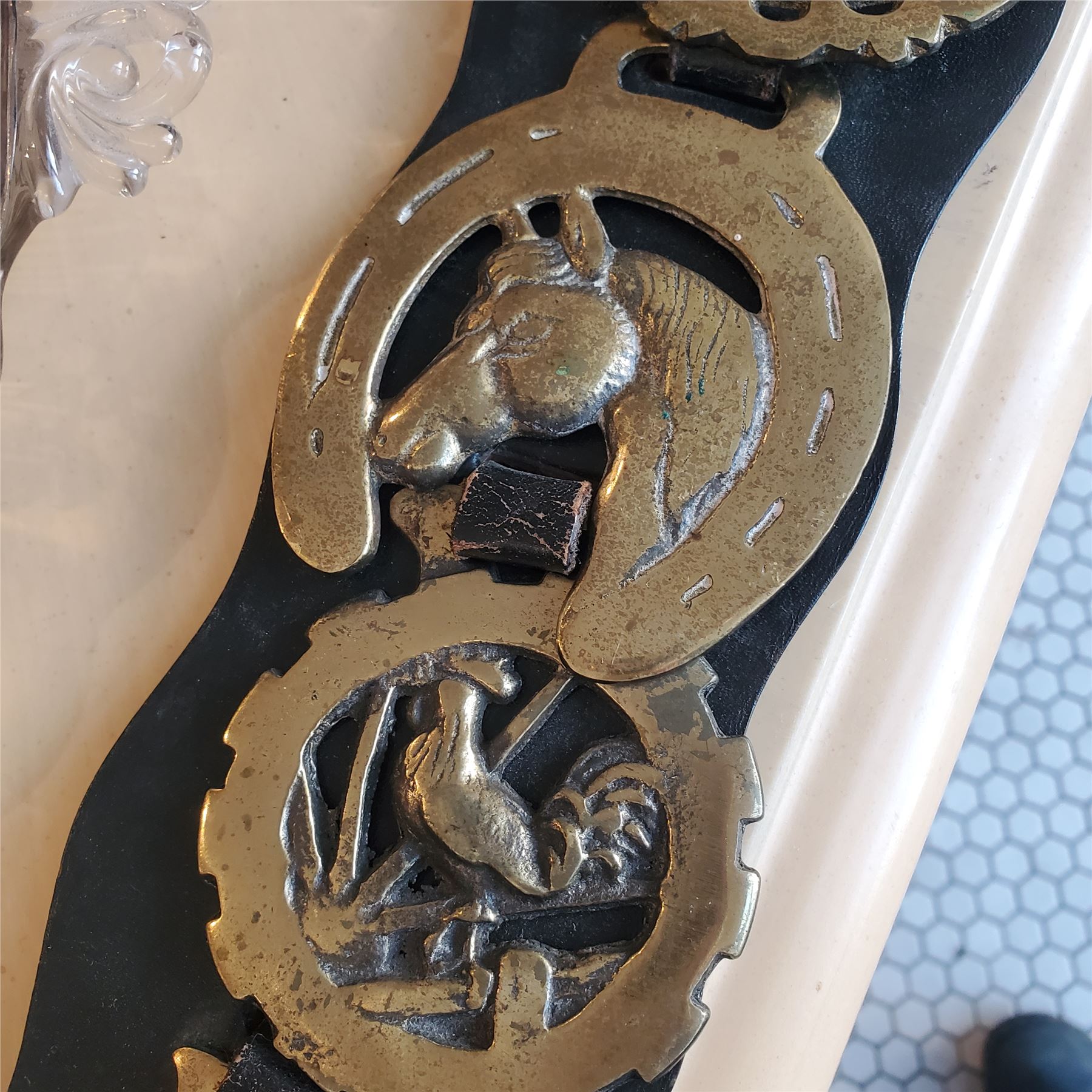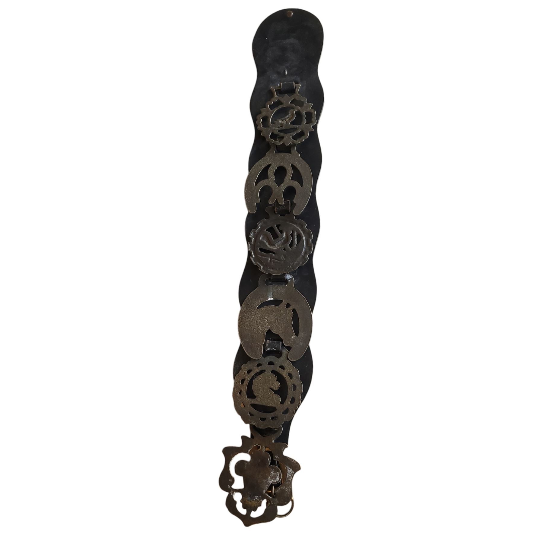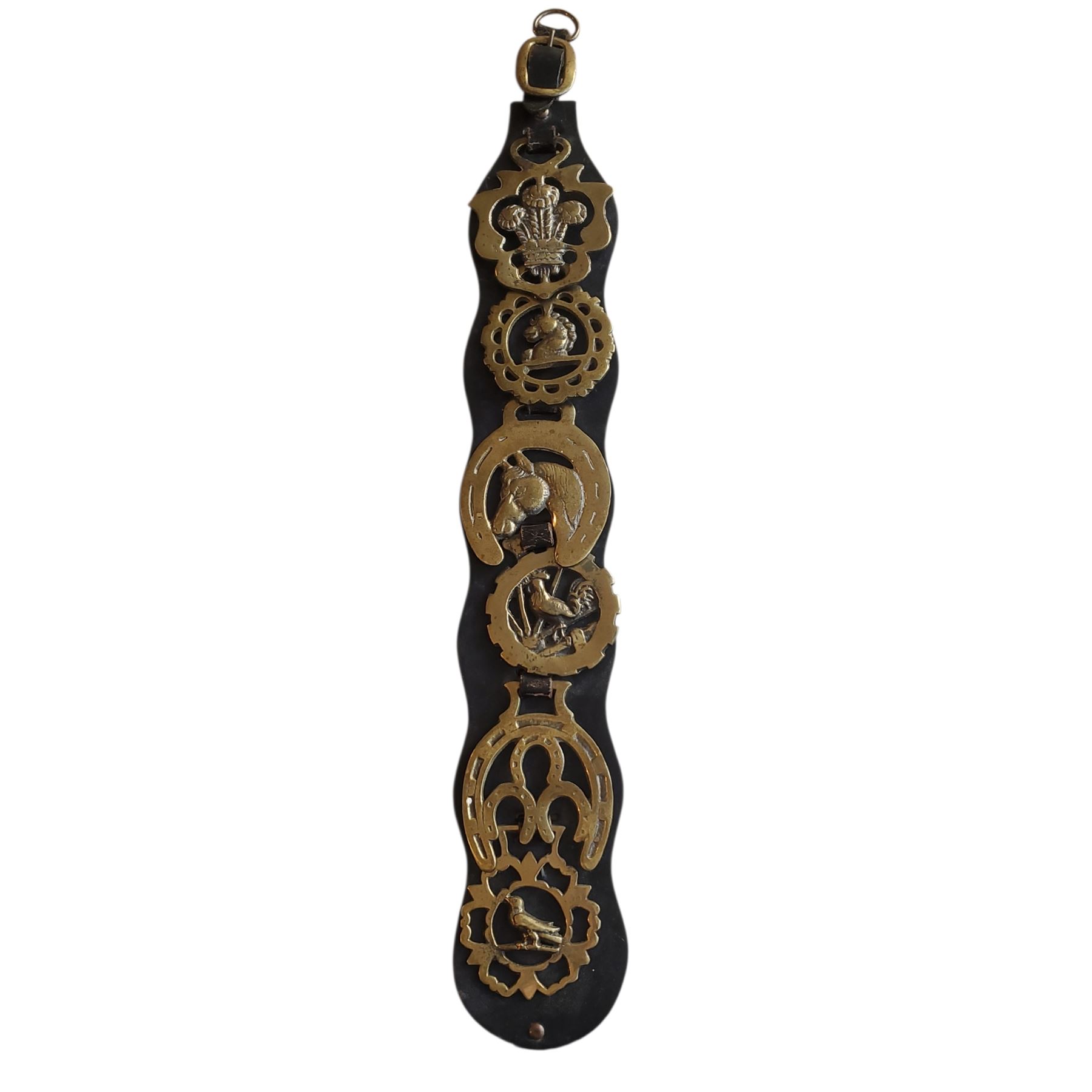 Vintage Collectible Horse Brass Badges Medallions on Leather - approx. 22" H