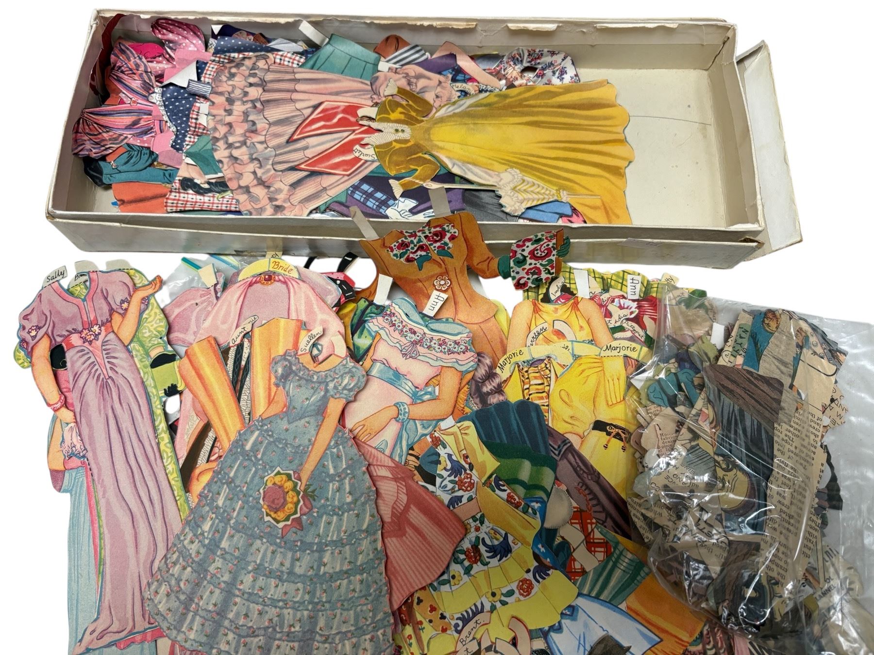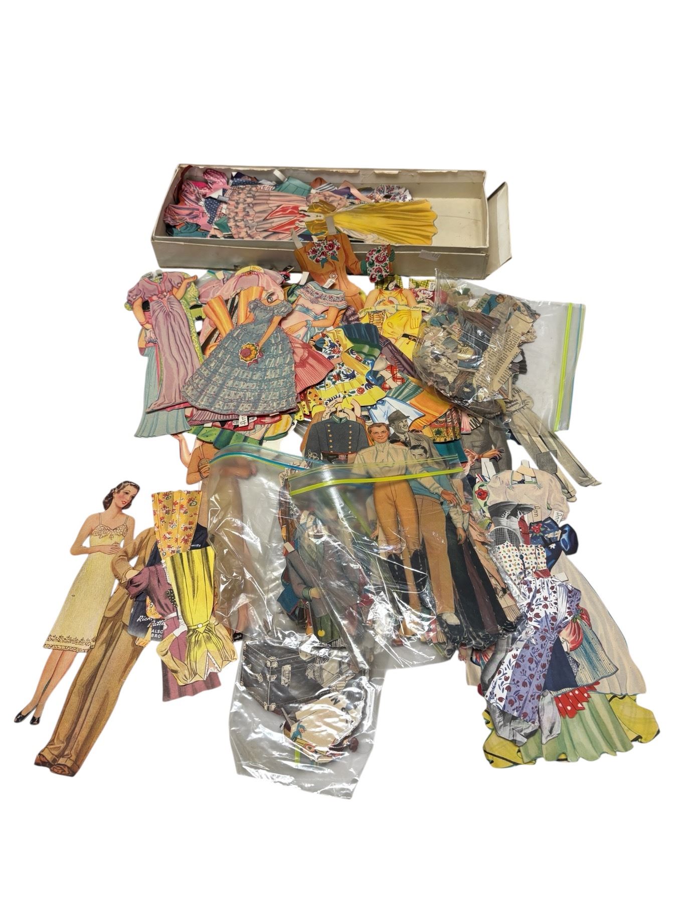 Collection of vintage paper dress-up dolls from the mid-20th century. Includes multiple doll figures with various cut-out outfits and accessories. Likely produced between the 1940s and 1960s. Popular among children of the era, these sets were designed for imaginative play and dress-up activities.