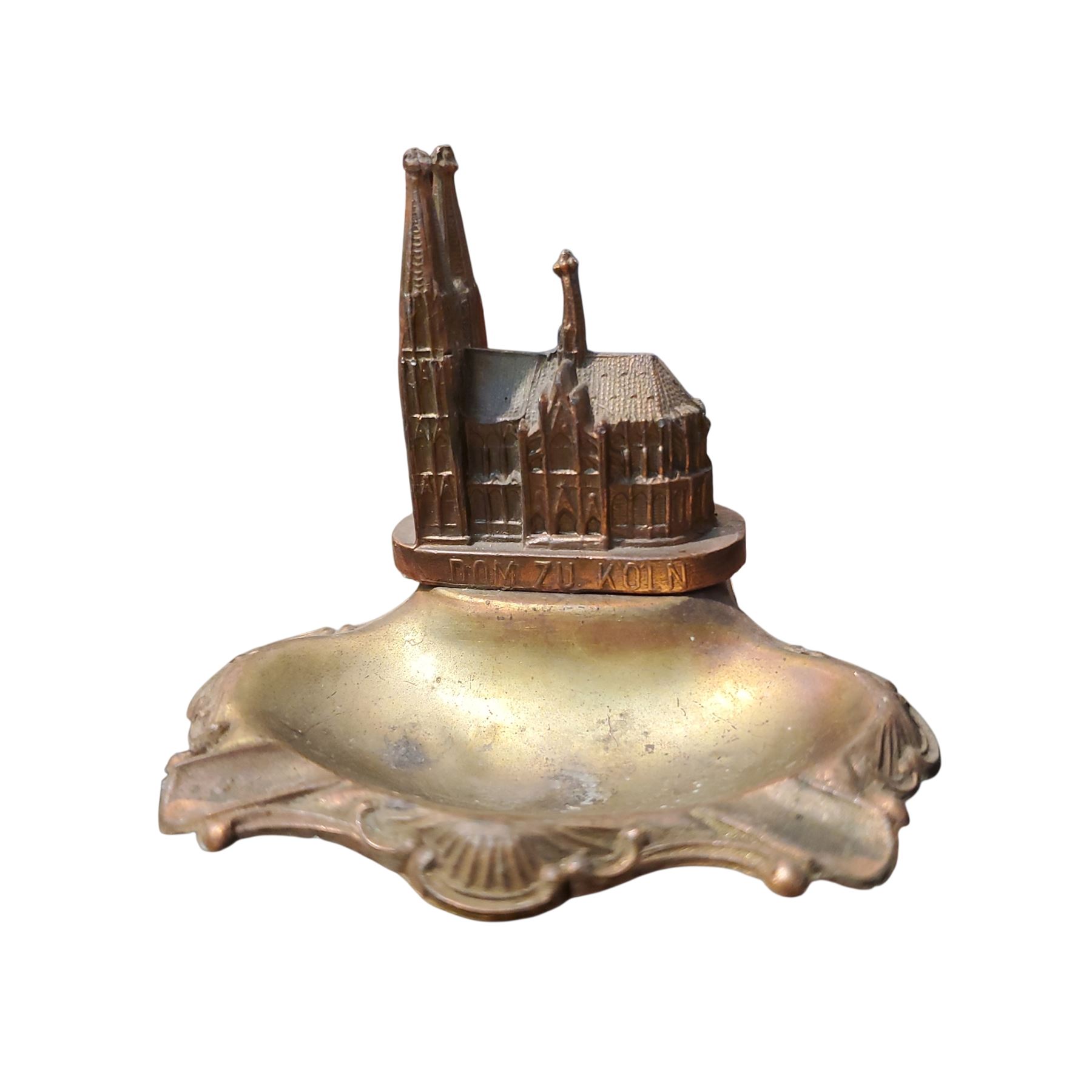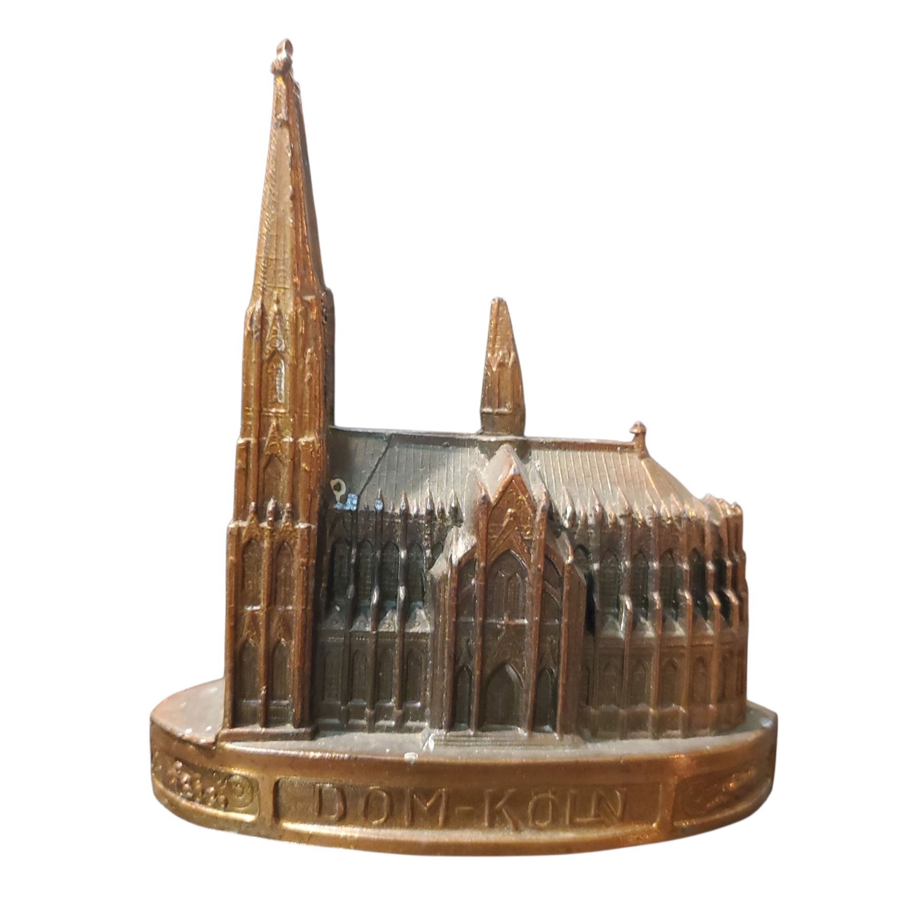 Set of vintage metal souvenir replicas of the Cologne Cathedral (Dom zu K�ln), Germany. Includes a decorative ashtray with the cathedral on a scalloped base, and a jewelry box with a hinged lid. Likely crafted mid-20th century from spelter or copper, finished with an antiqued bronze or copper tone. Marked 'DOM ZU K�ln'.