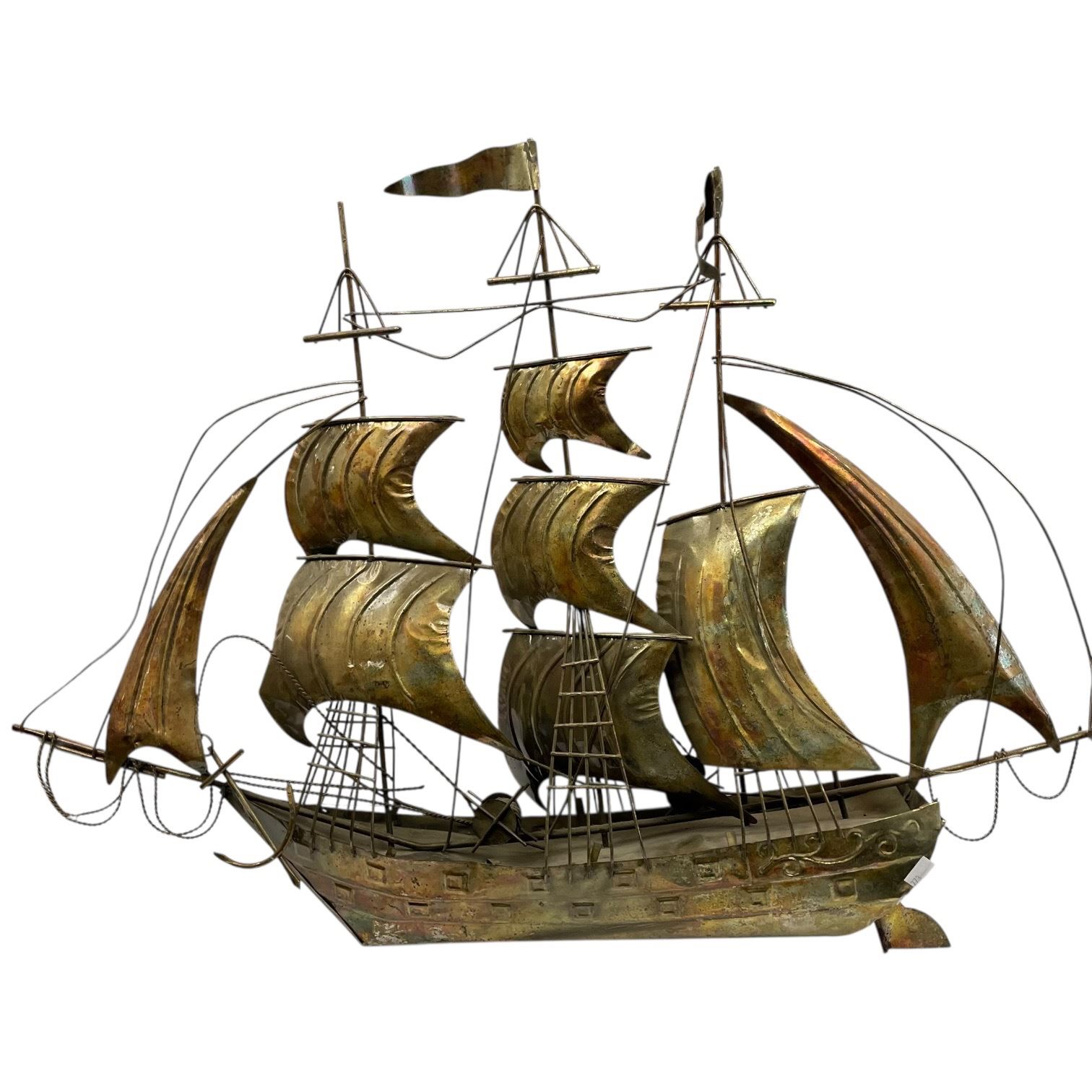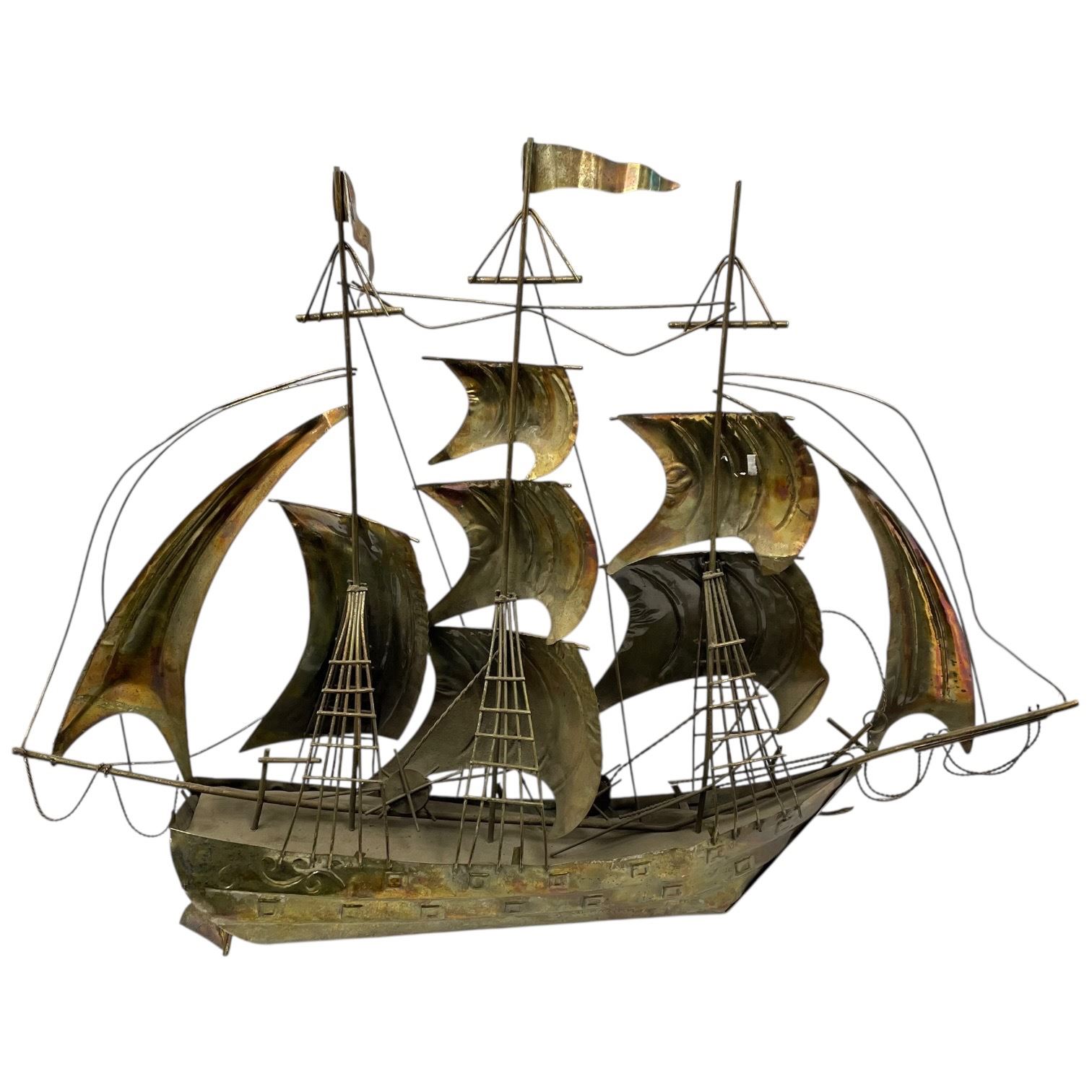 Vintage sailboat sculpture crafted in the Brutalist style, attributed to the style of Curtis Jeré. Made from copper with rugged hand-wrought textures, intricate rigging, and a weathered patina. Suitable as wall art or tabletop sculpture. Measures 29-Inch in length and 22-Inch in height. Item is as pictured.