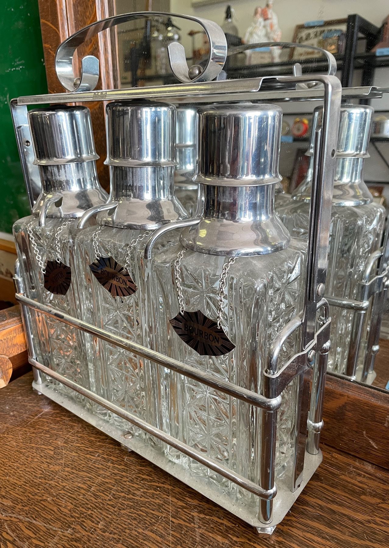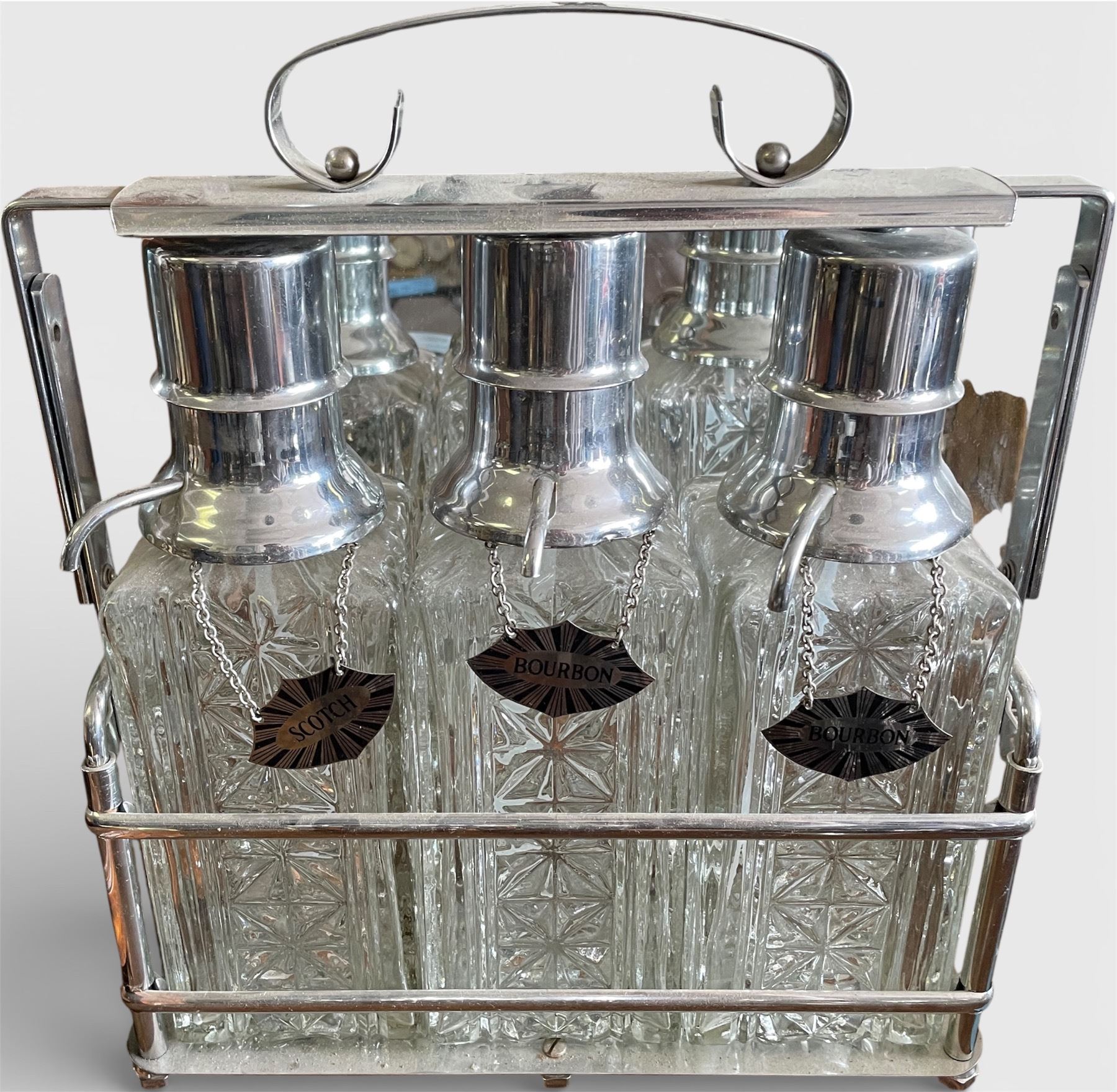 Vintage Cut Glass Decanter Set with Chrome Rack (Scotch & Bourbon)