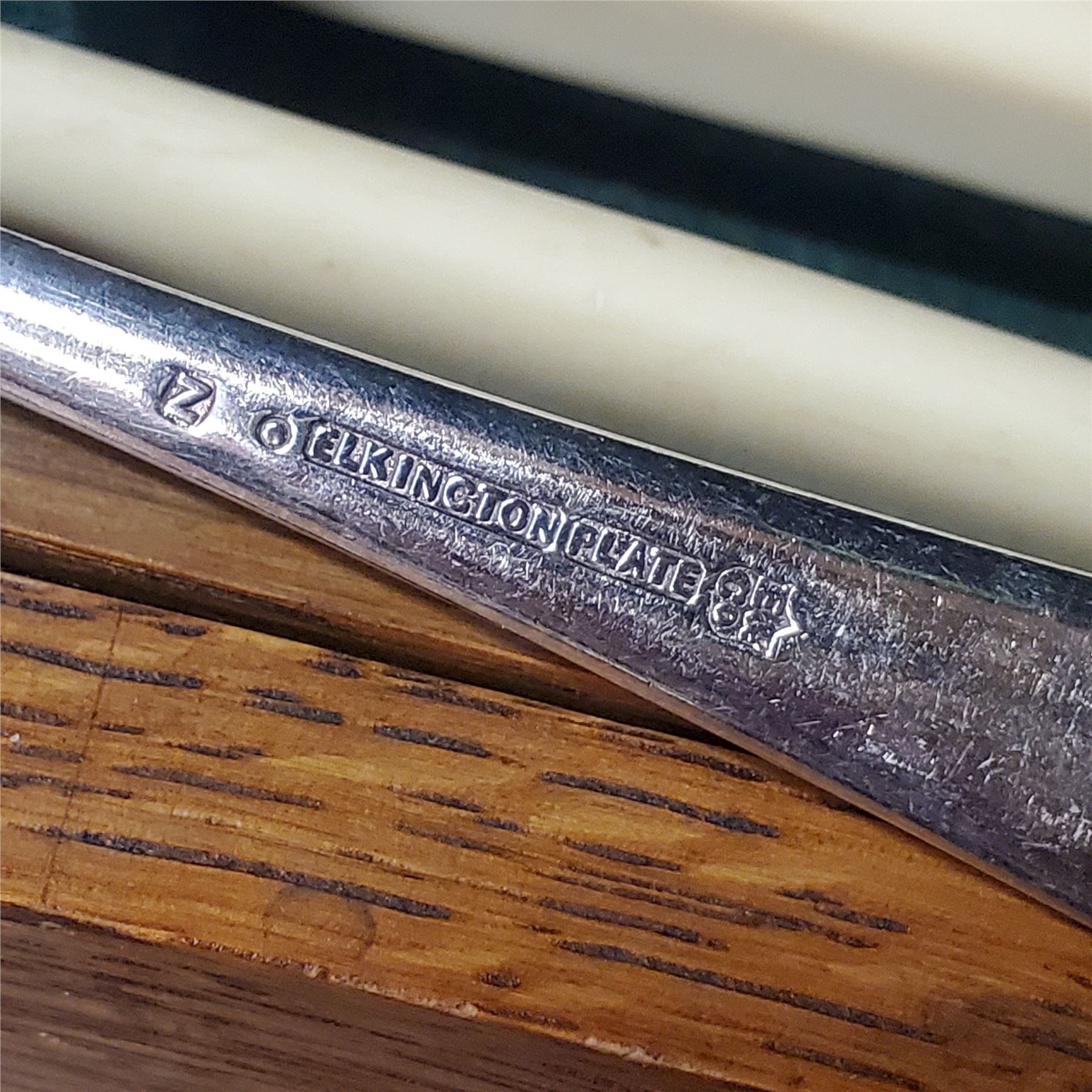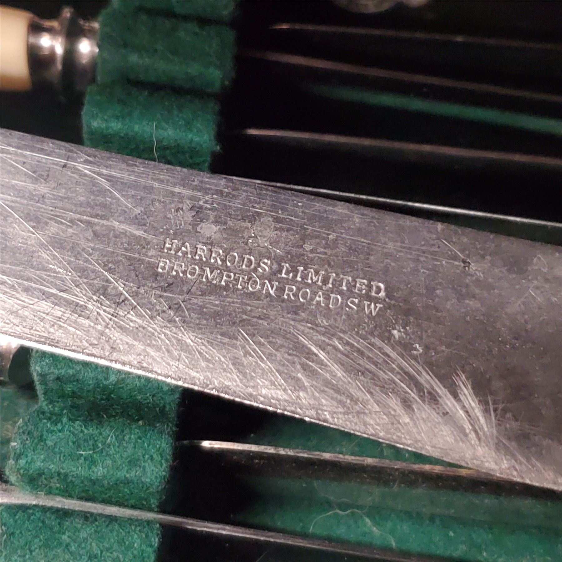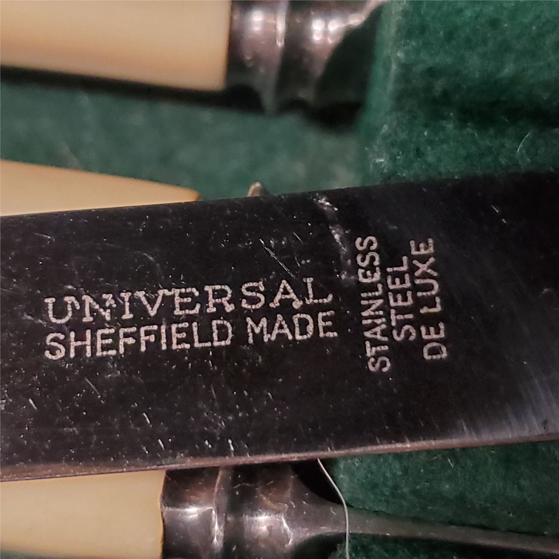 Vintage cutlery canteen by Harrods Limited, featuring cream-handled utensils plated by Elkington in Sheffield. Manufactured under the Universal Sheffield name. Includes original wooden storage box. Elegant design suitable for formal dining.